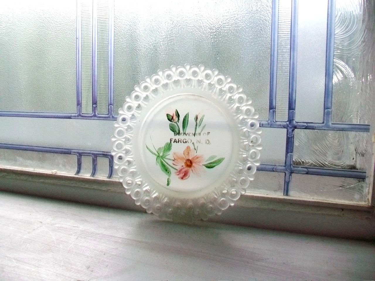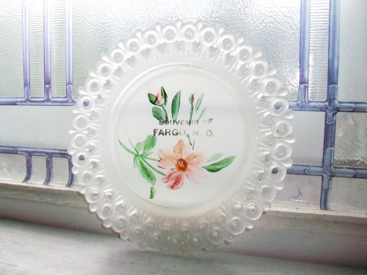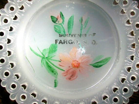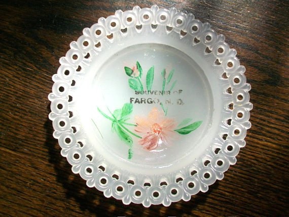 Vintage 1910s souvenir of Fargo, North Dakota, small pressed glass plate or pin tray dish, featuring a floral design and pierced edge, in very good condition. It measures 5 1/2" in diameter. Enjoy!