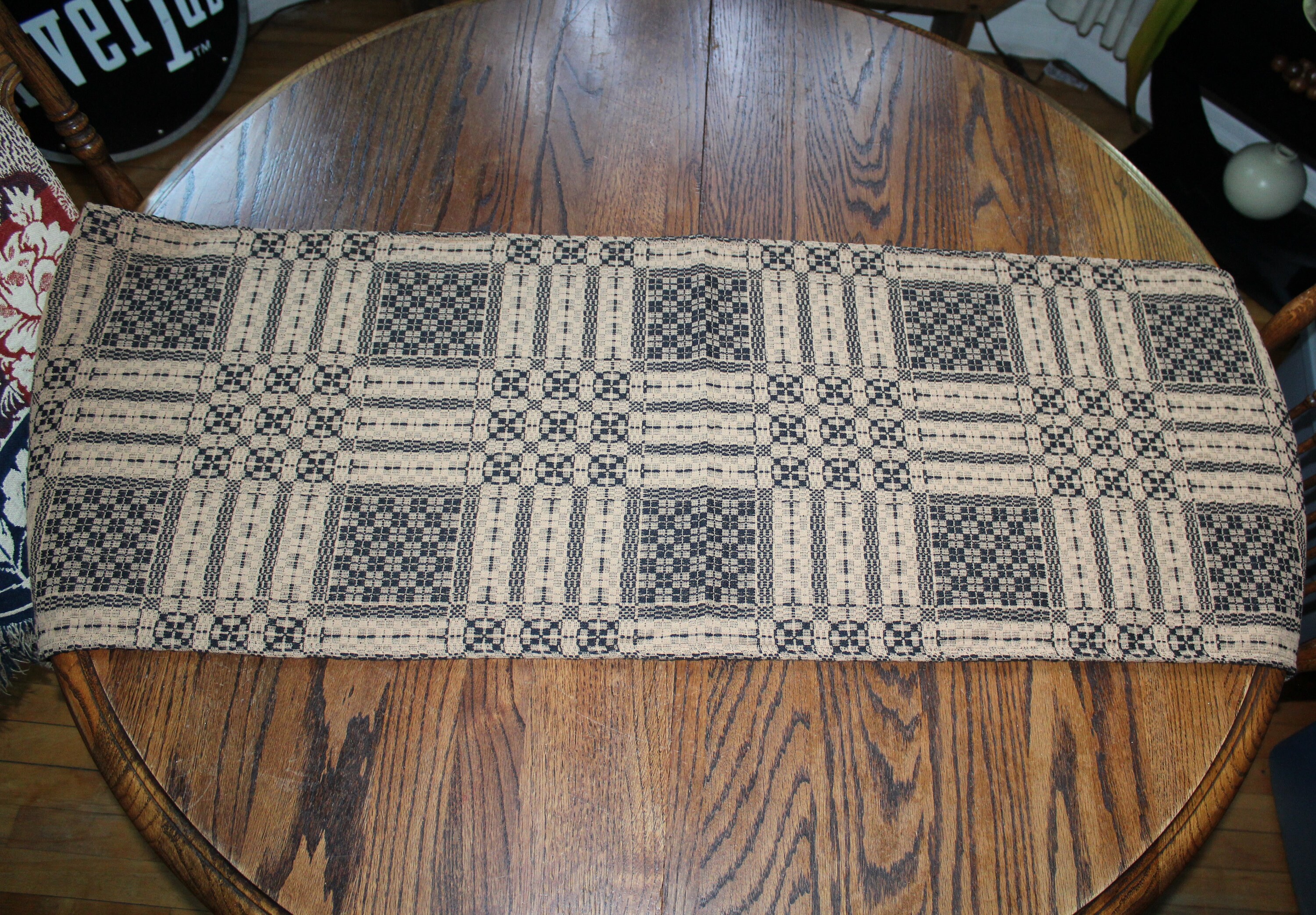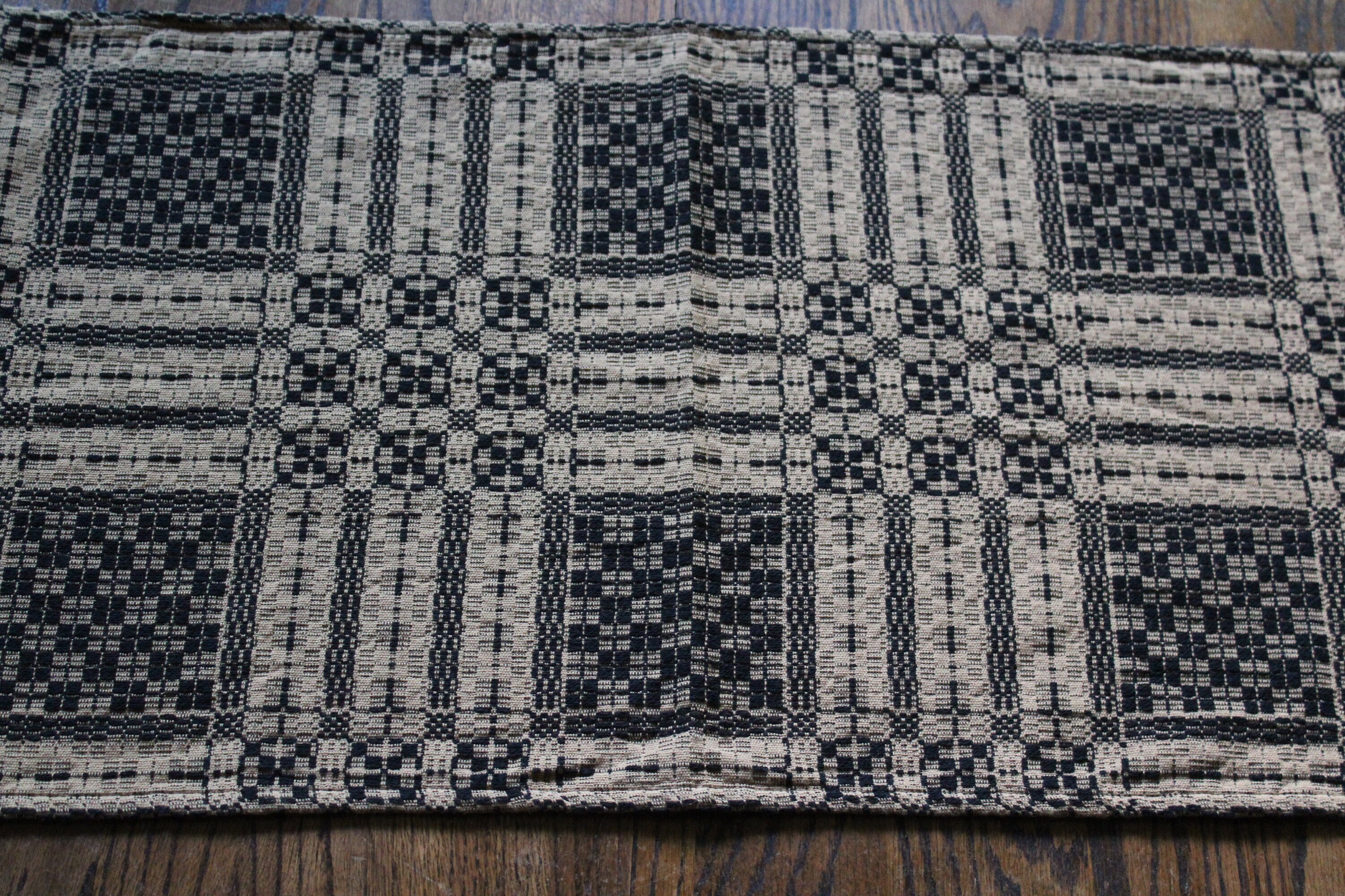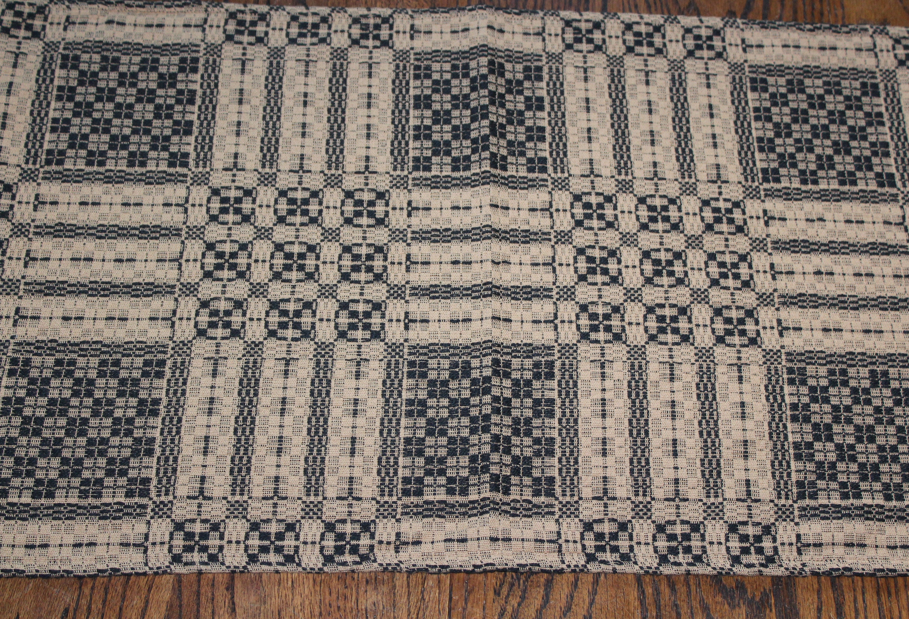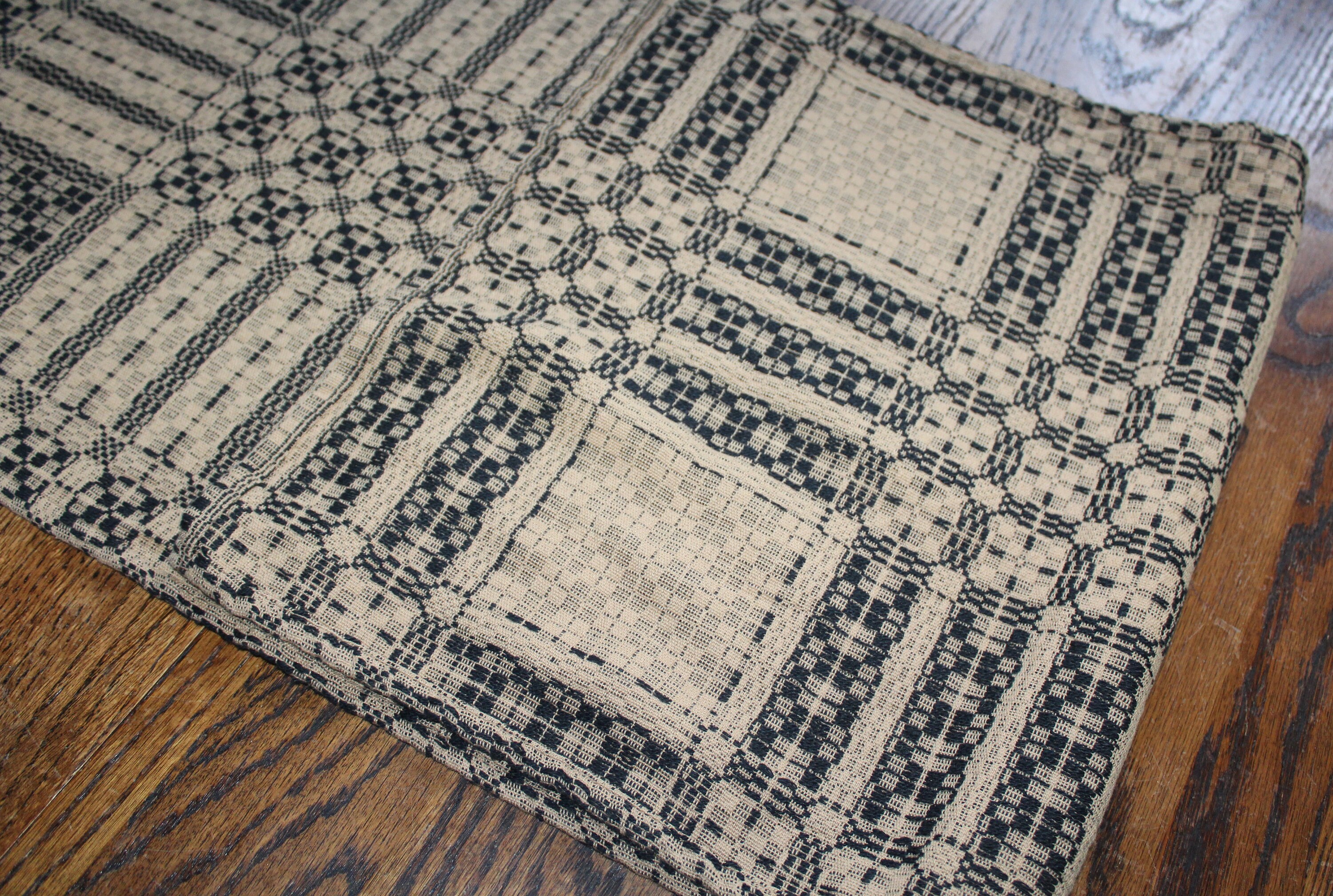 This is a beautiful antique mid 19th century hand loomed reversible table runner in black and tan, in wonderful condition after 150 or so years of use. It measures 58" x 18". I see no notable damage. I bought it at a Scandinavian farm estate sale in Minnesota. Enjoy!