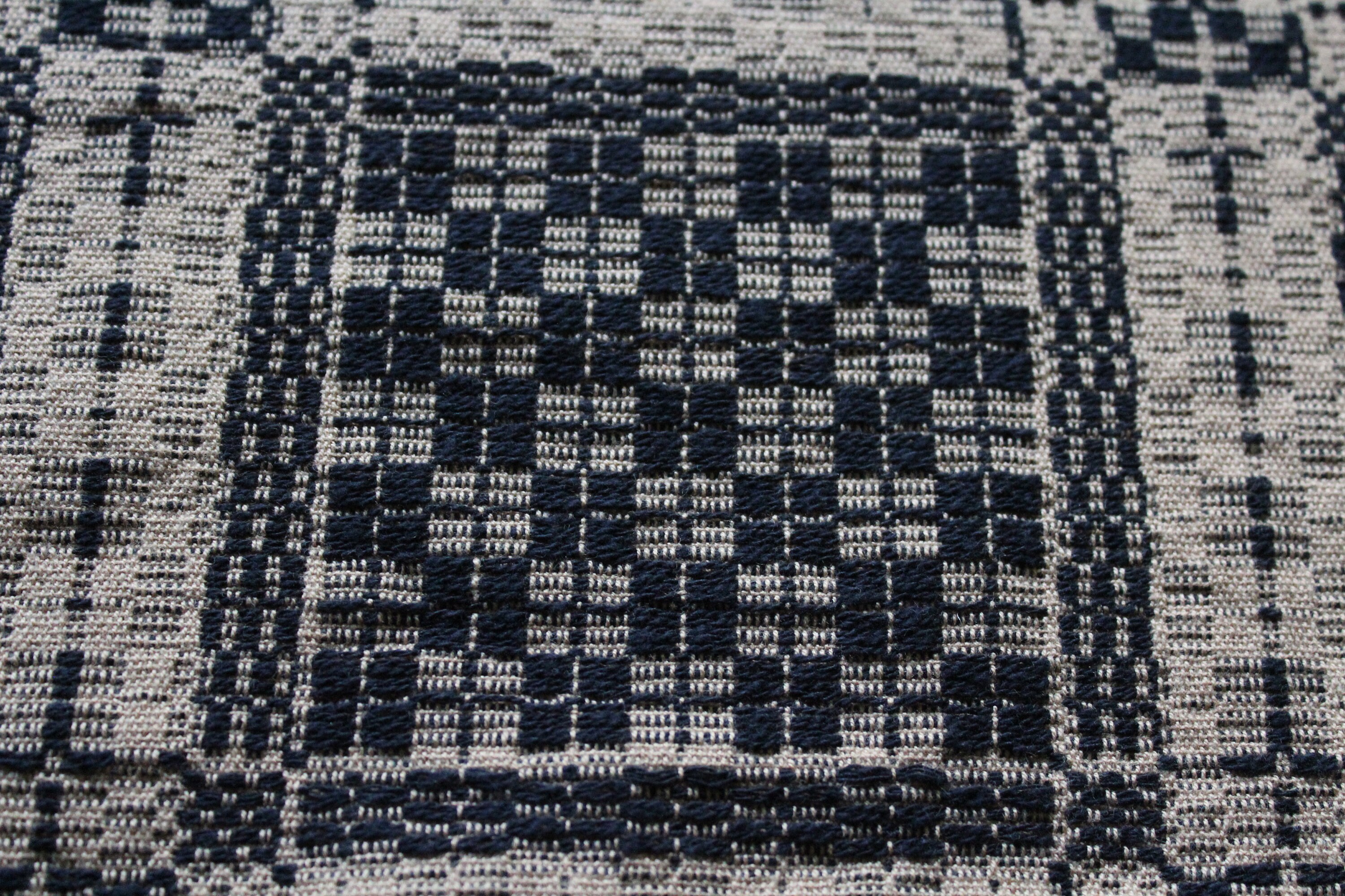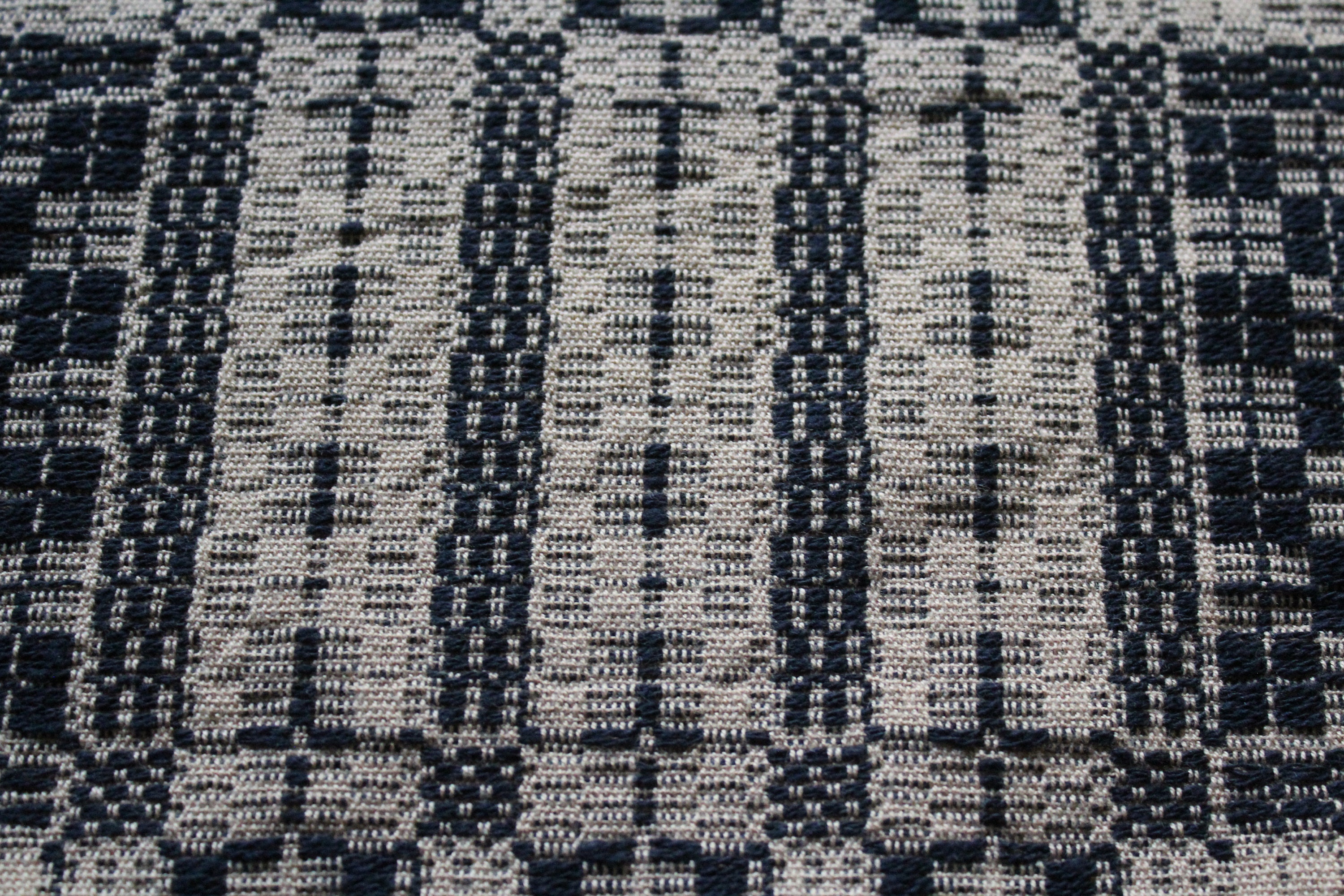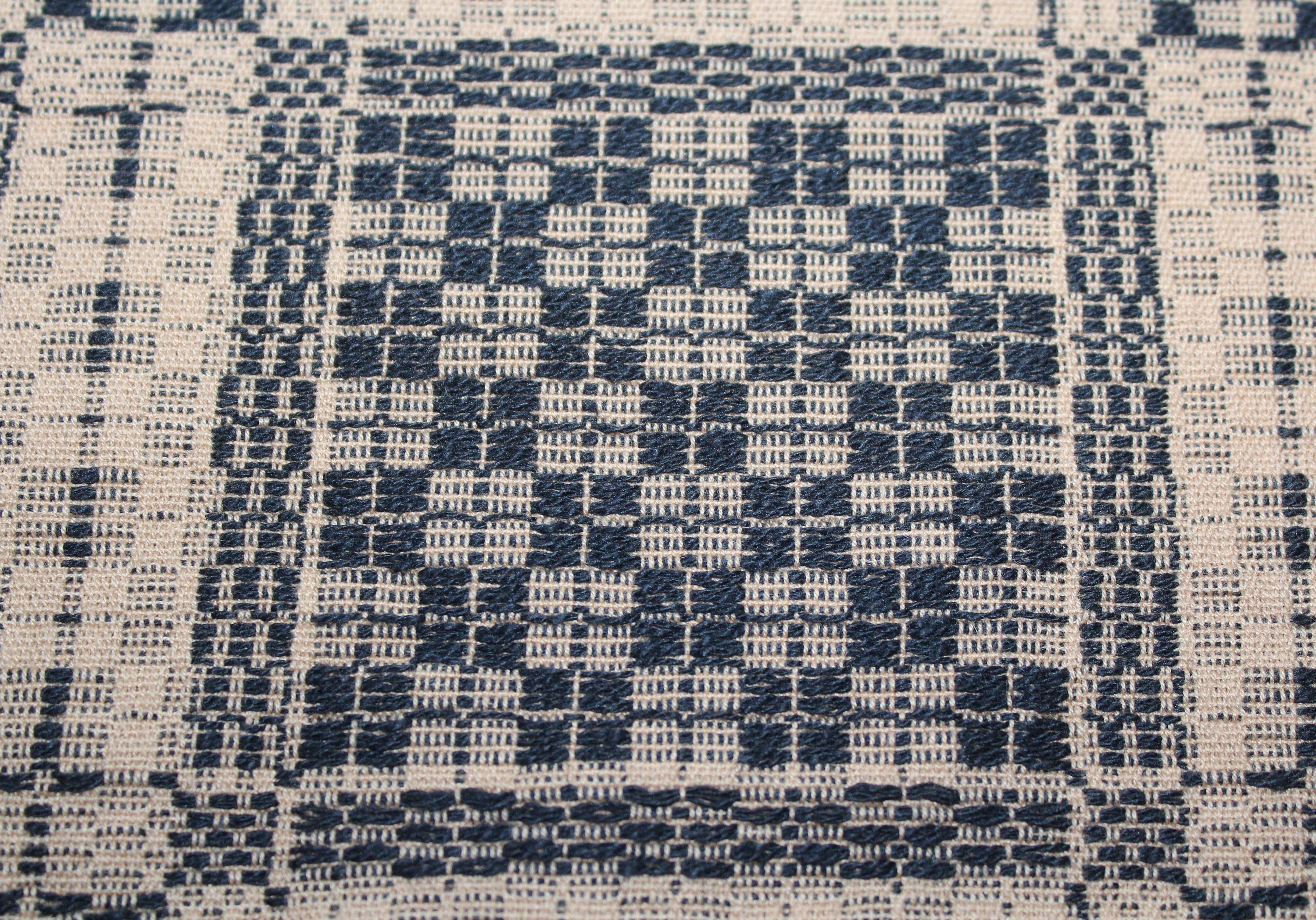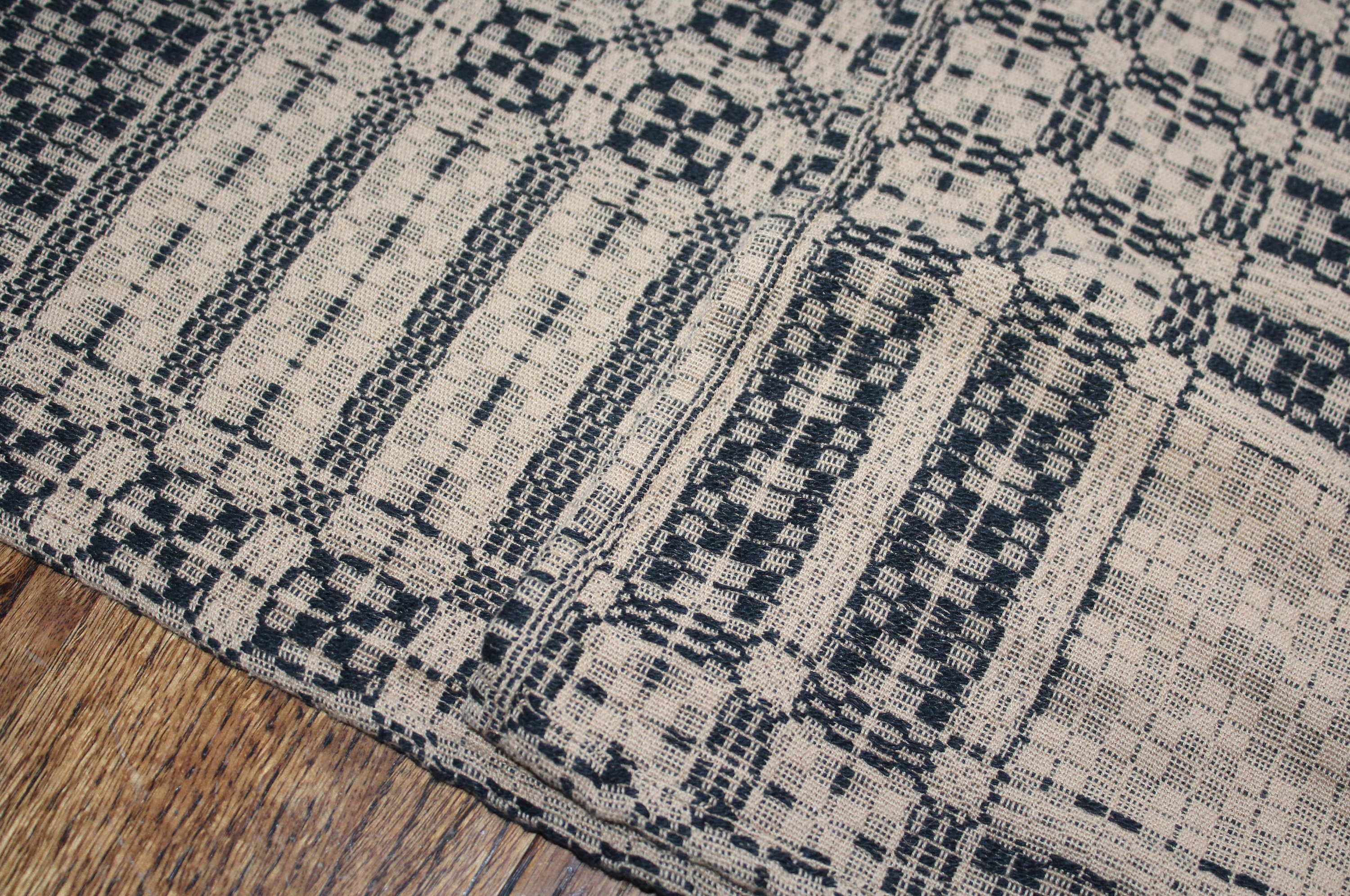 This is a beautiful antique mid 19th century hand loomed reversible table runner in black and tan, in wonderful condition after 150 or so years of use. It measures 58" x 18". I see no notable damage. I bought it at a Scandinavian farm estate sale in Minnesota. Enjoy!