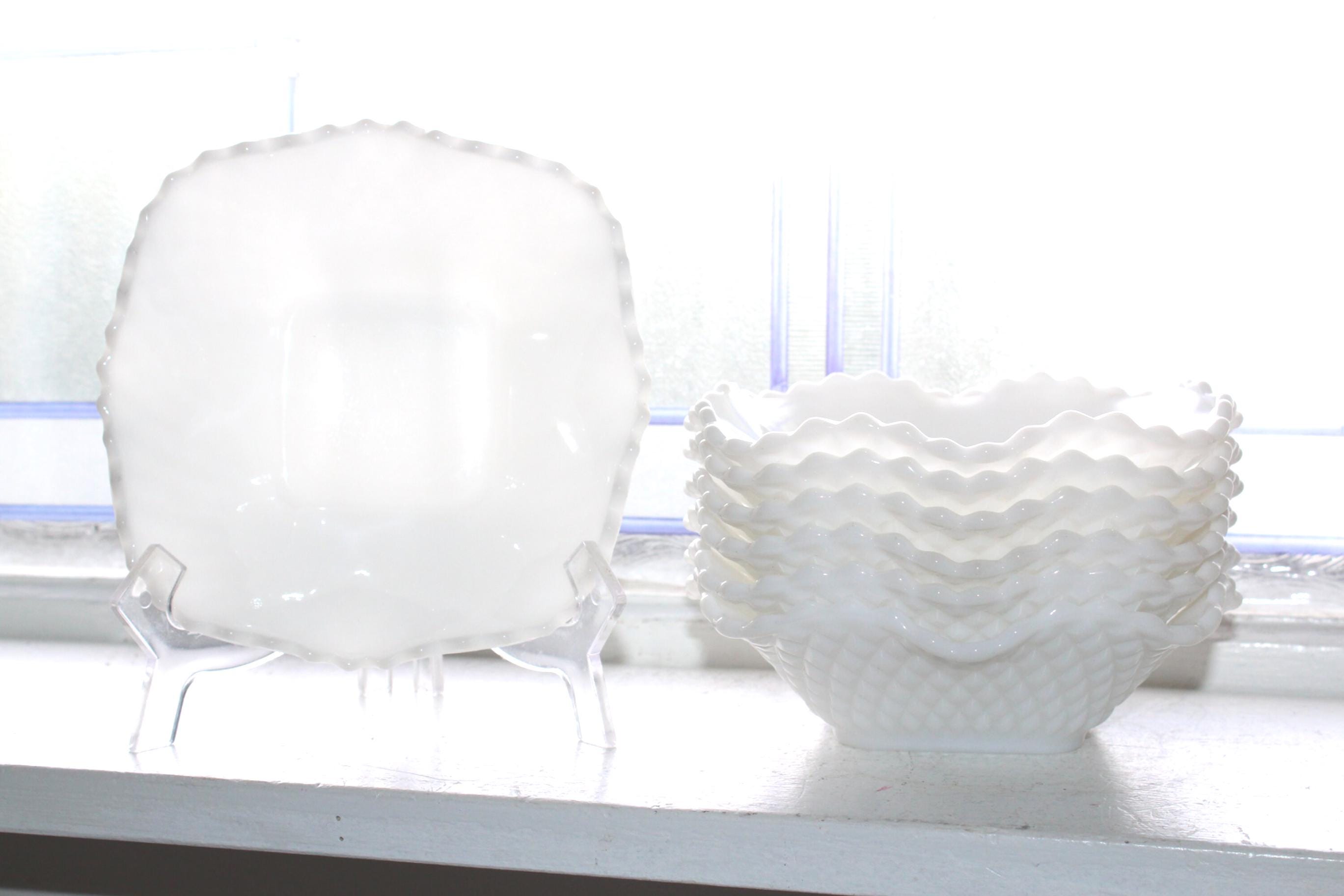 7 vintage milk glass candy dishes or nut bowls with diamond weave pattern, in excellent condition. The bowls measure 6" x 6" x 2" high. No chips or cracks, perfect for use or display. Enjoy!