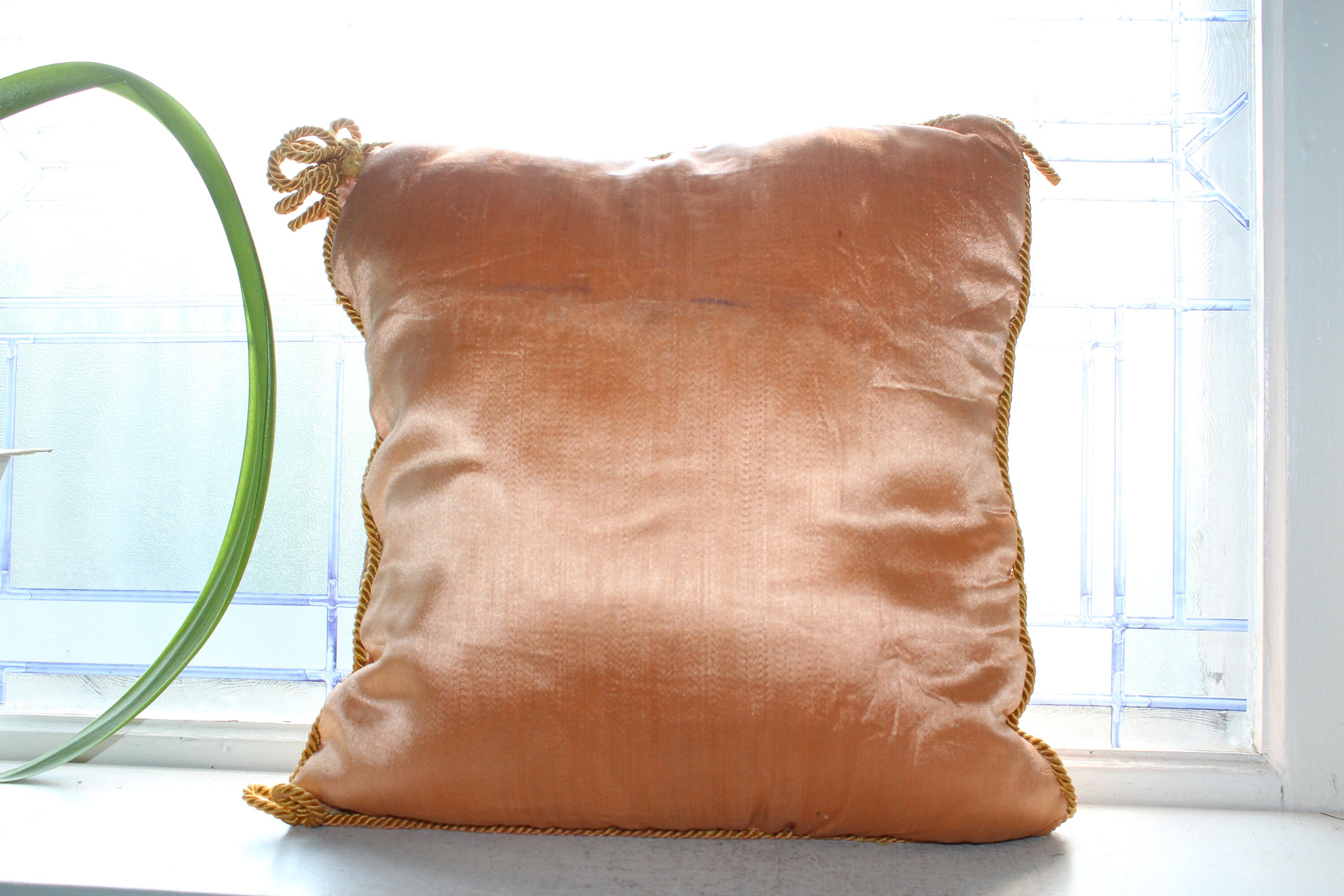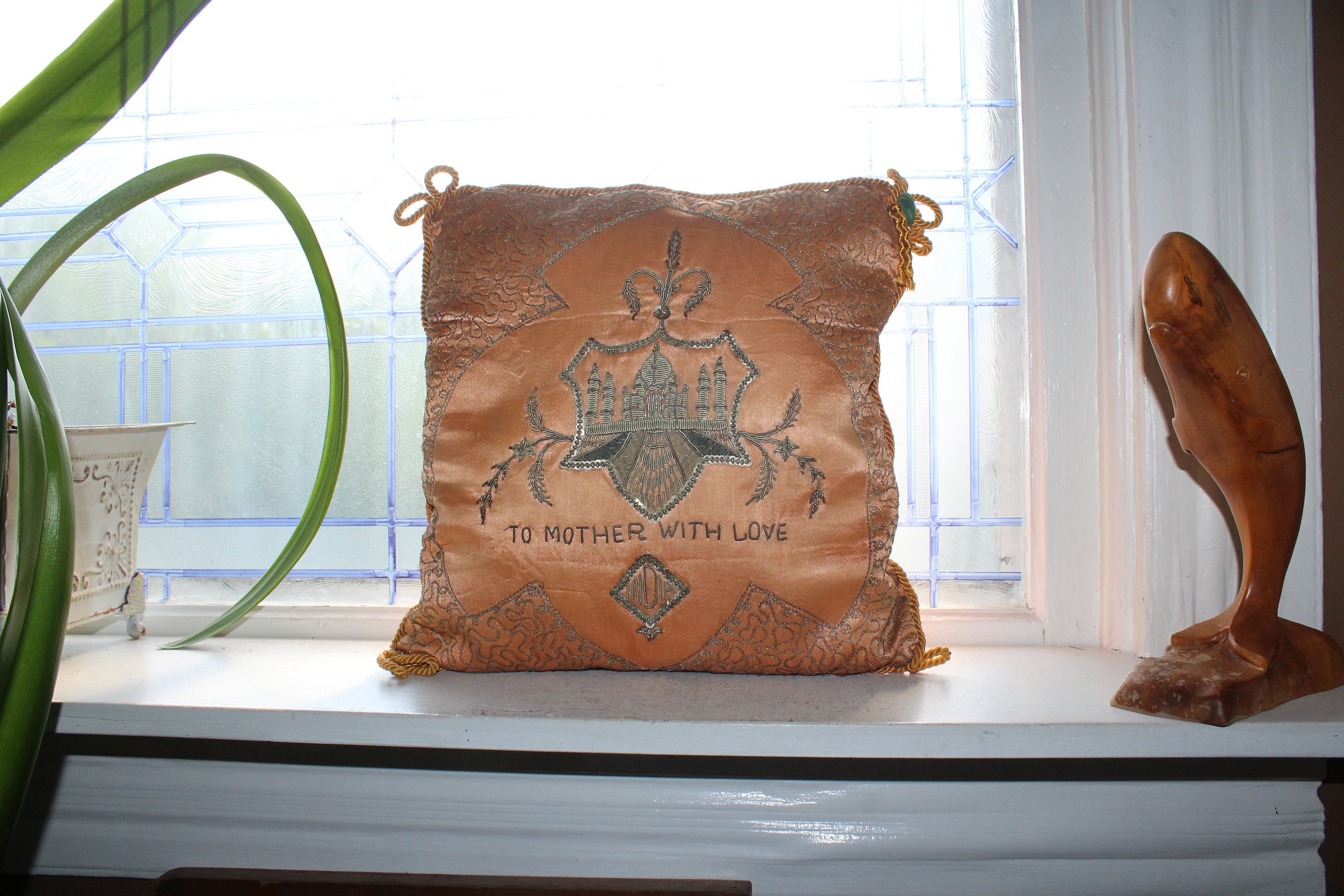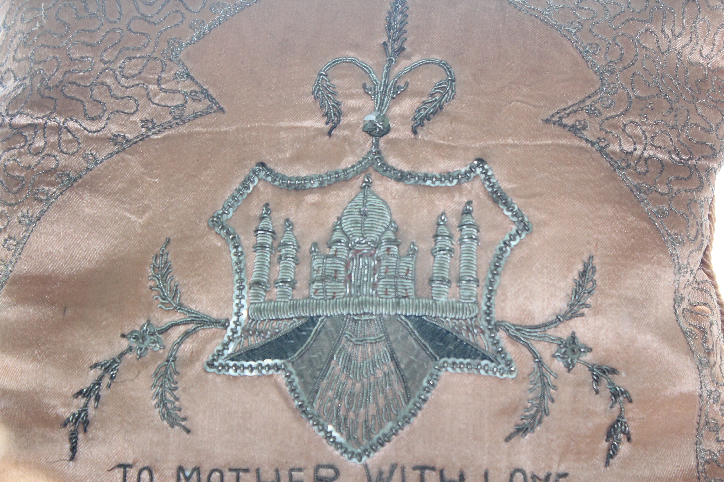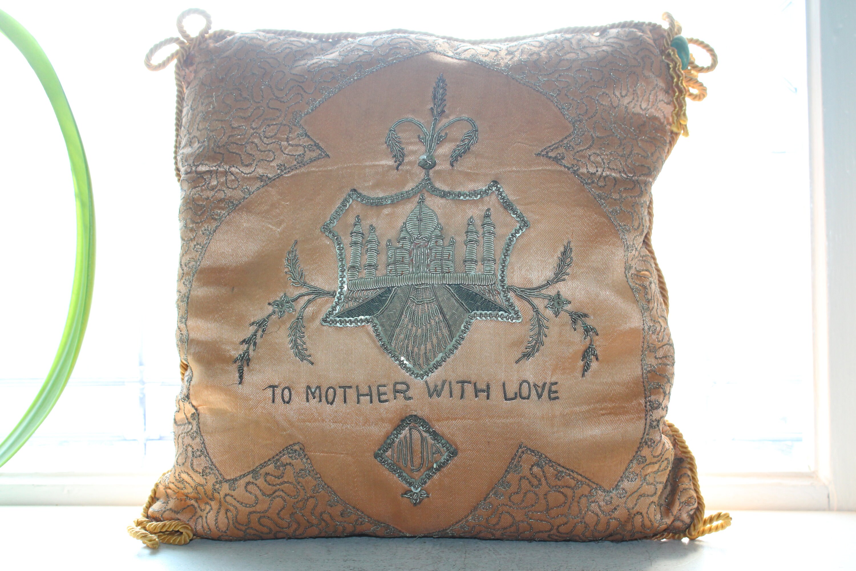 Vintage silk pillow, a souvenir of the Taj Mahal in India and reading "To Mother With Love", in very good condition. The pillow measures 13 1/2" square and is decorated with metal thread. No damage, ready to use and display. Enjoy!
