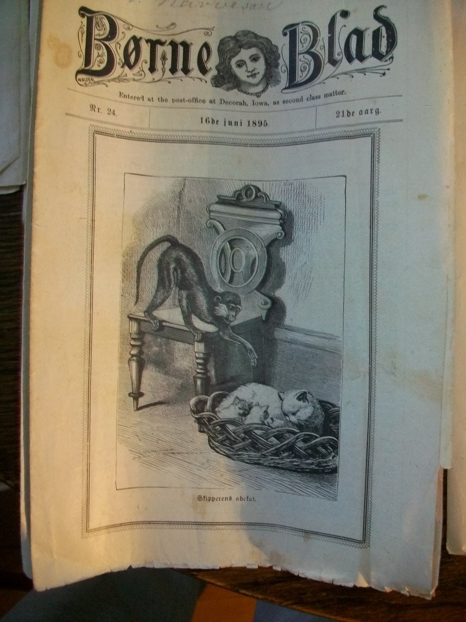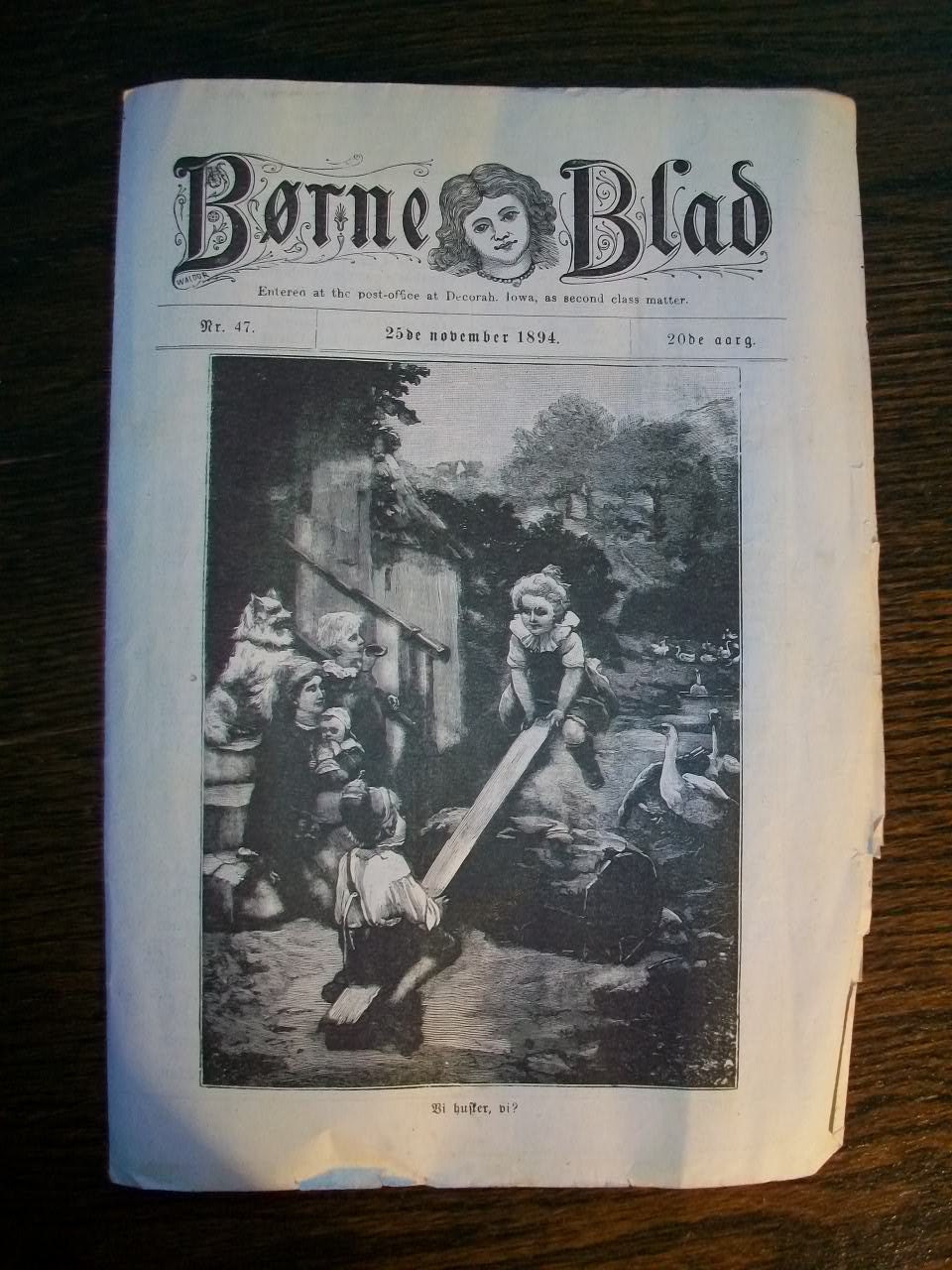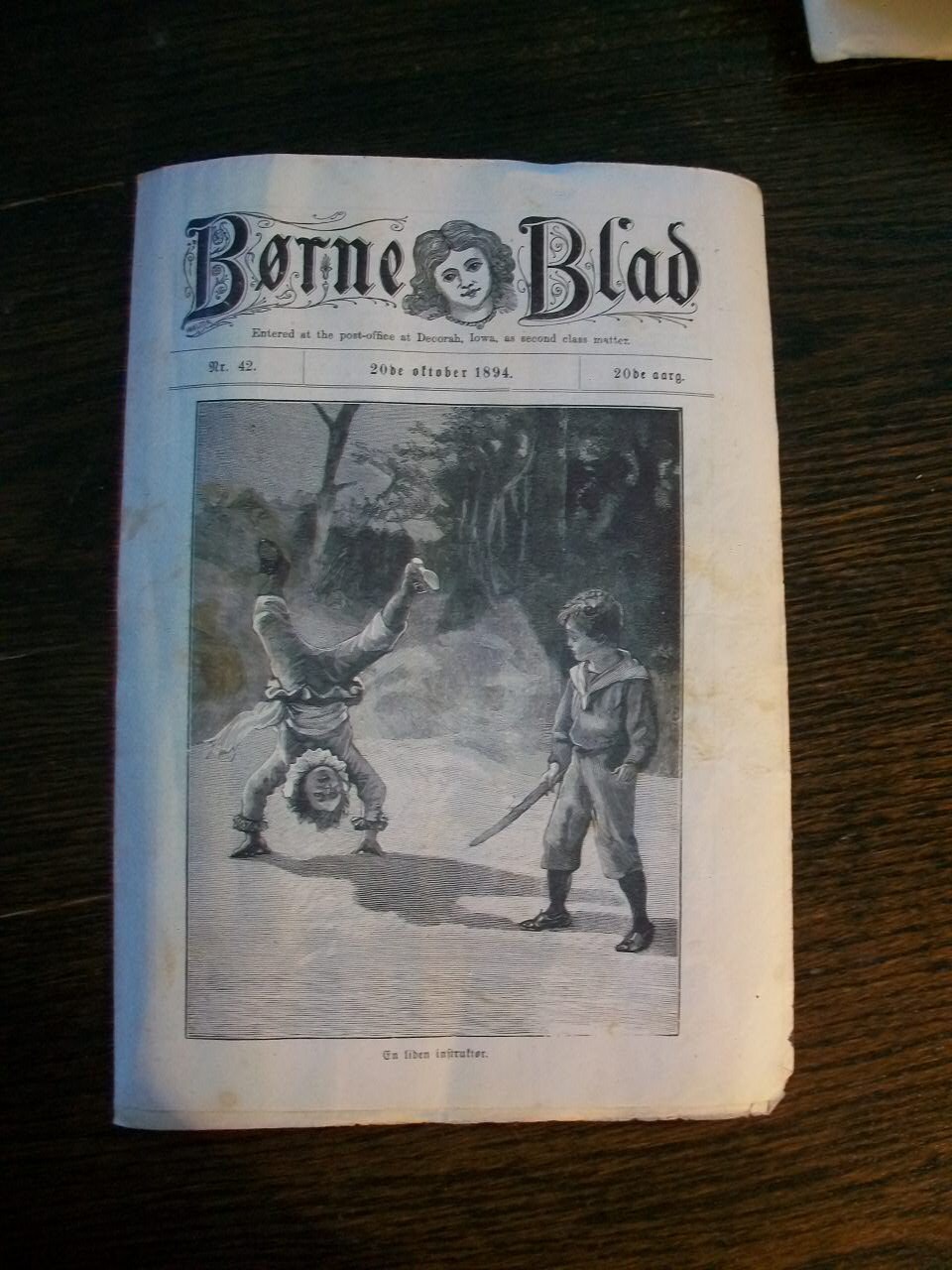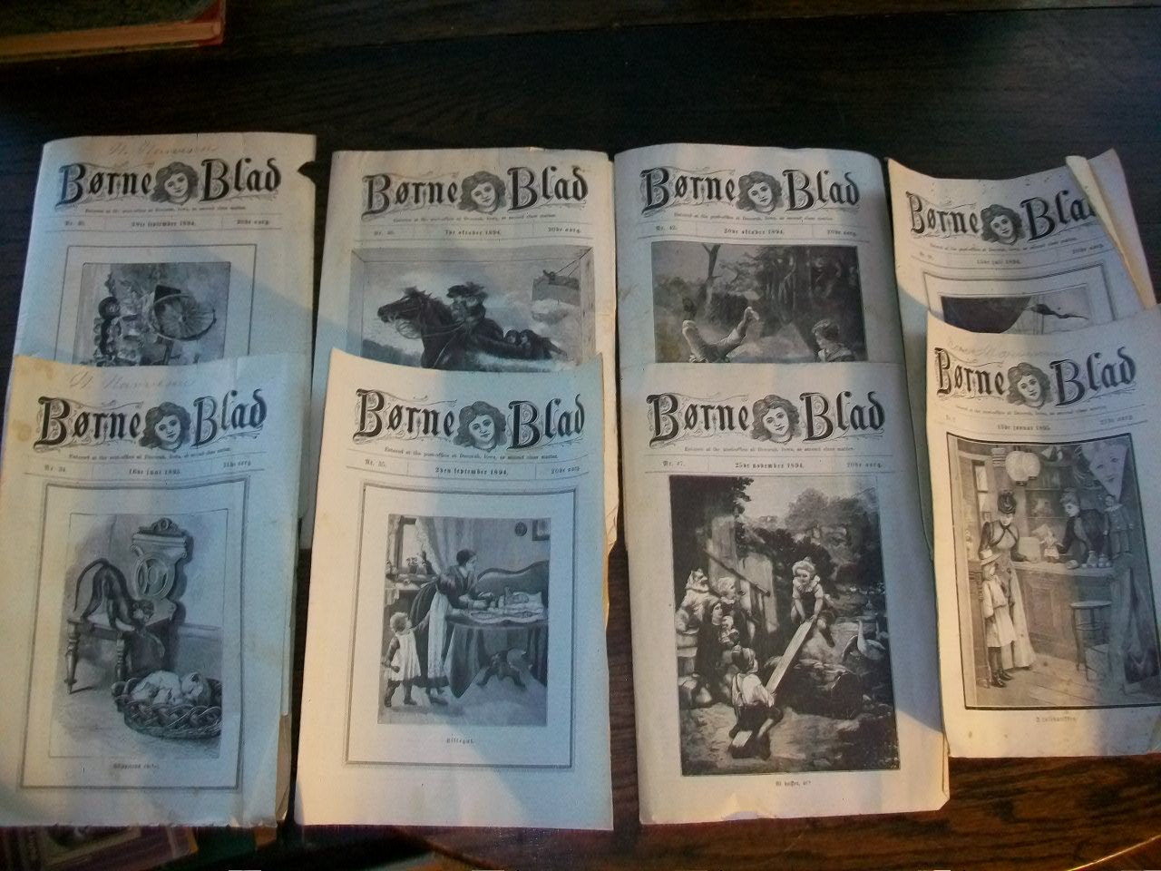 Antique 1894 newspapers, either Norwegian or Danish, title Borne Blad, in good condition. These papers are filled with wonderful old illustrations, mostly of adorable children. Each paper measures 9 1/2" x 6 3/4" folded. These papers do show wear, especially around the edges, and are age stained as well. The illustrations would look great framed! Enjoy!