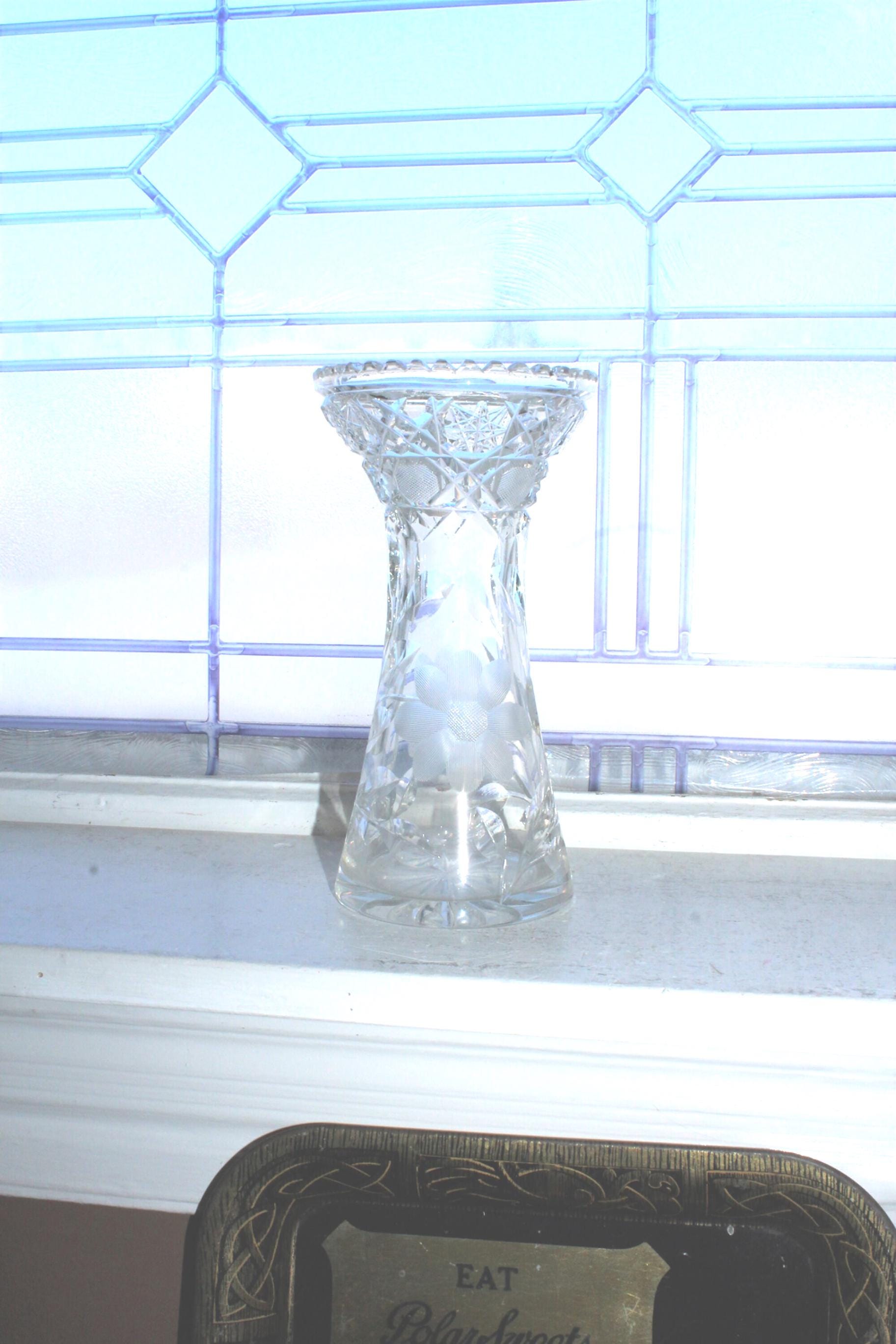 This vintage cut crystal vase with flared top and sawtooth rim is just gorgeous, and in very good condition. It measures 4" wide at the top x 7 7/8" high. No chips or cracks but the interior has a bit of clouding that could be cleaned up better, still perfect for use or display. Enjoy!