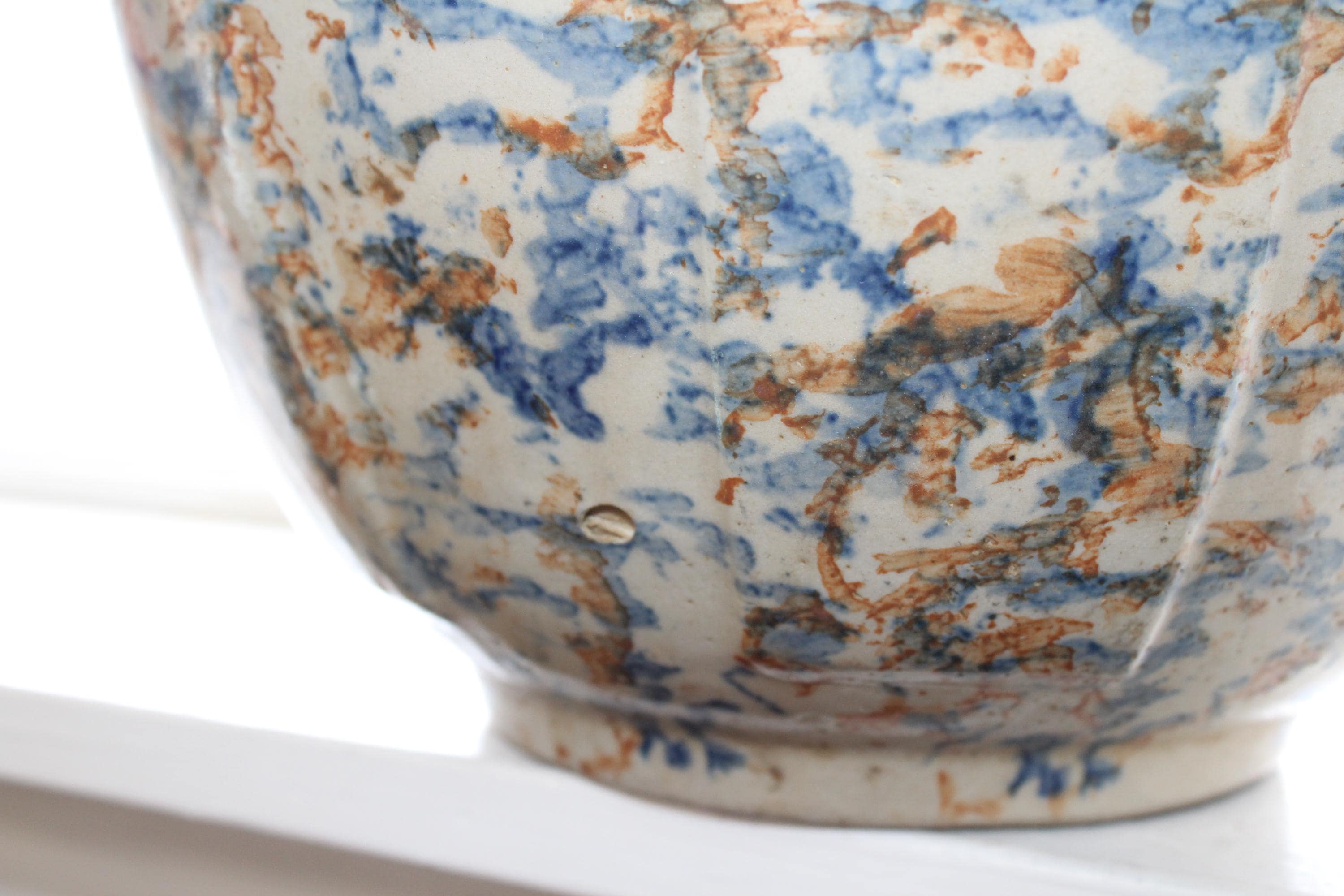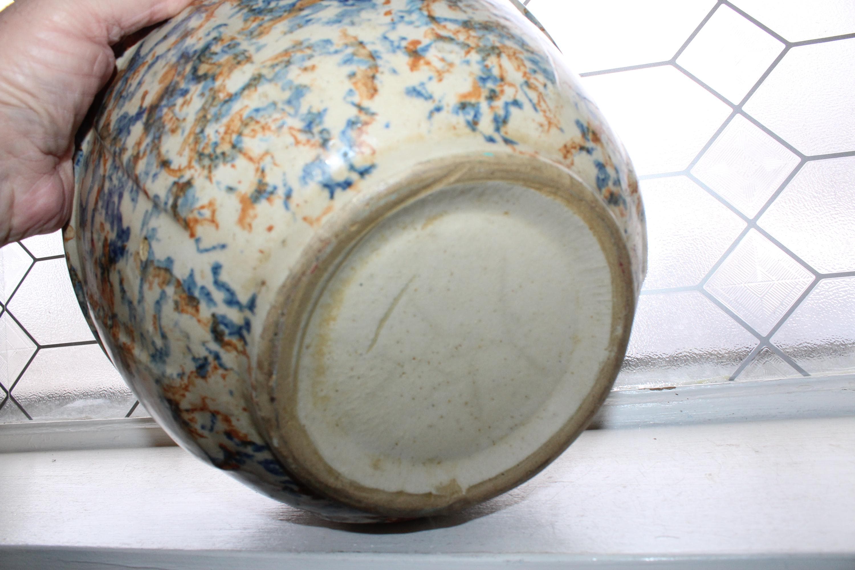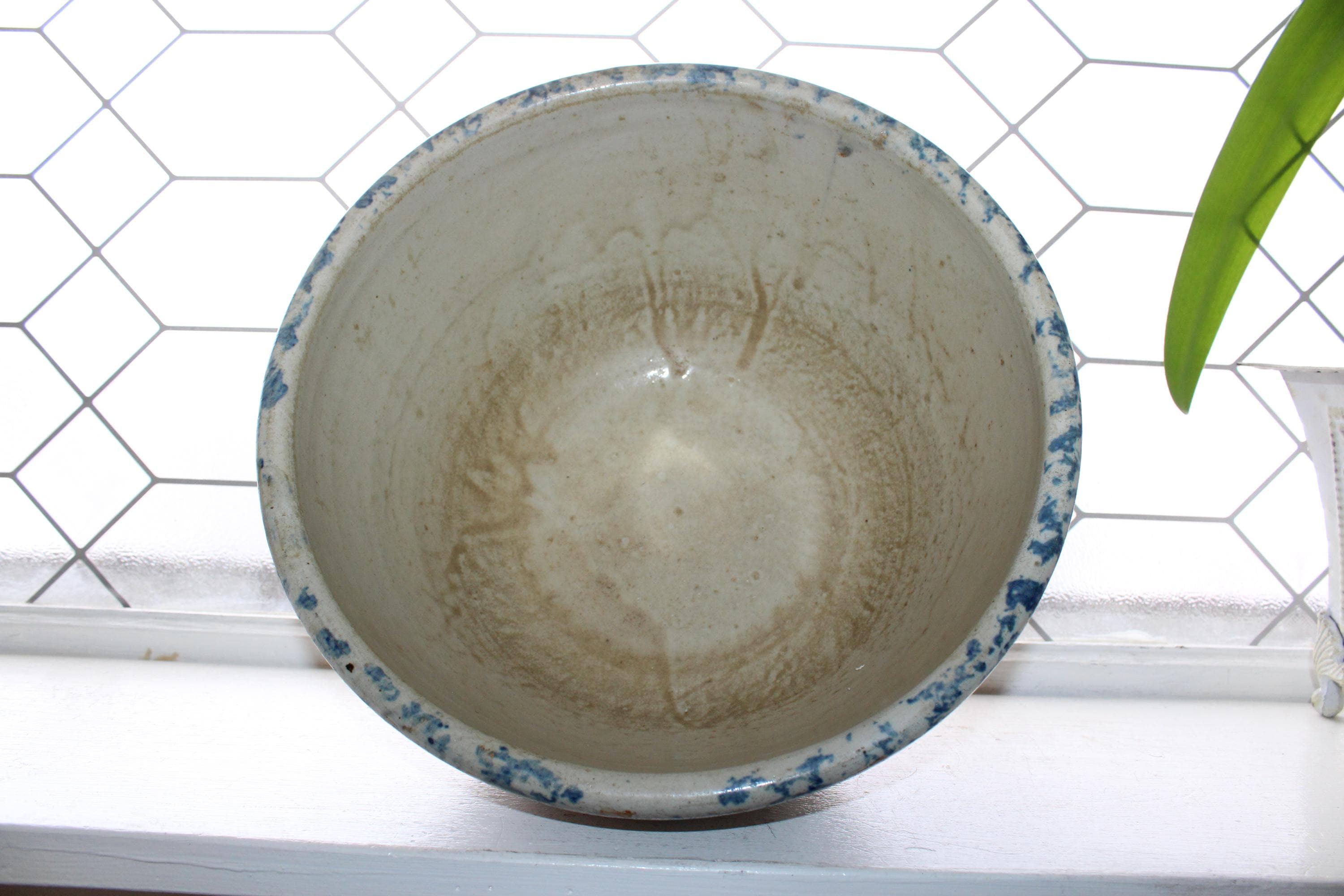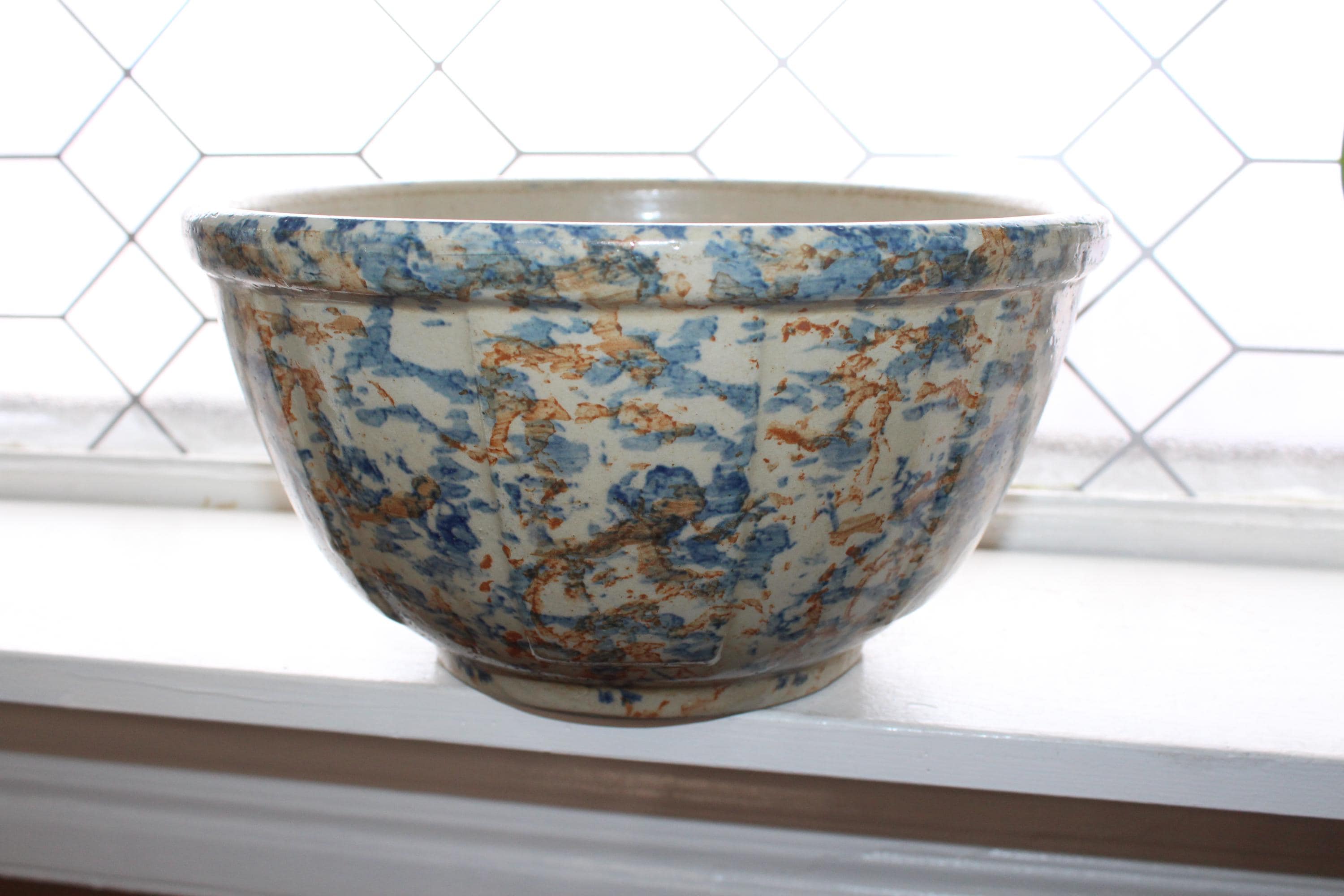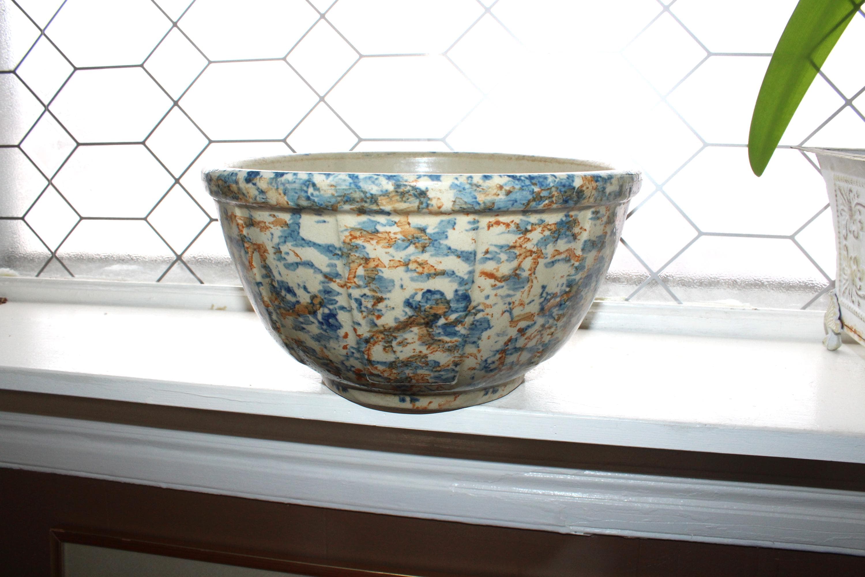 Circa late 1800s large Red Wing spongeware stoneware paneled mixing bowl, in good condition and great for display in a country kitchen. The bowl measures 11" wide x 5 3/4" high and weighs just over 5 1/4 lbs. It has one small glaze pop on the side and age appropriate wear, no other issues. Enjoy!