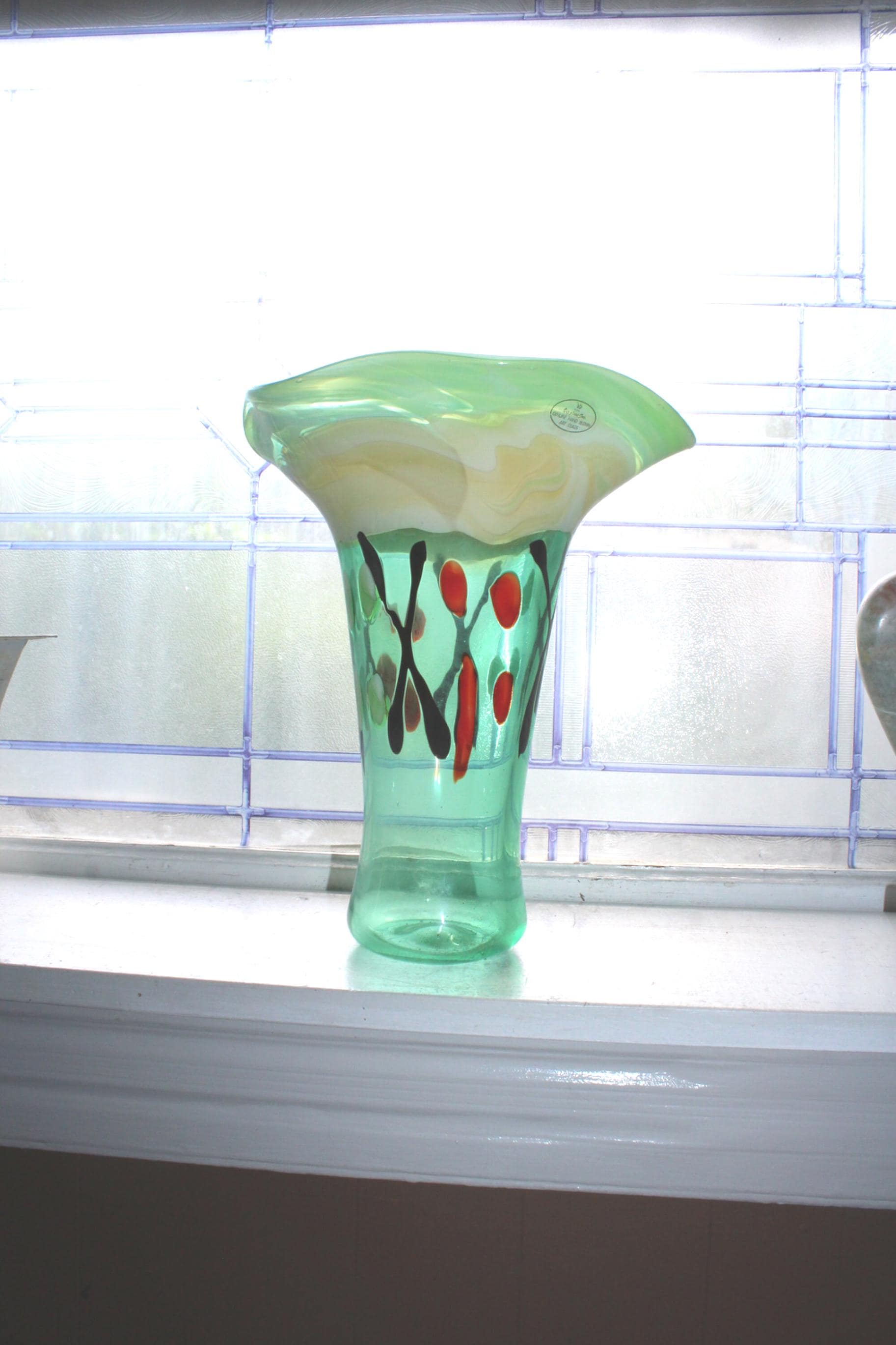 Large Viz Art Glass vase featuring red, black and yellow colors on a green base, in excellent condition. It measures 11.5" high, weighs 4 1/4 lbs. and has no chips, cracks or scratches, perfect for display. Enjoy!