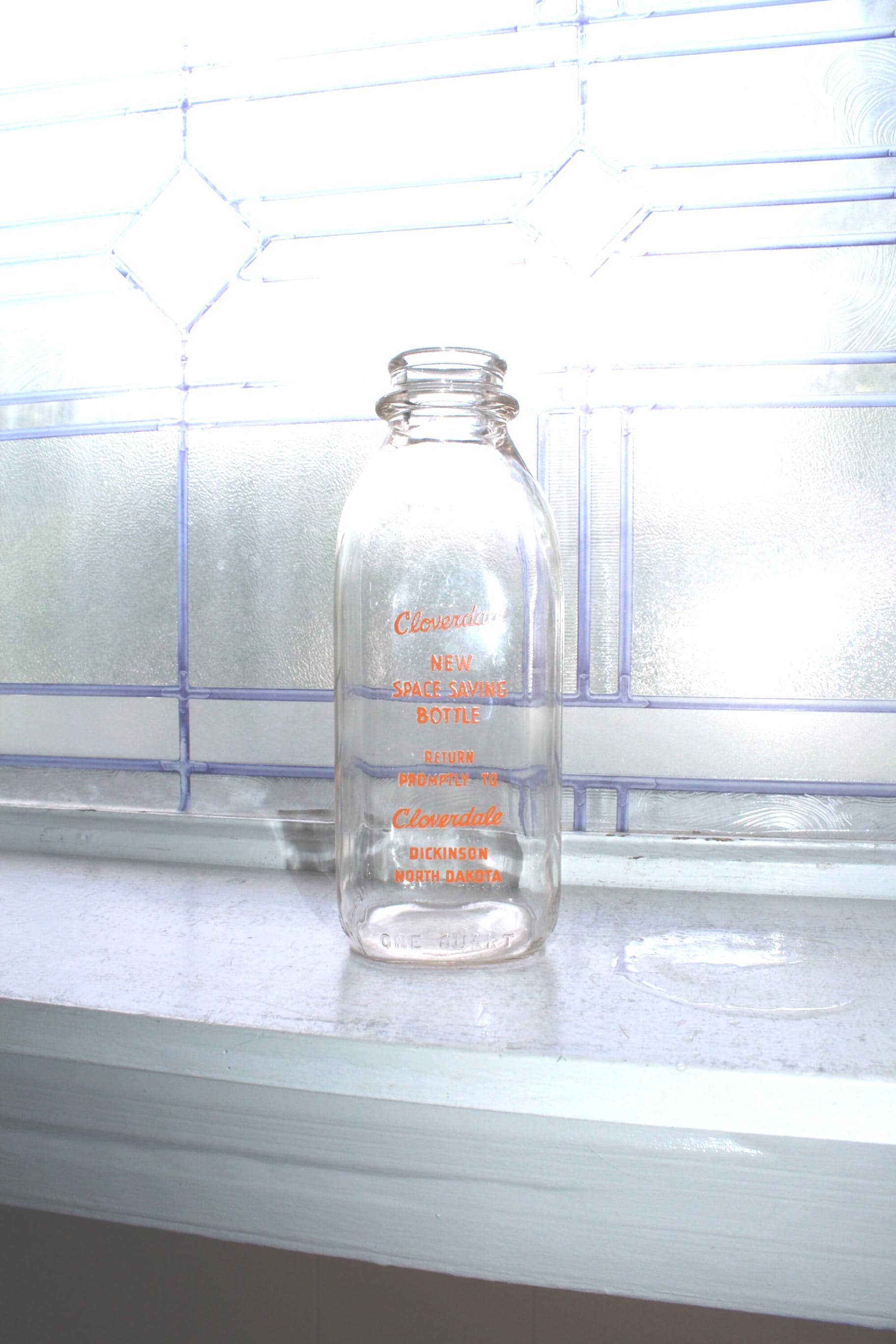 Vintage 1950s orange pyro square quart glass milk bottle from Cloverdale Dairy in Dickinson, North Dakota. The bottle measures 8 3/4" high x 3 1/4" wide and has no chips or cracks, great for use or display. Enjoy!