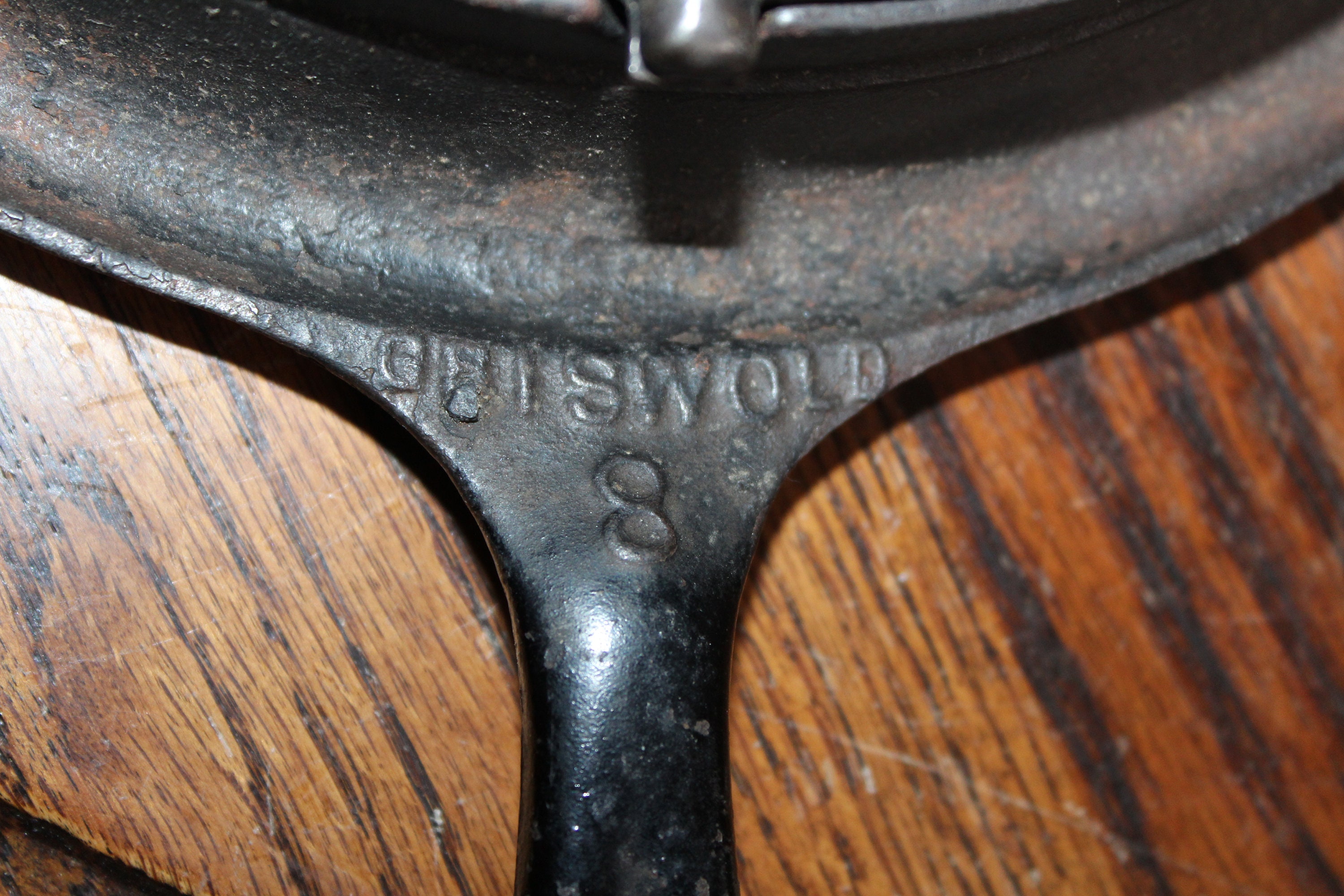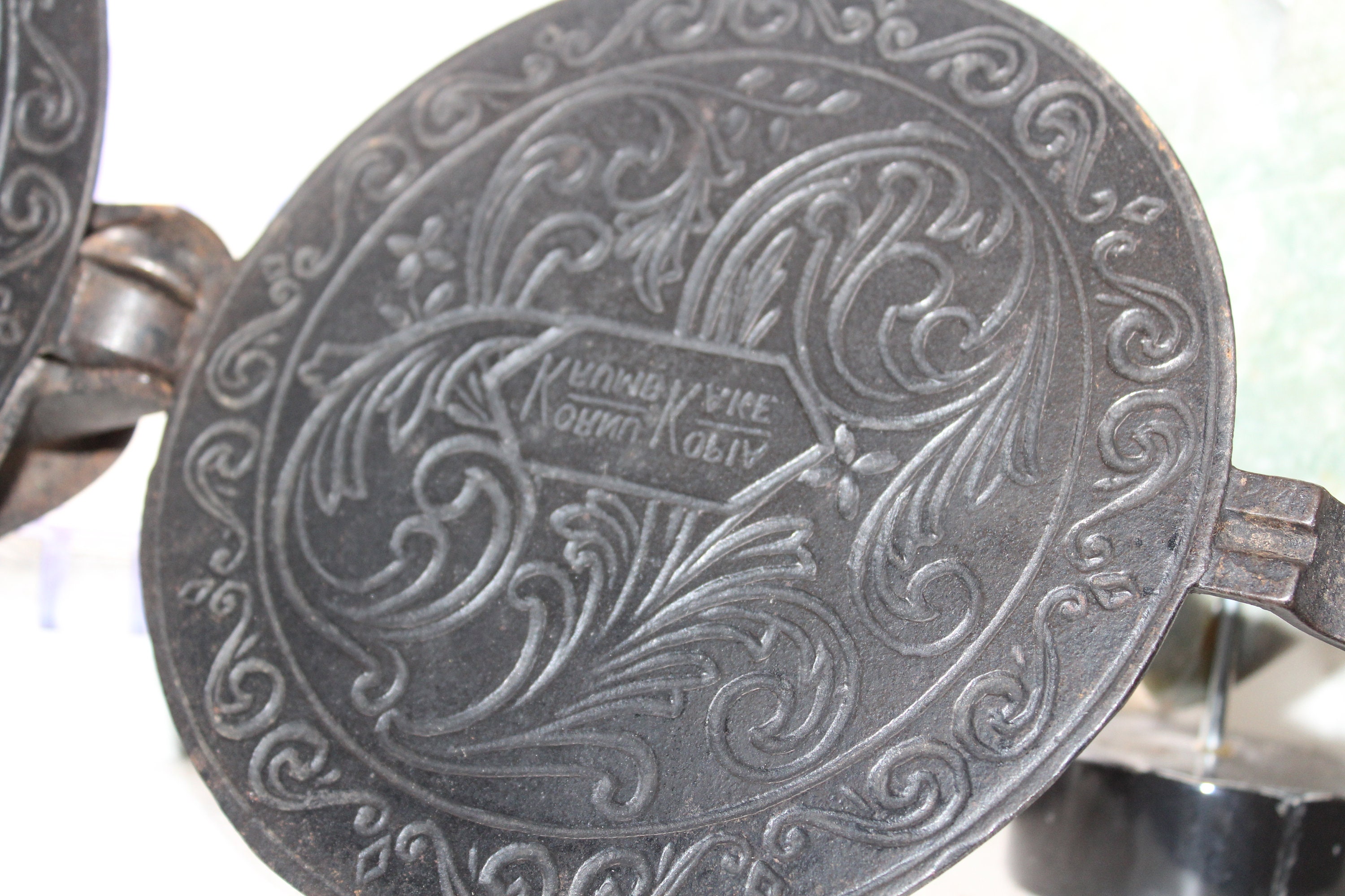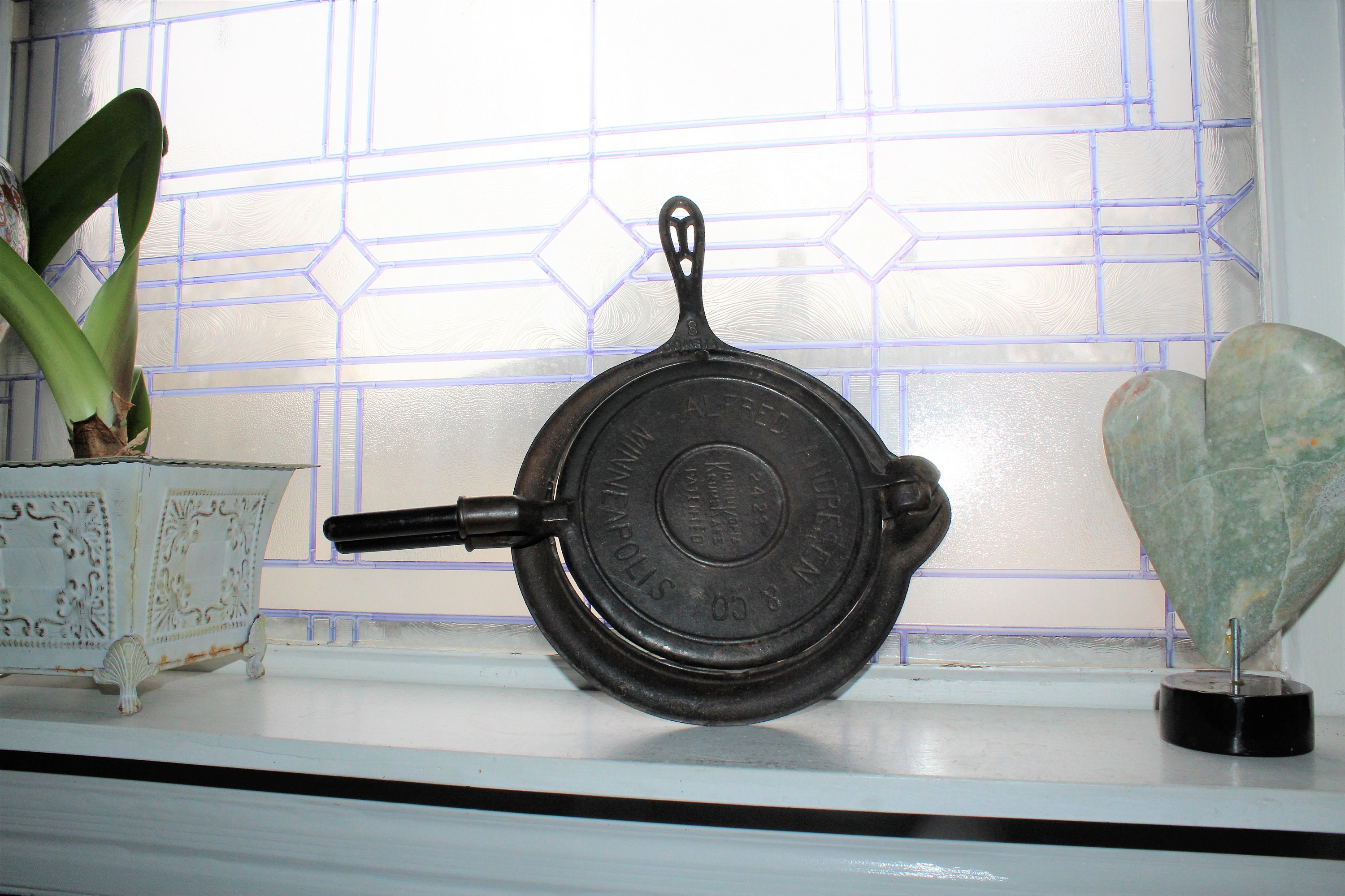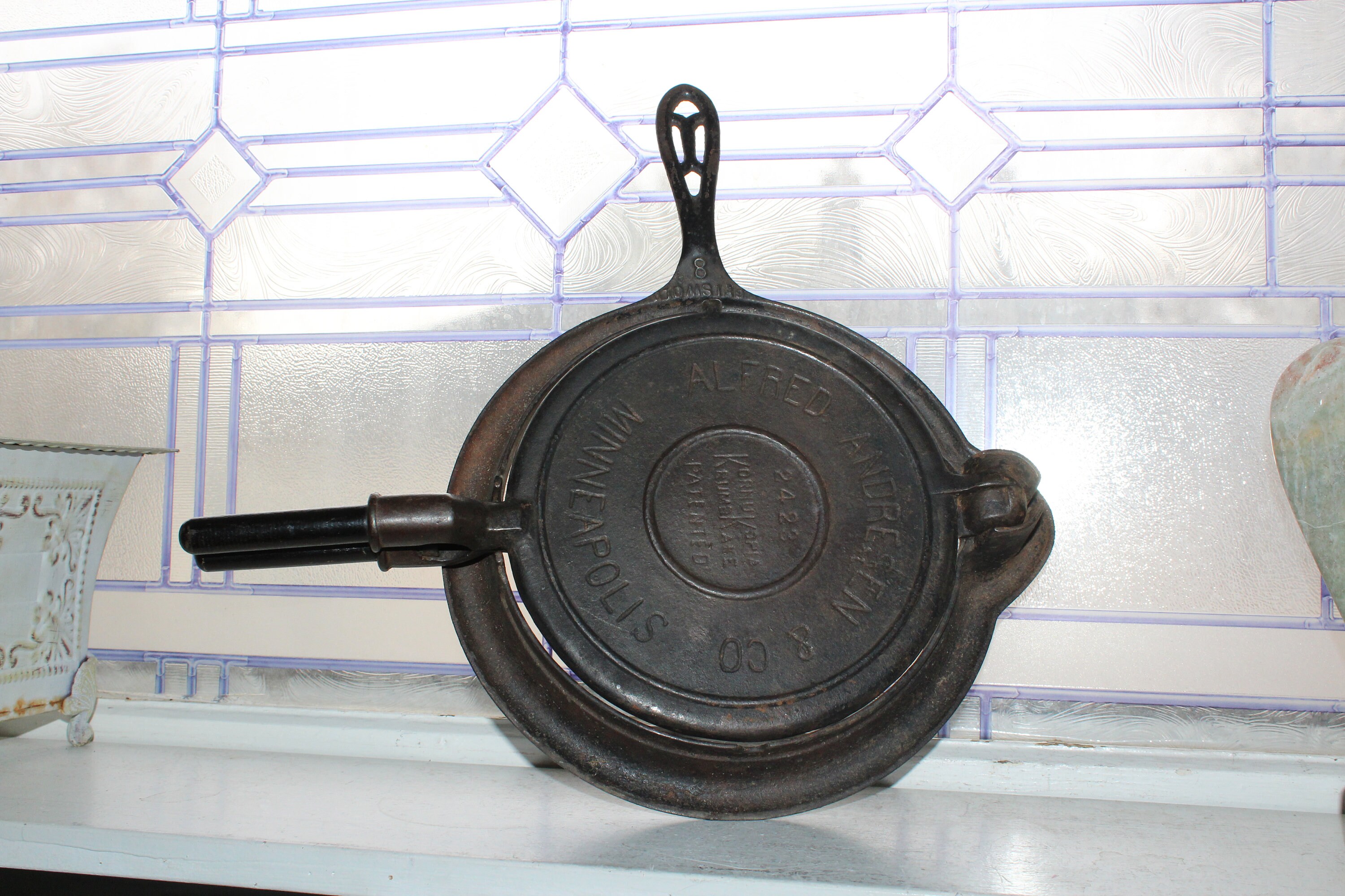 Antique Griswold 8 cast iron Alfred Andresen Norwegian Kornukopia Krumkake iron #2428, in very good condition. The pan weighs just over 9 pounds and is 10" wide not including the handles. No chips or cracks, just a great old Scandinavian pan for use or display- enjoy!