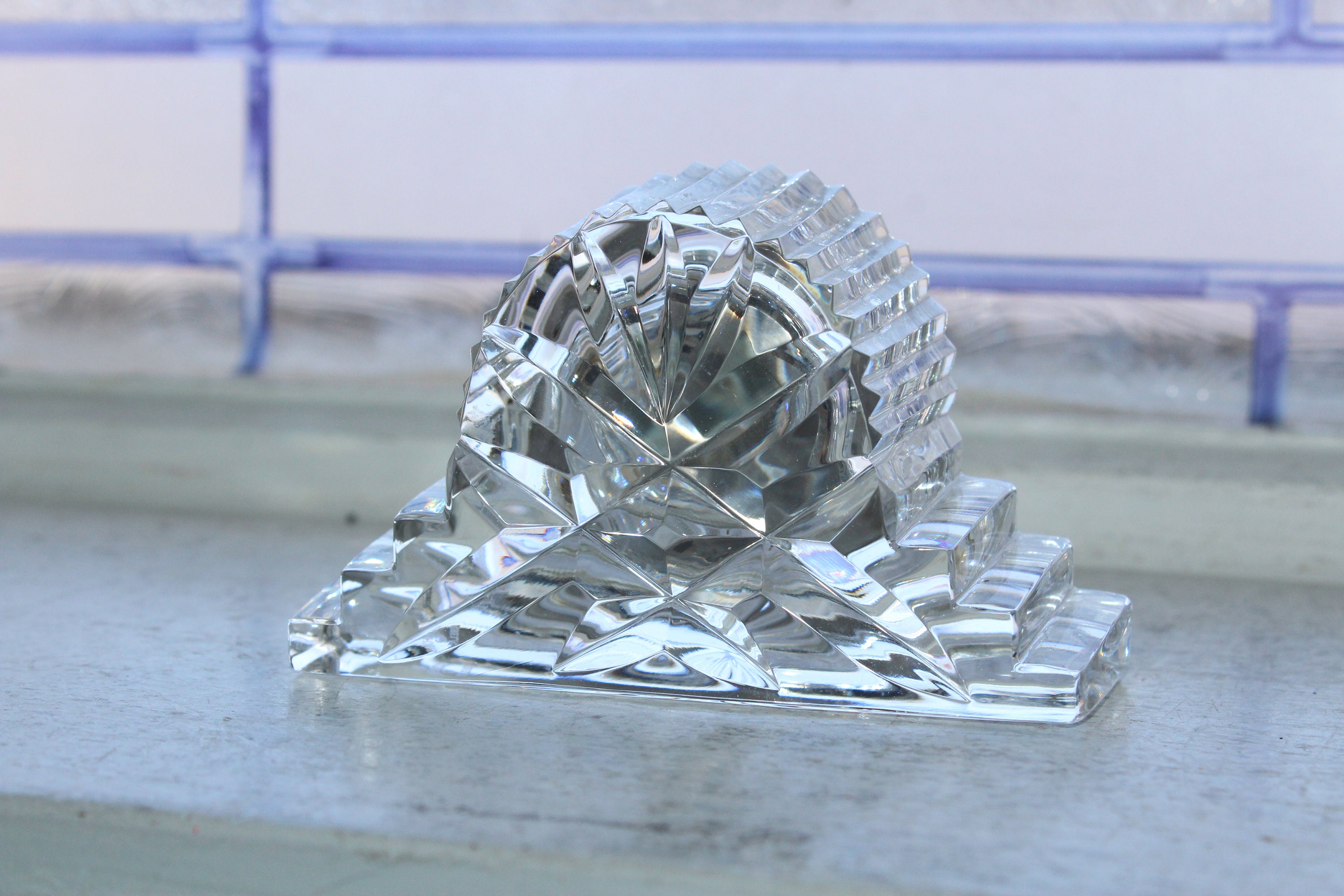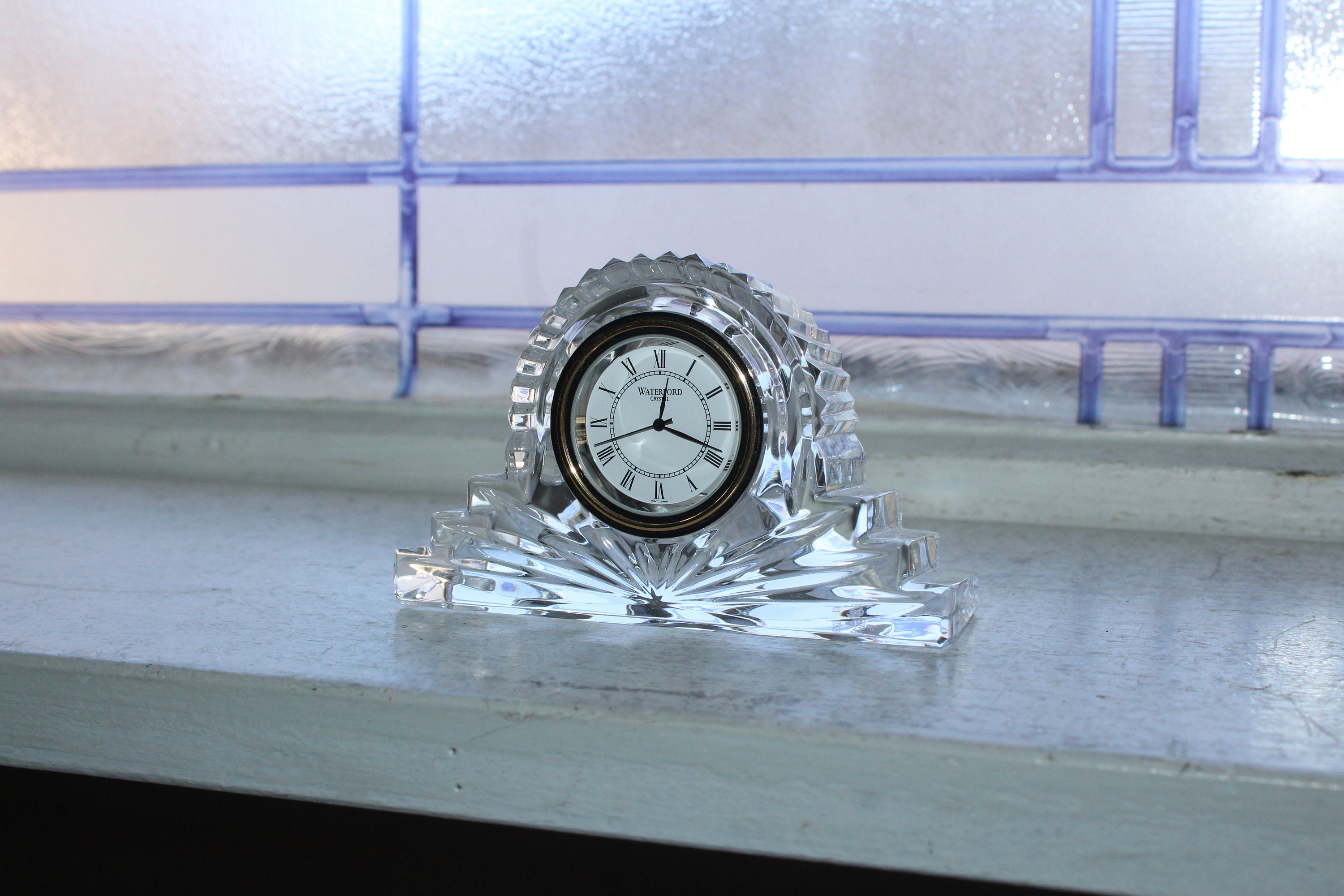 Vintage Waterford crystal quartz mantel clock, in excellent condition. It measures 4" wide x 2 1/2" high. No chips, scratches or cracks and it works but needs a new battery, perfect for use or display. Enjoy!