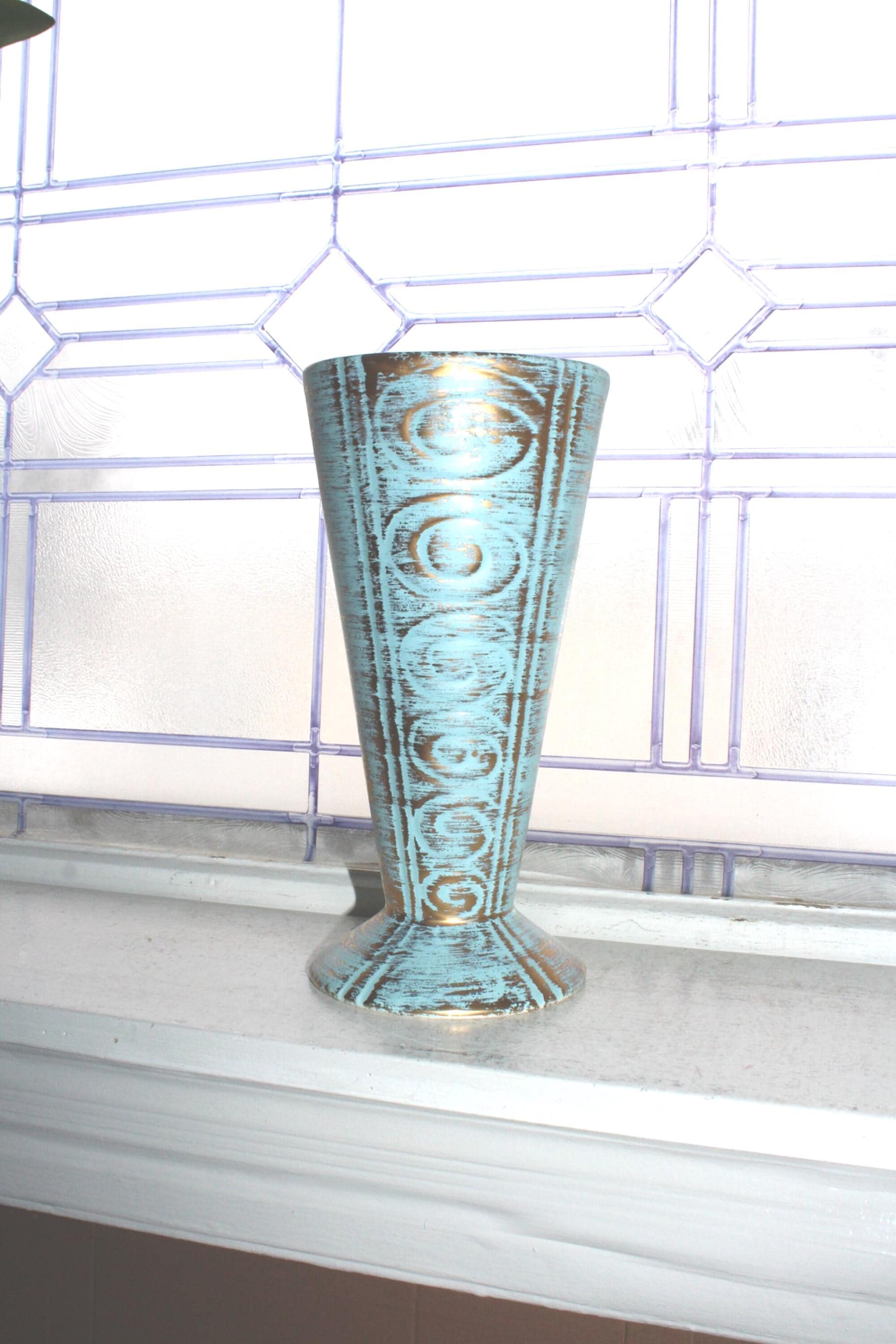This is a large vintage Mid Century Cleminson Gold Brush pottery turquoise and gold pottery vase, in very good condition. It measures 10 1/4" high x 5" wide at the top. No chips or cracks, just some small rust spots on the interior that I haven't tried to clean. It displays very well. Enjoy!