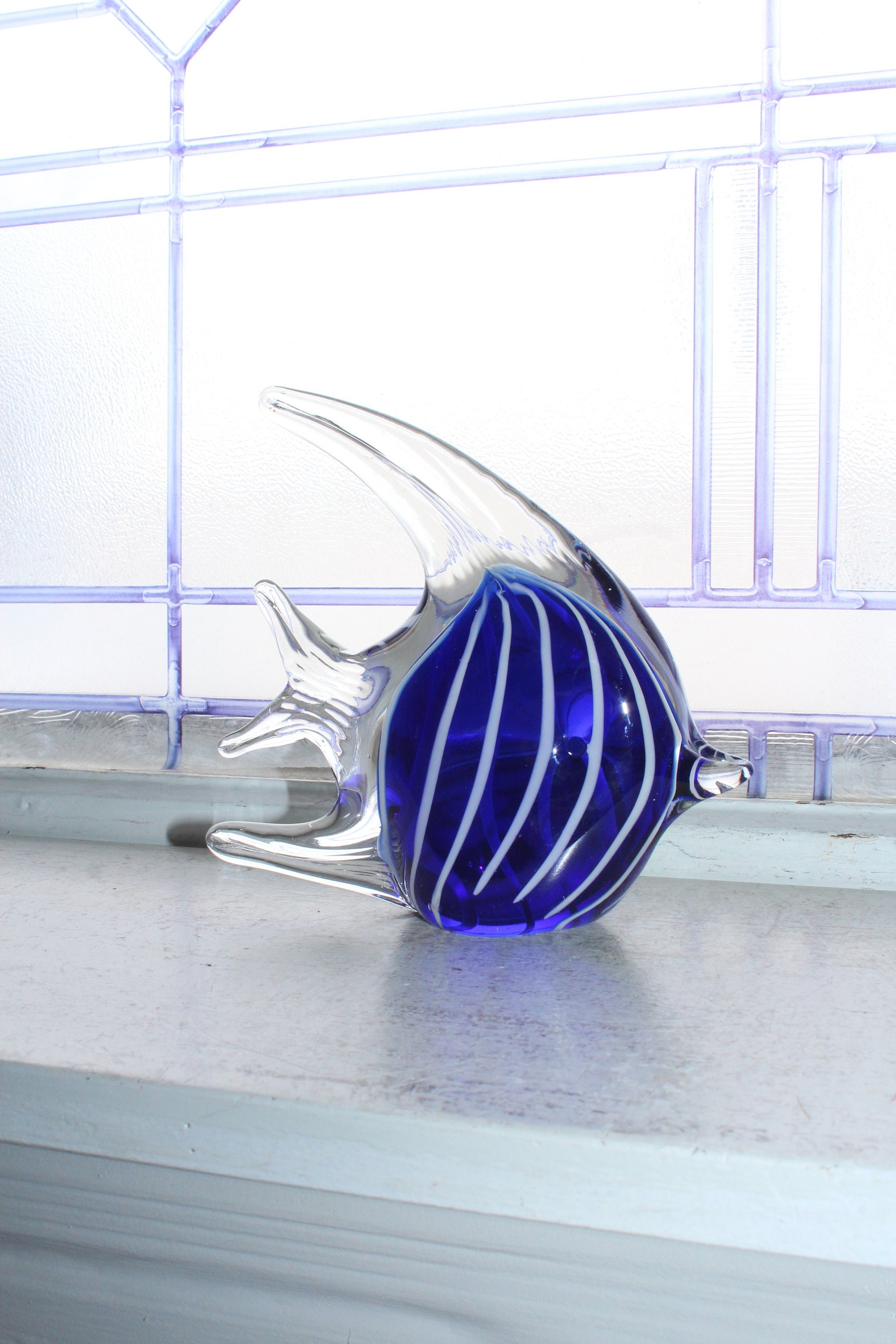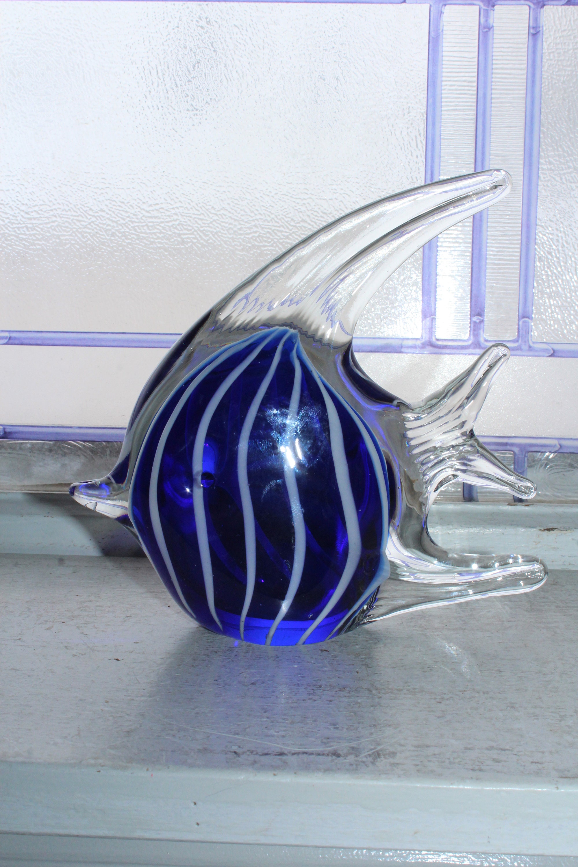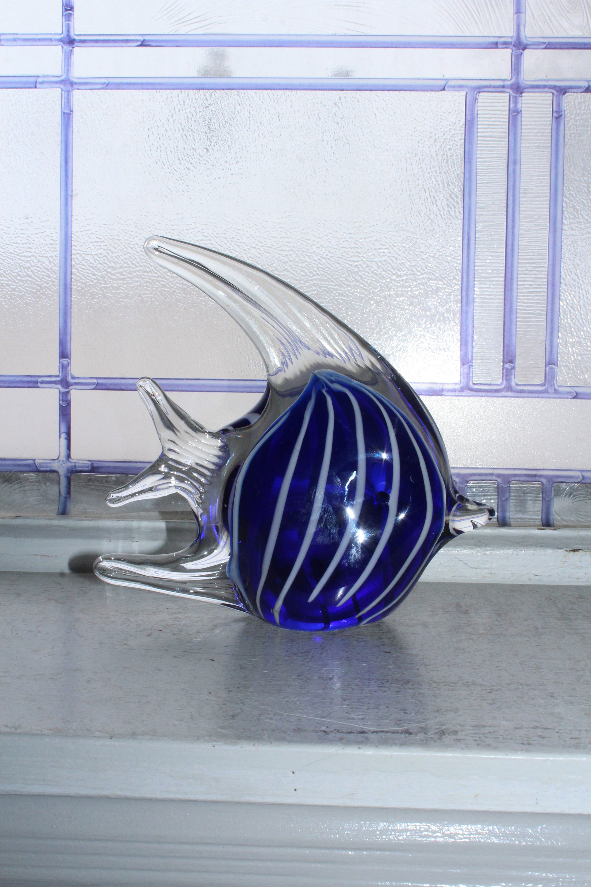 Vintage heavy Murano glass fish paperweight/figurine featuring white stripes on blue, in excellent condition. It measures 5 3/4" high and has no chips or cracks, perfect for display. Enjoy!