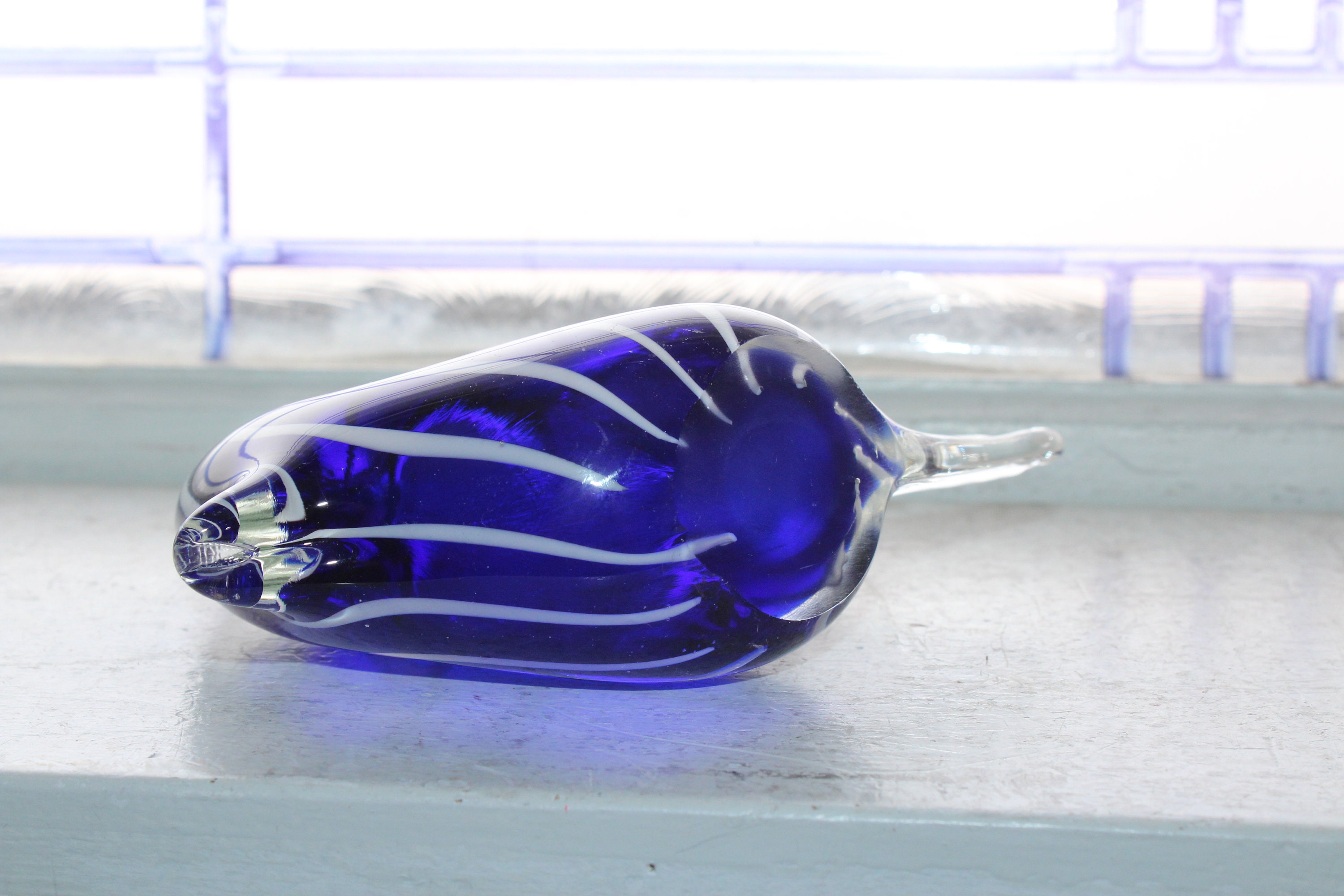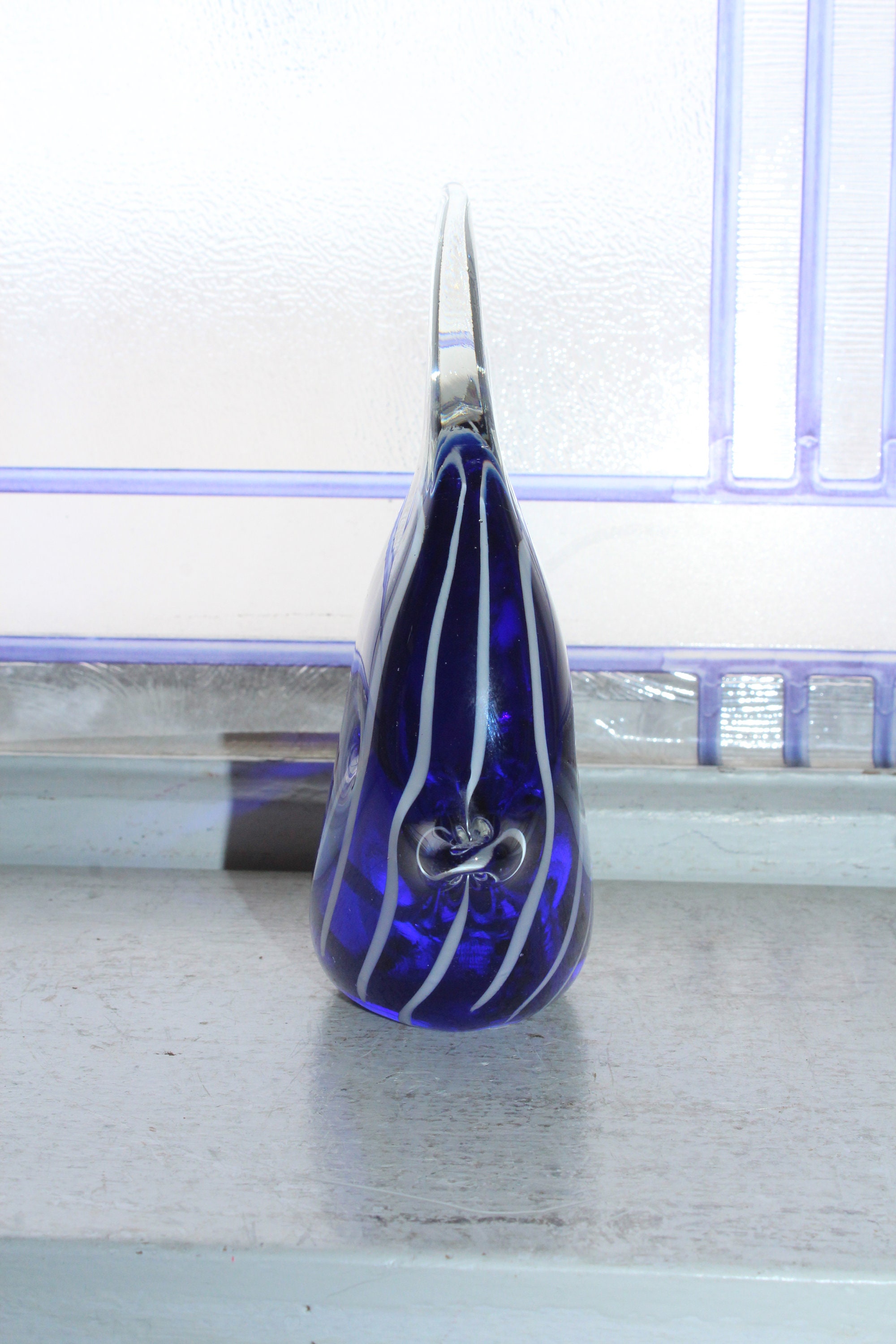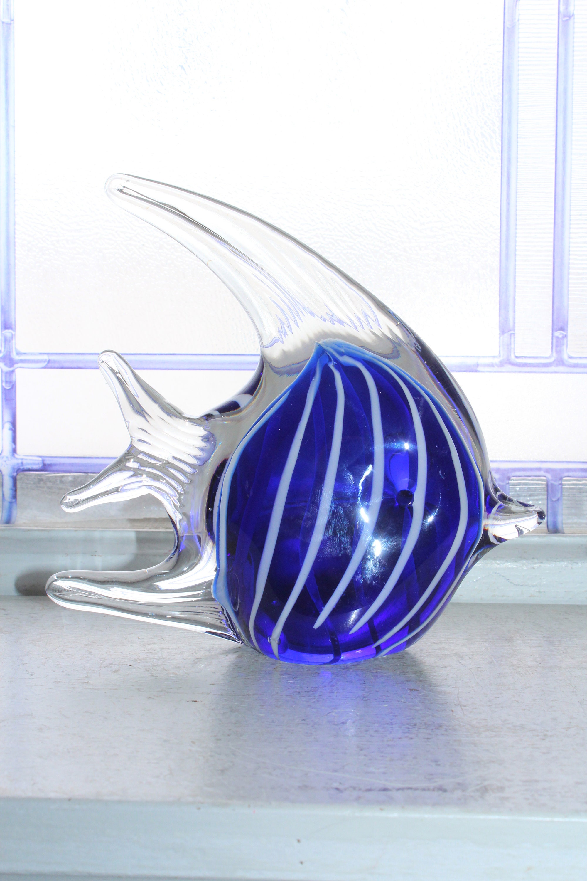 Vintage heavy Murano glass fish paperweight/figurine featuring white stripes on blue, in excellent condition. It measures 5 3/4" high and has no chips or cracks, perfect for display. Enjoy!