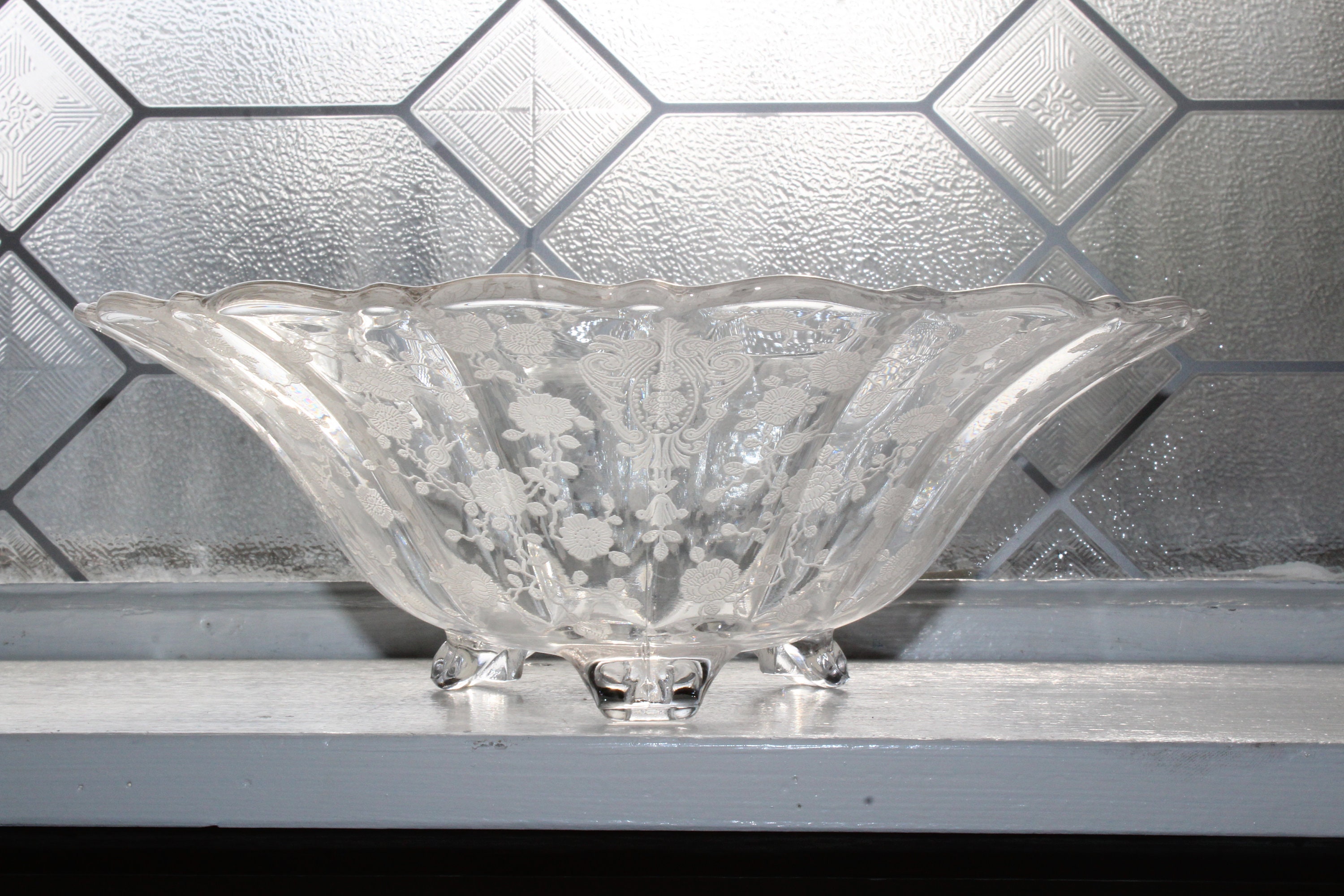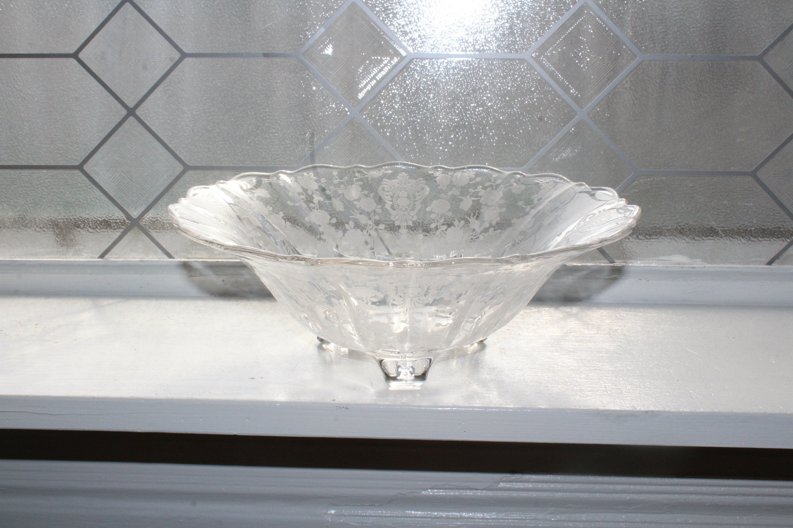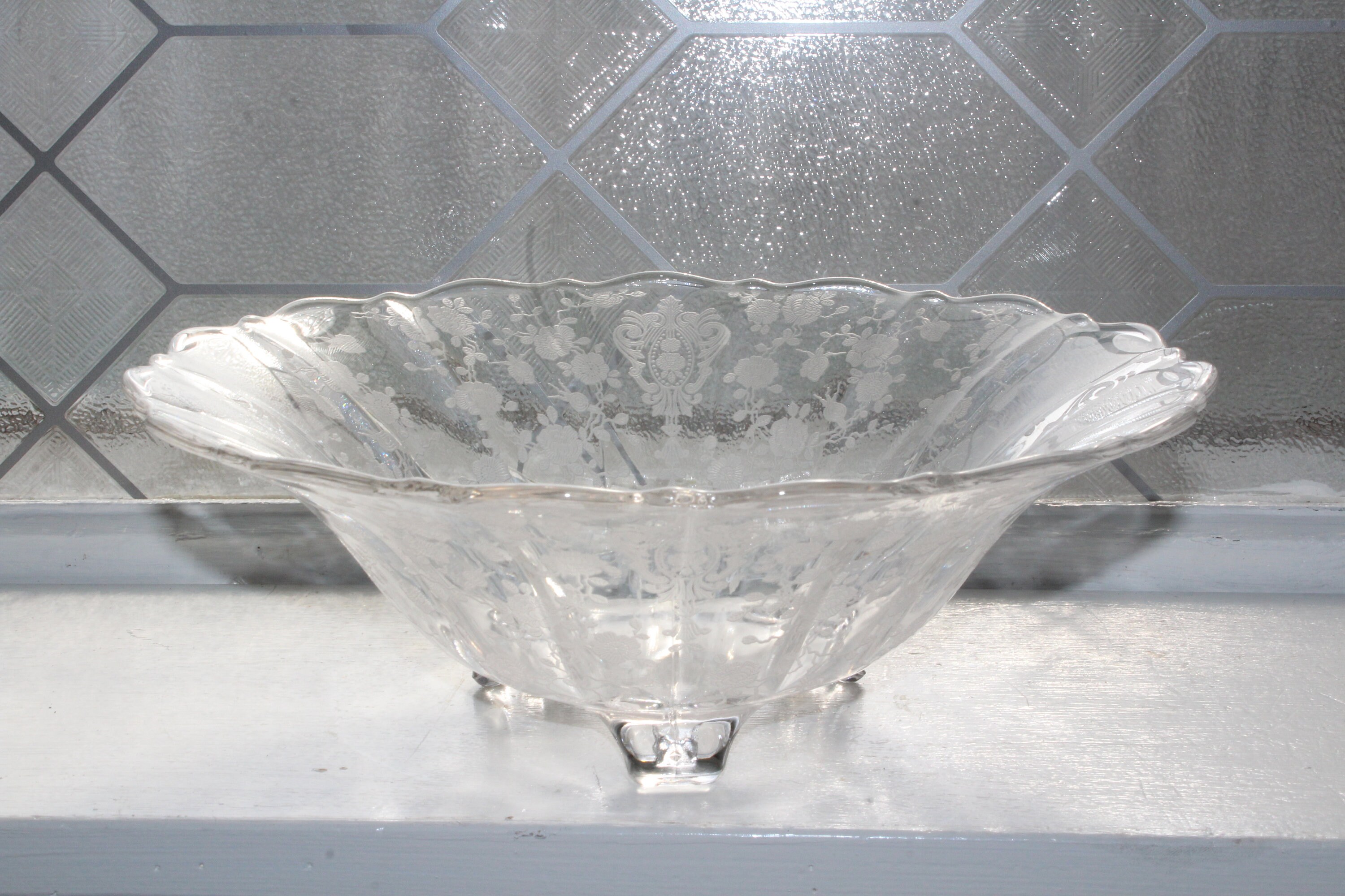 Large vintage Cambridge etched glass Rose Point footed bowl, in excellent condition. It measures 10" wide x 3 1/2" high. No chips or cracks. Perfect for use or display. Enjoy!