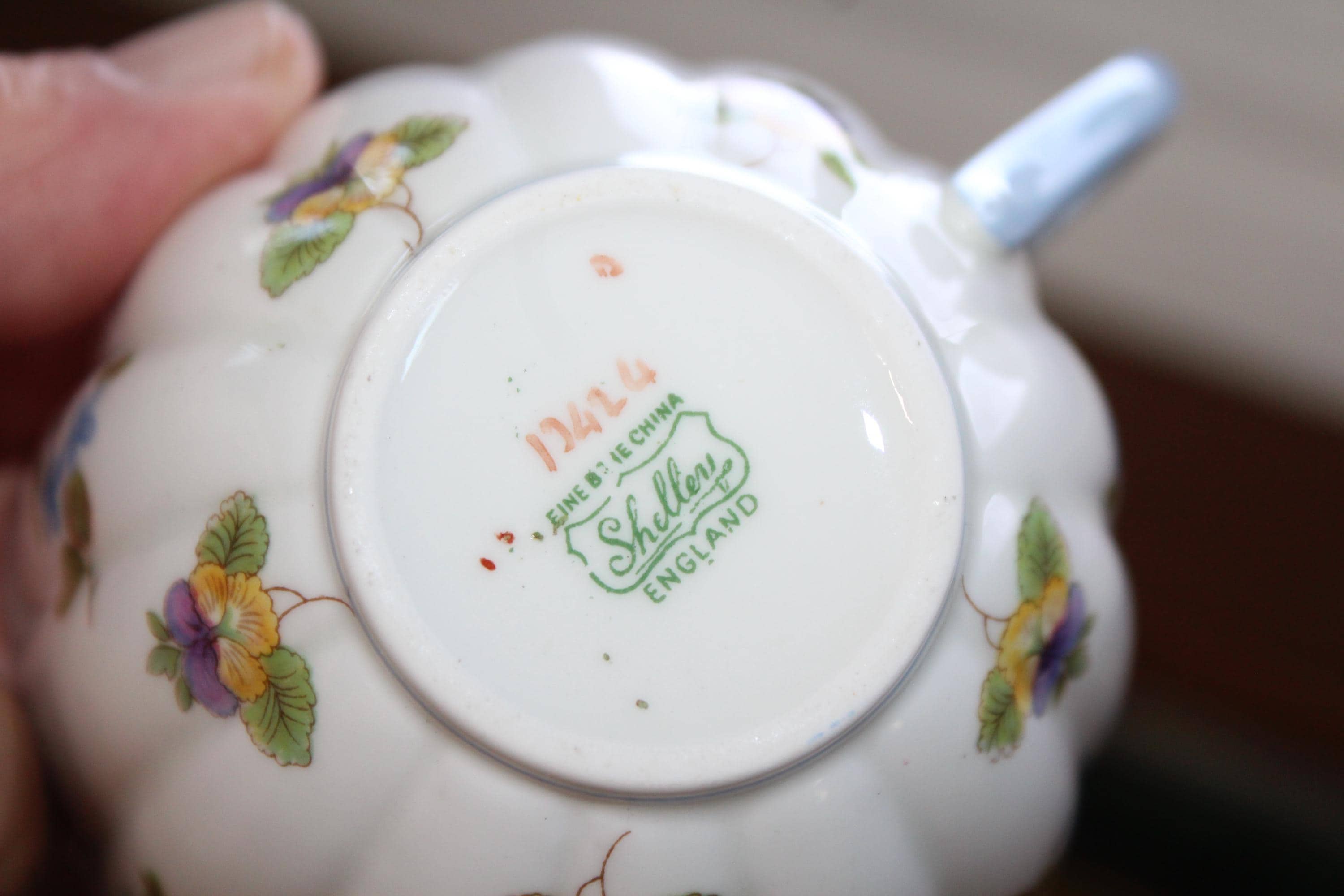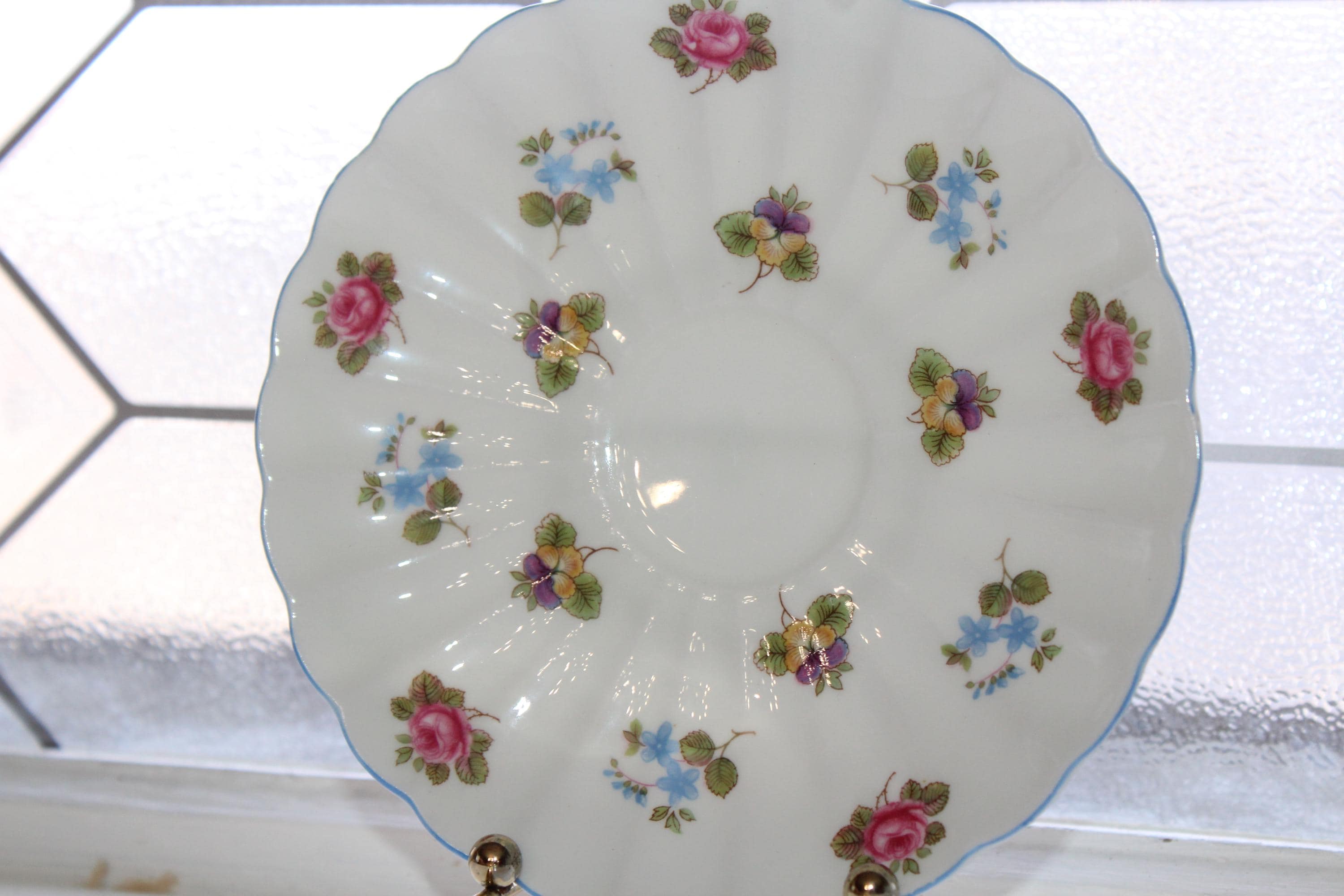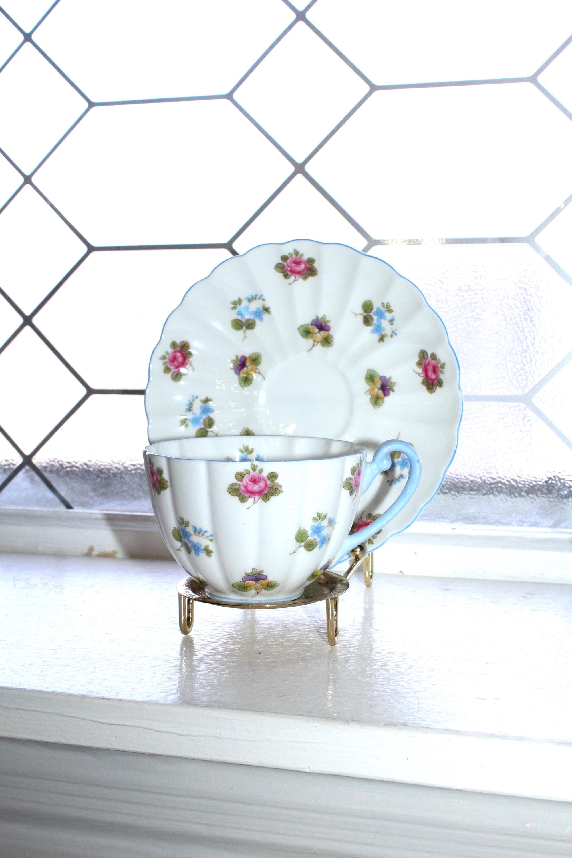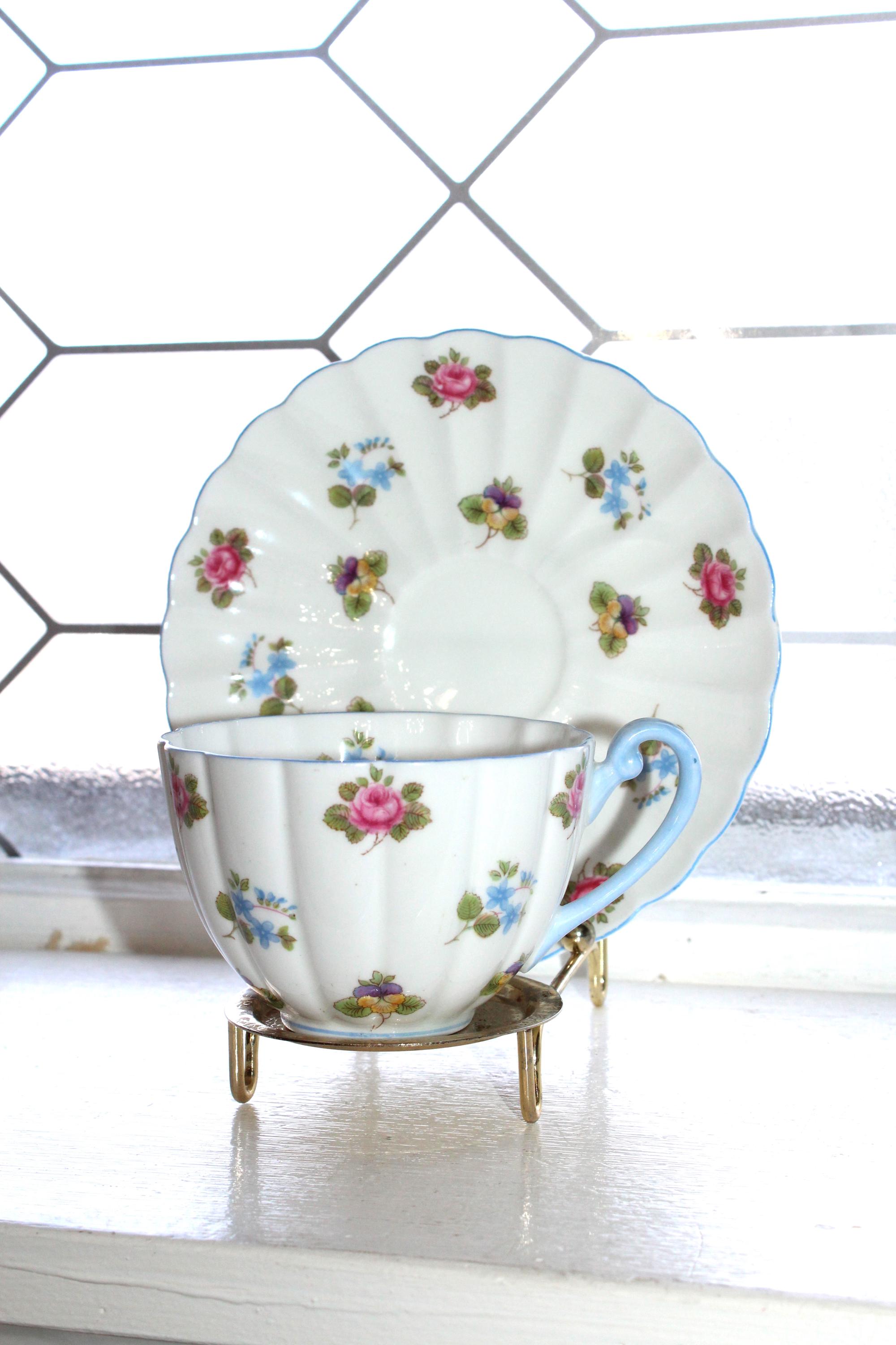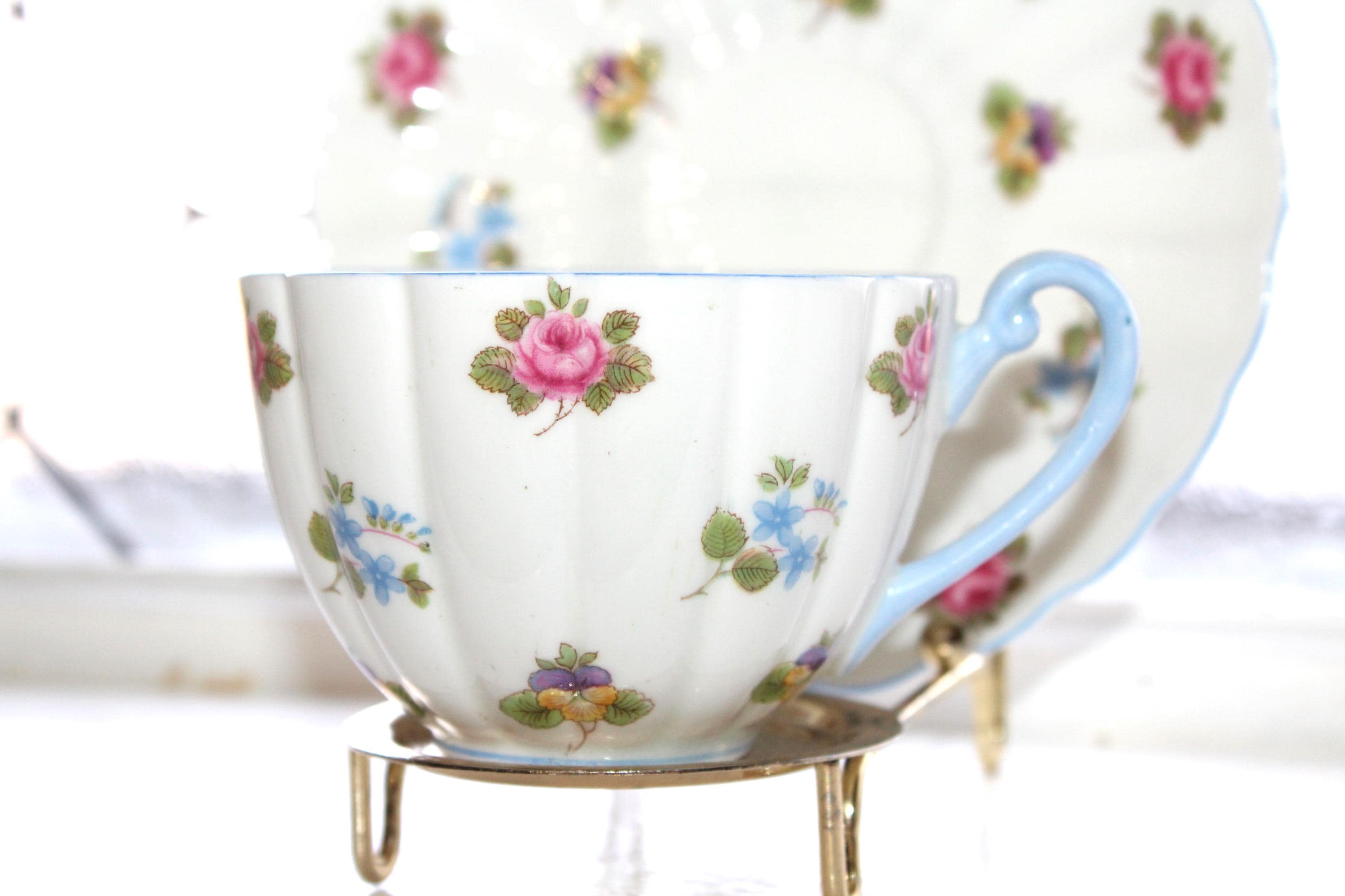 This vintage Shelley Rose Pansy Forget Me Not fine bone china tea cup and saucer set #13424 with blue trim is just gorgeous! It is in mint condition. The cup measures 2 1/4" high x 3 3/8" in diameter and the saucer measures 5 5/8" in diameter. Enjoy!