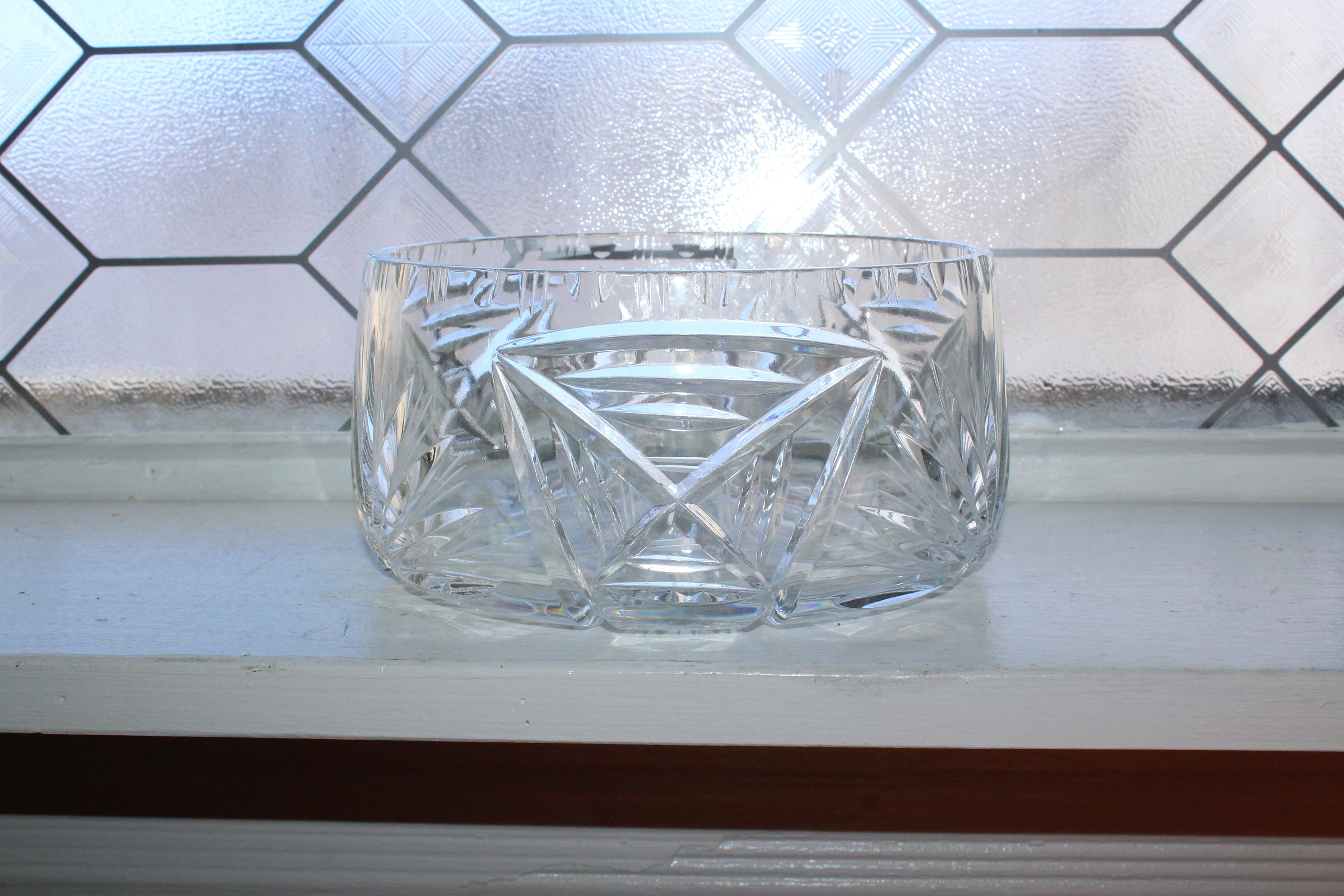 Elegant cut crystal serving bowl, in excellent condition. It measures 3 1/2" high x 6 3/4" wide at the top and weighs just over 3 lbs. No chips or cracks, great for use or display. Enjoy!