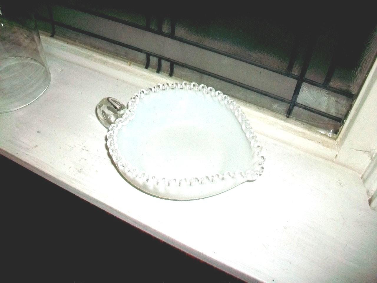 Vintage Fenton Silver Crest heart dish nappy with handle, in excellent condition. The dish measures 8 1/4" long x 6 1/2" wide x 2 1/4" high, and it features the well known clear glass edge of the Silver Crest pattern, crimped around the edge, with clear handle. Enjoy!