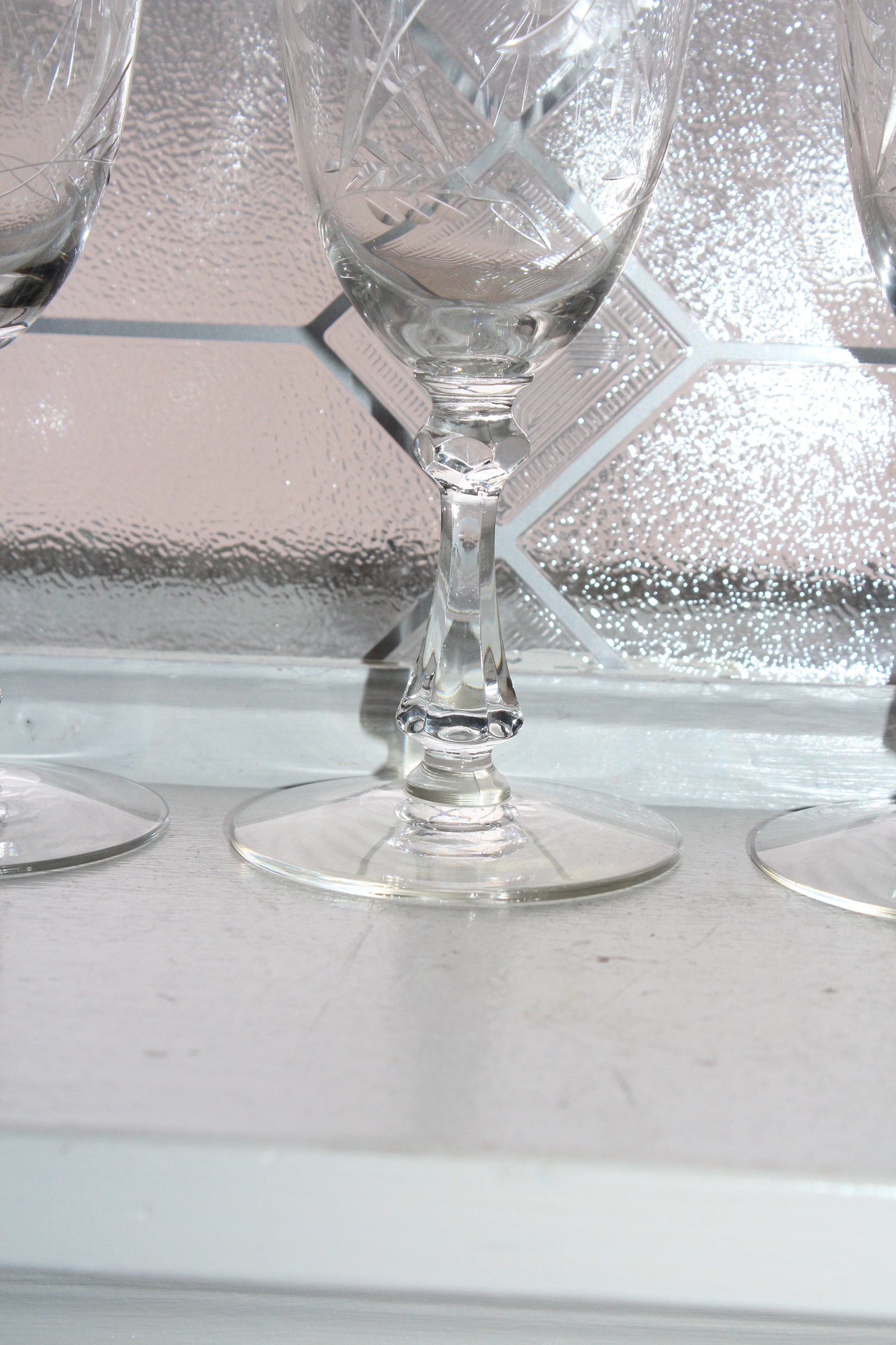 4 vintage 1930s Art Deco Cambridge cut crystal wine glasses, in excellent condition. THERE ARE 3 SETS OF 4 AVAILABLE VIA THE DROP DOWN BOX. They measure 7 1/4" high x 3 1/2" wide at the rim. No chips or cracks, great for use or display. Enjoy!
