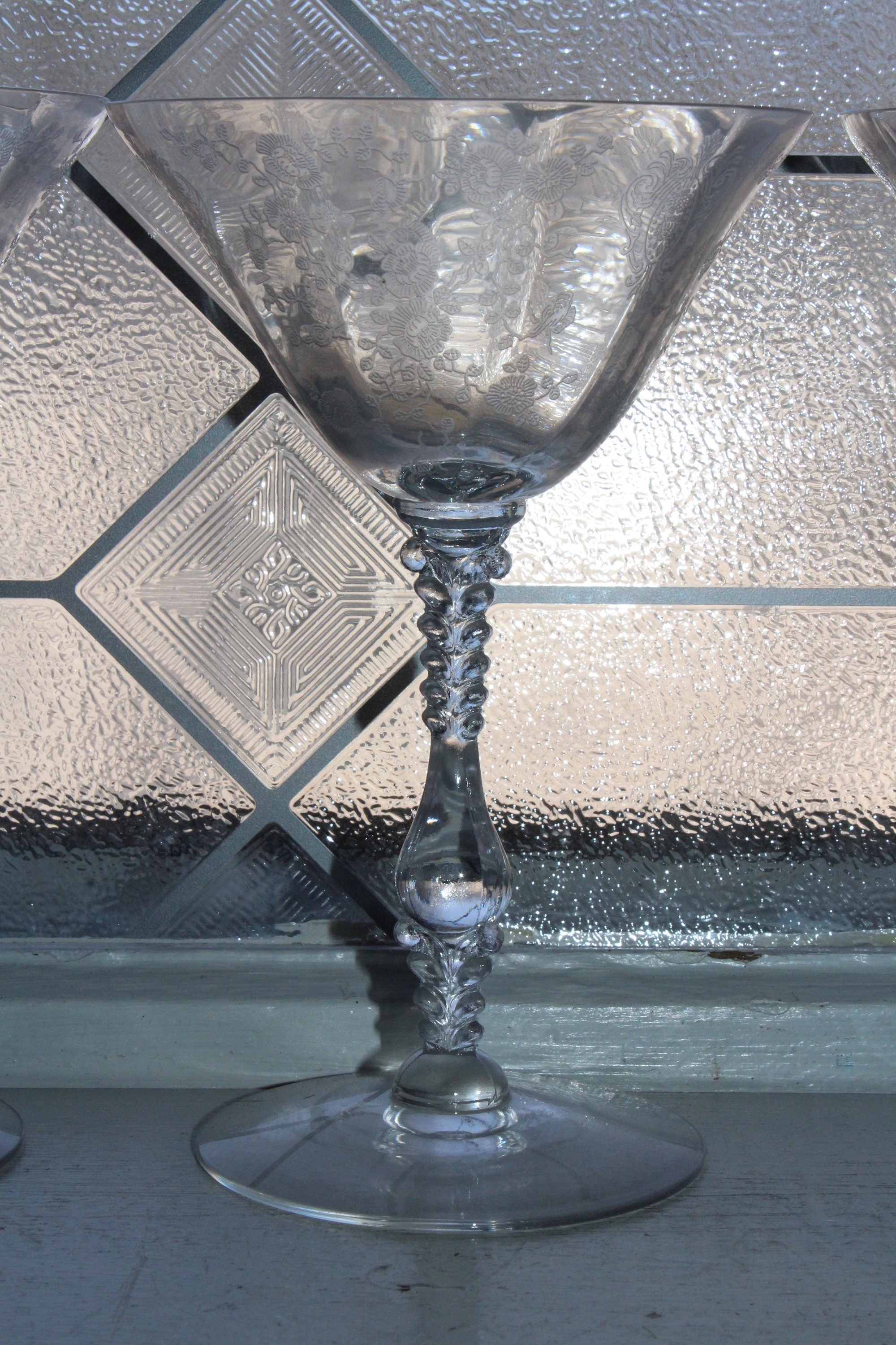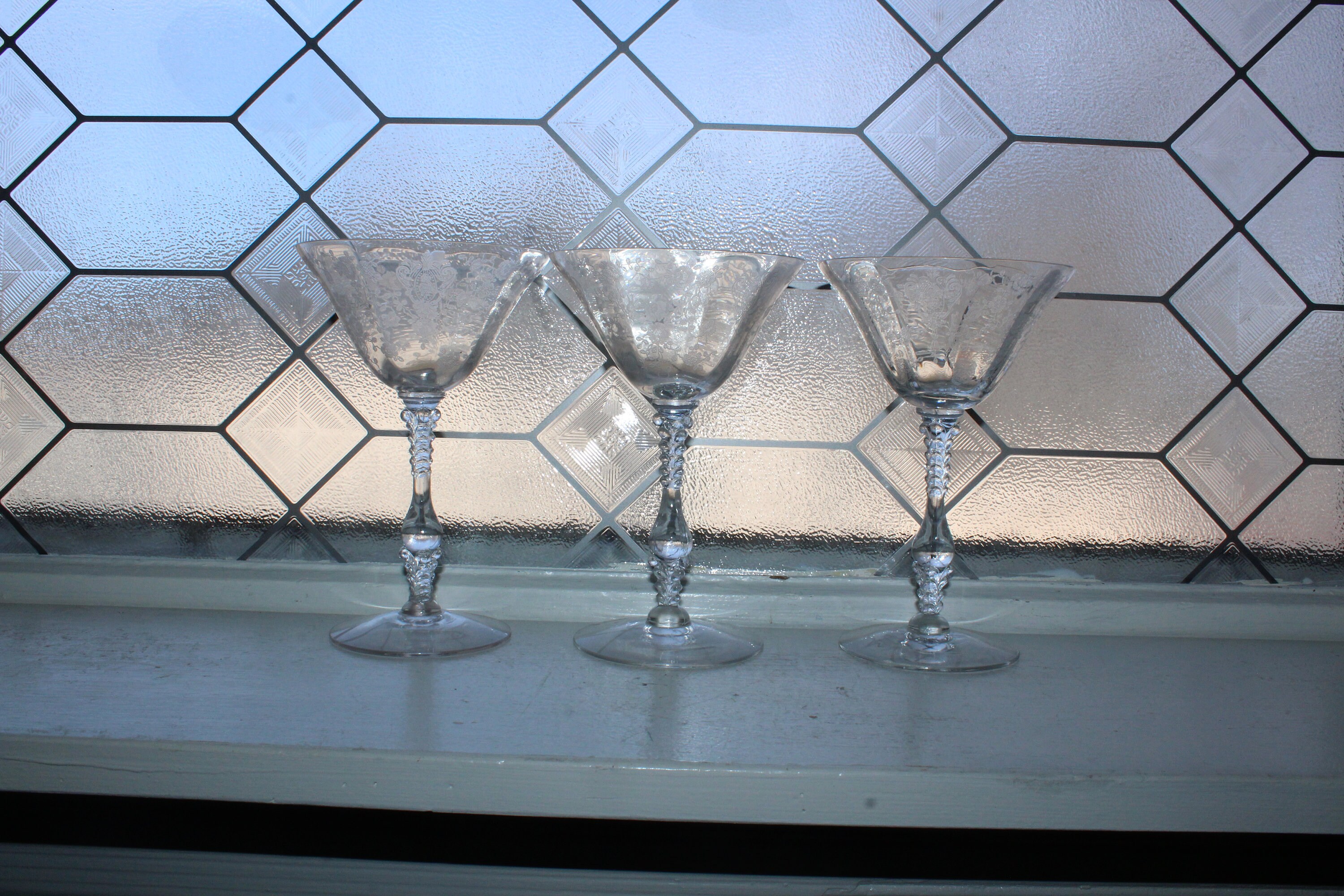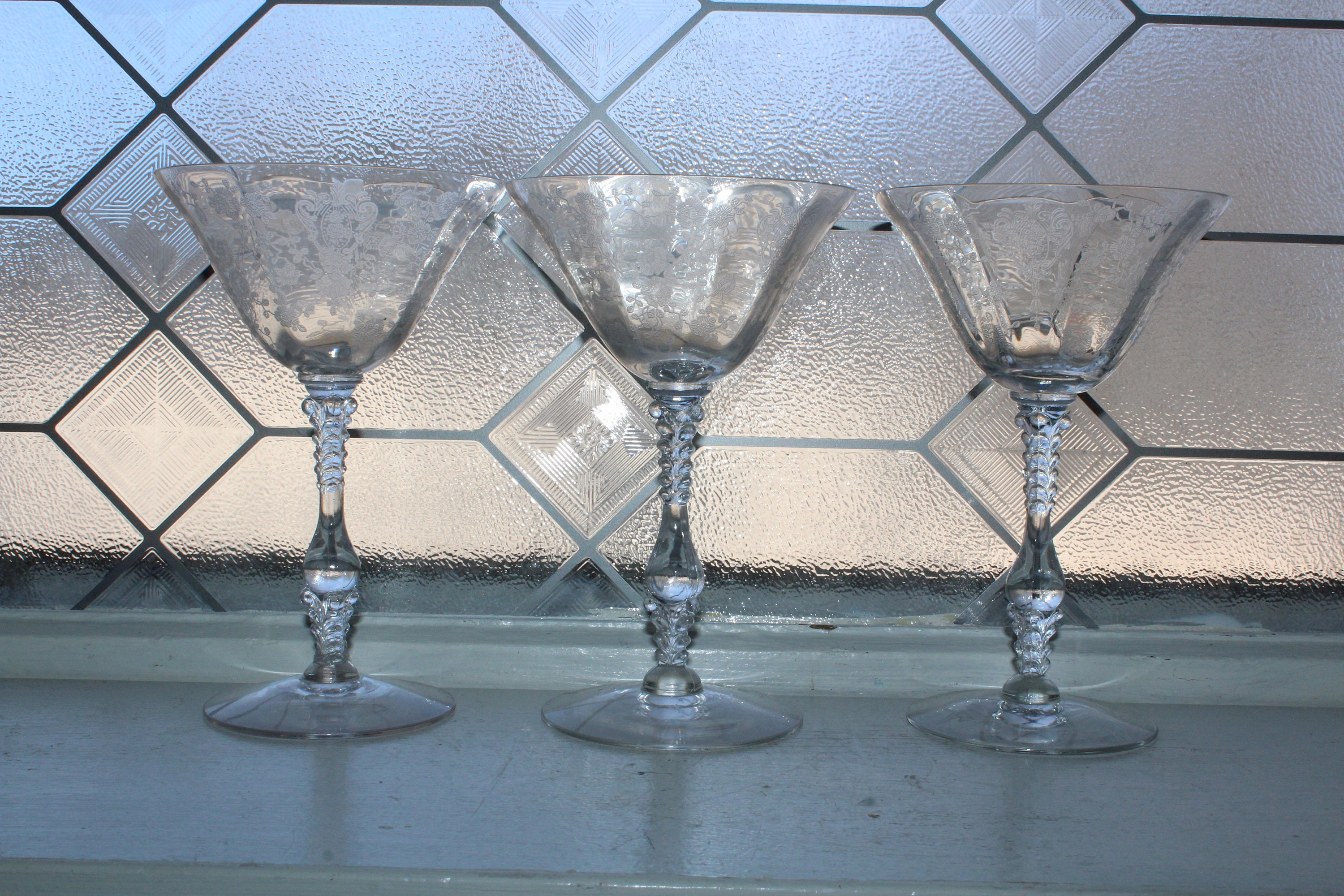 3 vintage Cambridge Rose Point etched glass champagne glasses/tall sherbets, in excellent condition. Each one measures 6 3/8" high x 4 1/8" wide. No chips or cracks. Perfect for use or display. Enjoy!