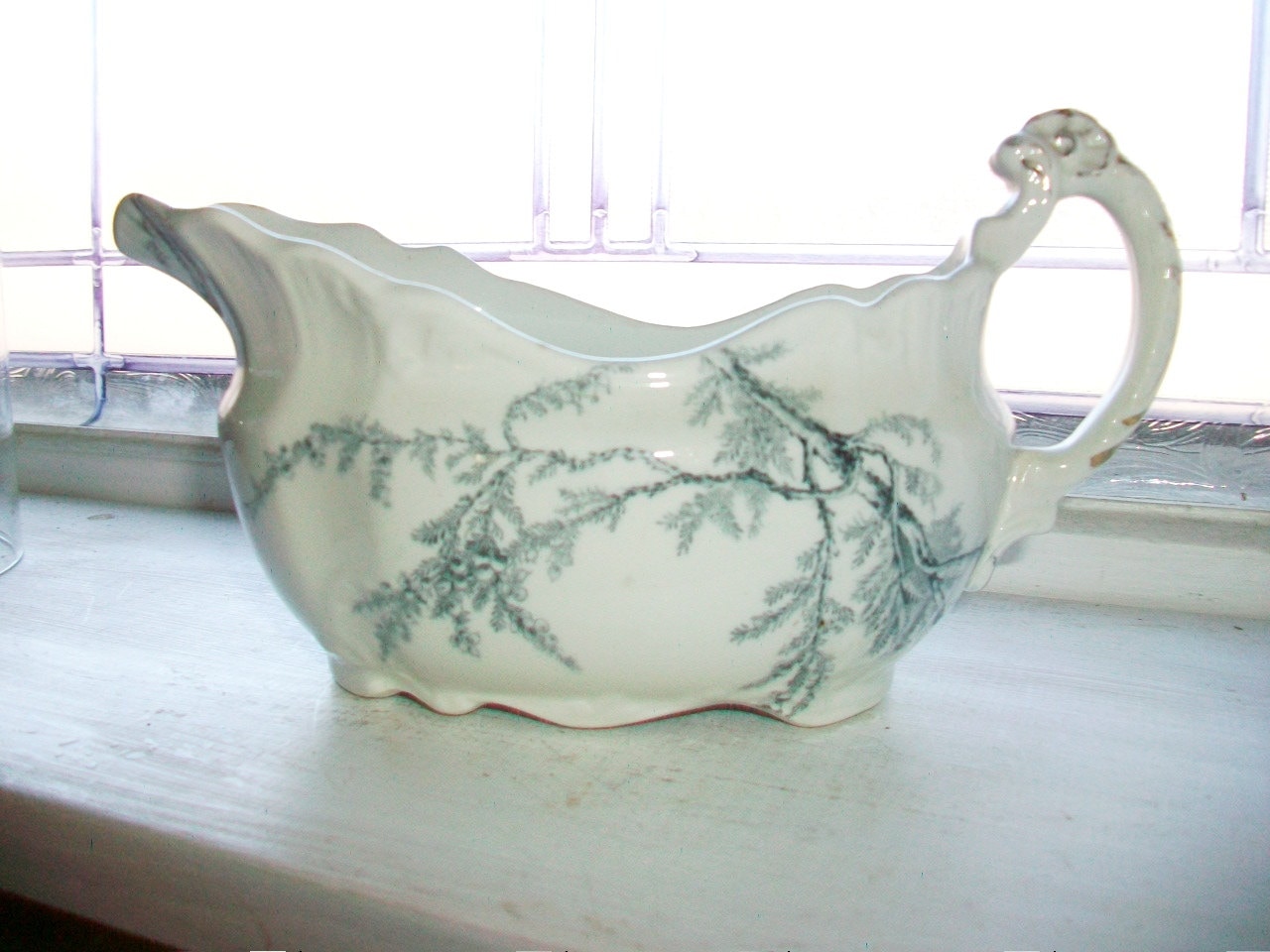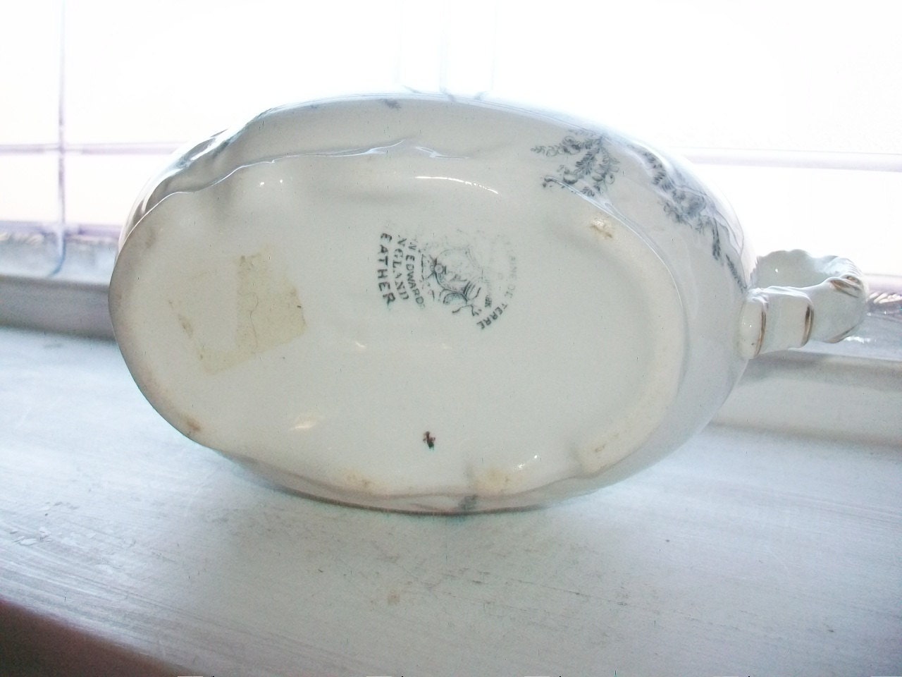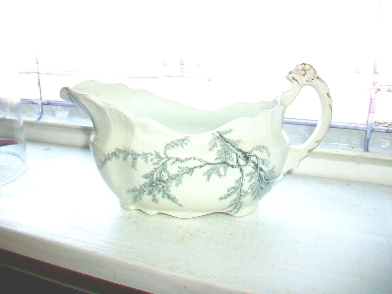 Antique 1800s porcelain de terre gravy boat in the Heather pattern by John Edwards, England, in excellent condition. This blue and white beauty measures 8" long and 4 1/4" high, and it features delicate sprays of blue heather on a white base. No chips or cracks, perfect for the holiday table. Enjoy!