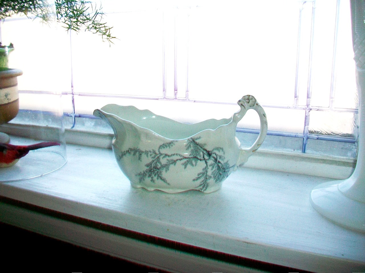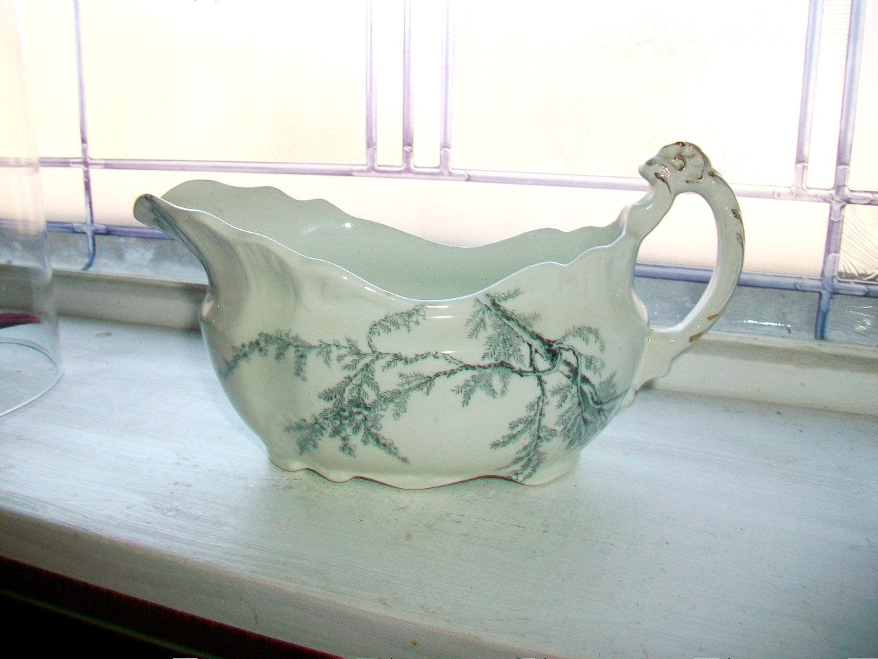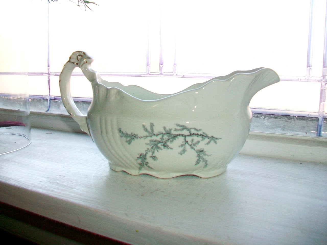 Antique 1800s porcelain de terre gravy boat in the Heather pattern by John Edwards, England, in excellent condition. This blue and white beauty measures 8" long and 4 1/4" high, and it features delicate sprays of blue heather on a white base. No chips or cracks, perfect for the holiday table. Enjoy!