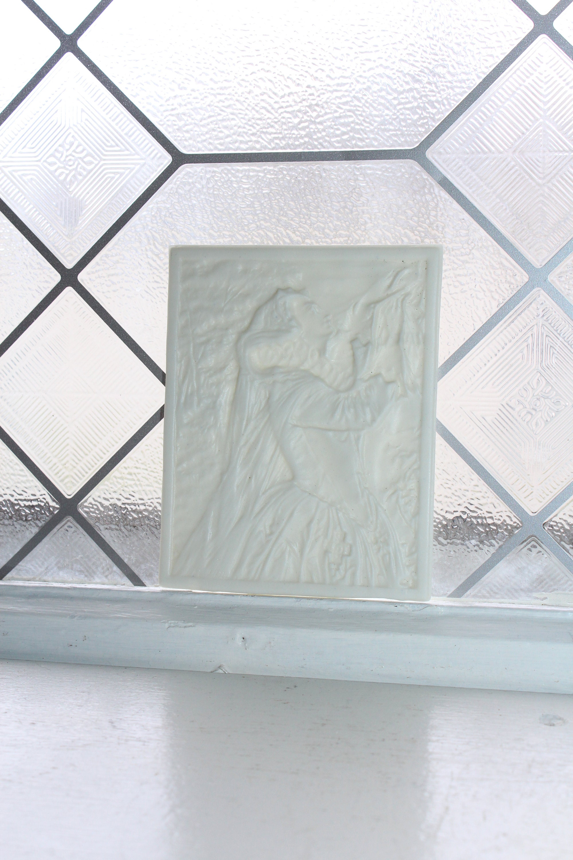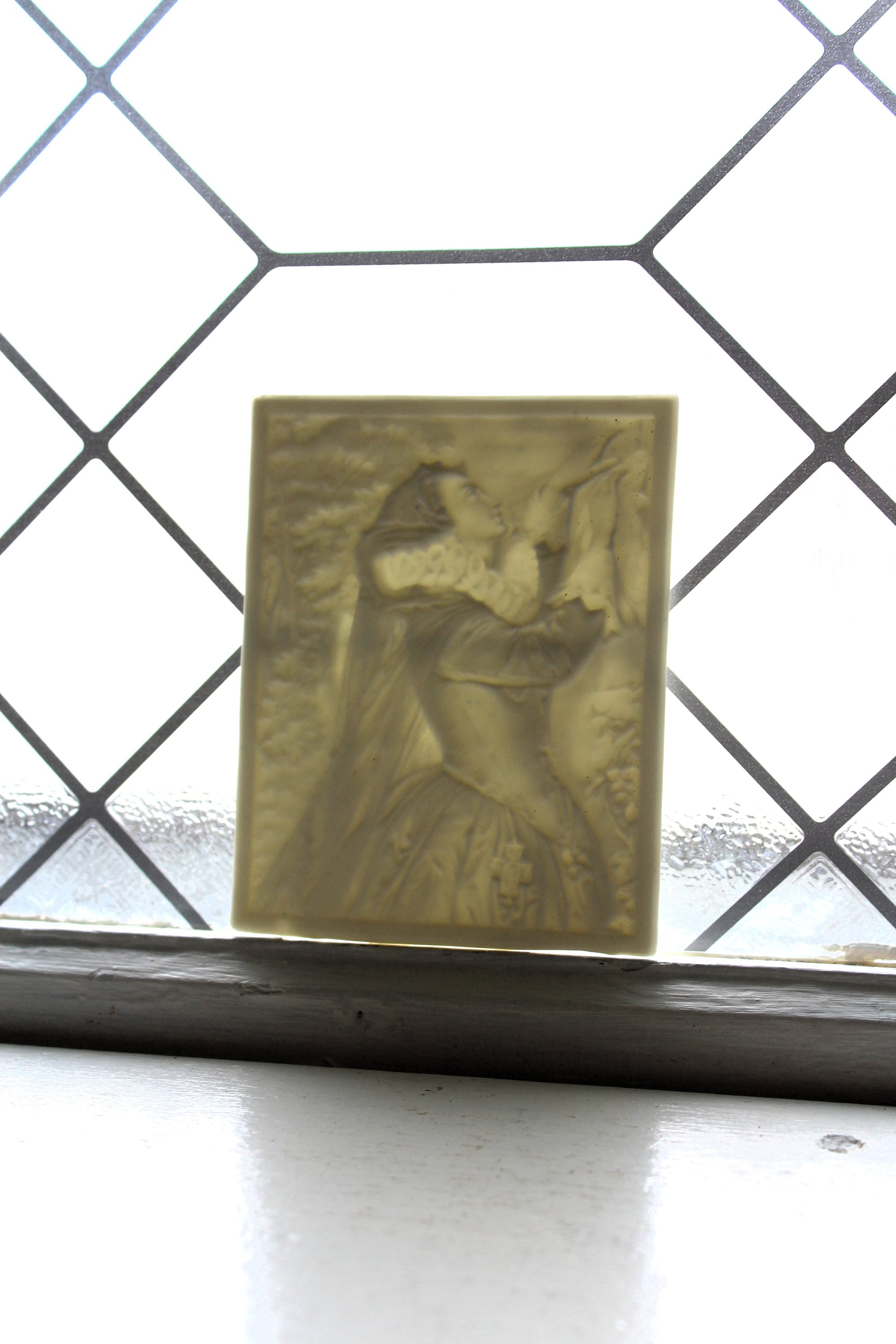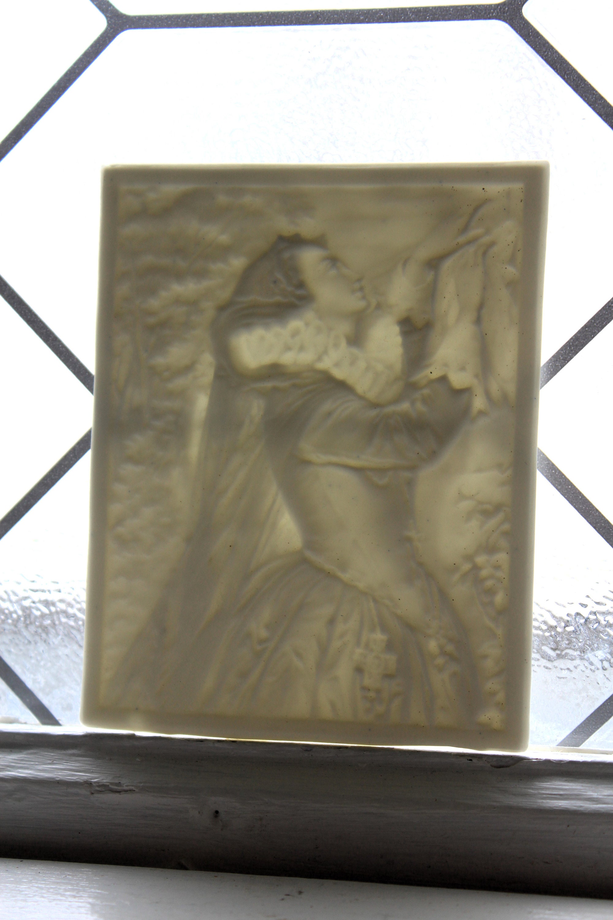 Antique carved see through porcelain lithophane panel / plaque featuring Mary Queen of Scots, in excellent condition. It measures 4 1/4" high x 3 3/8" wide. No chips or cracks, perfect for use or display. No maker's marks. Lithophanes are three-dimensional translucent porcelain plaques which when backlit reveal detailed magical images. Enjoy!