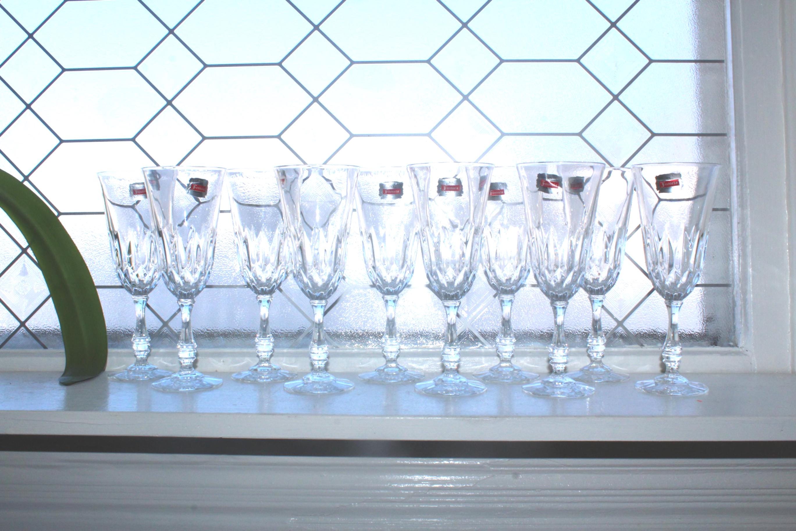 This is a gorgeous set of 10 vintage 1980s Fostoria lead crystal Kimberly champagne flutes. Each measures 7 1/2" high. No chips or cracks, excellent condition. This is a beautiful set and perfect for use or display. Enjoy!