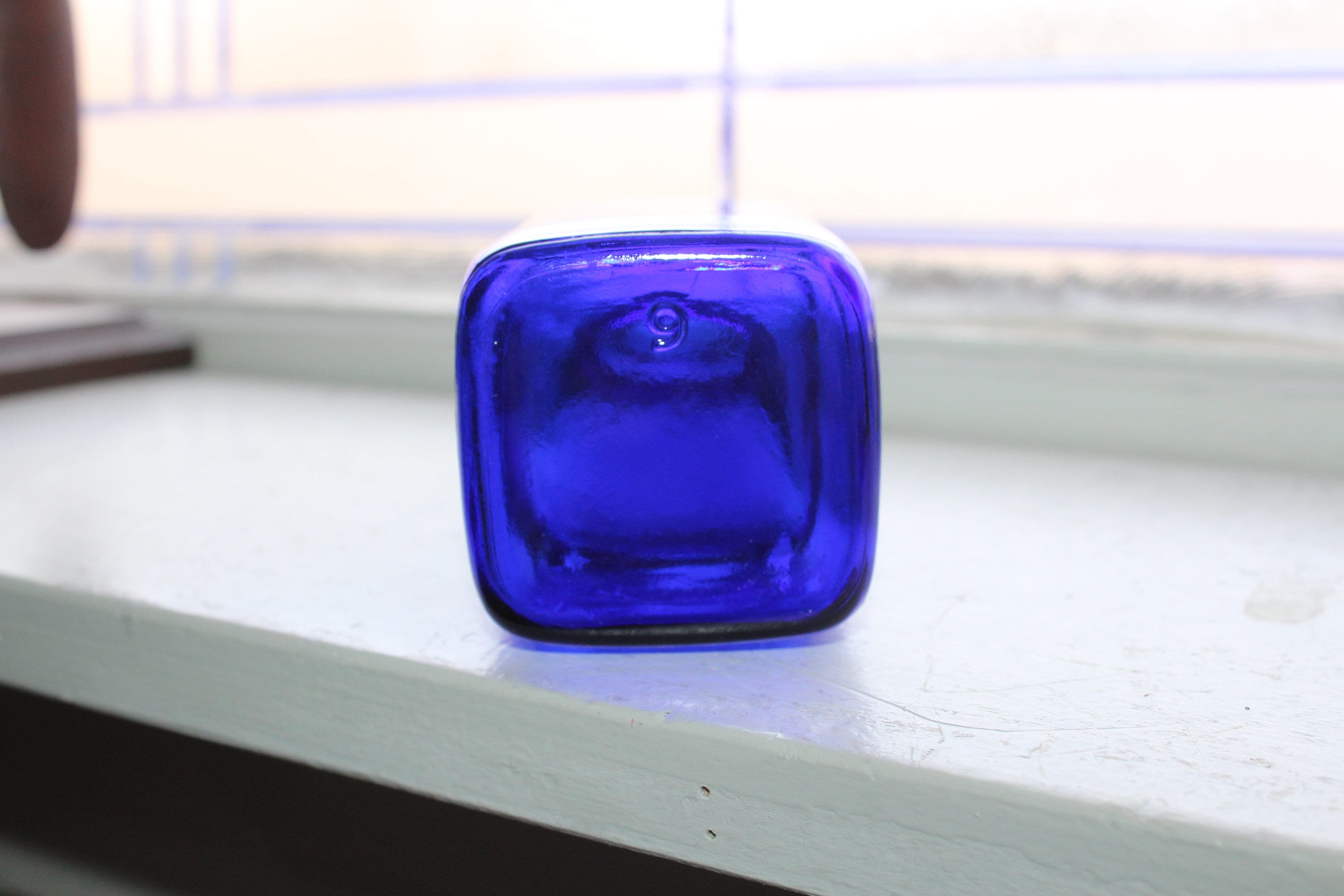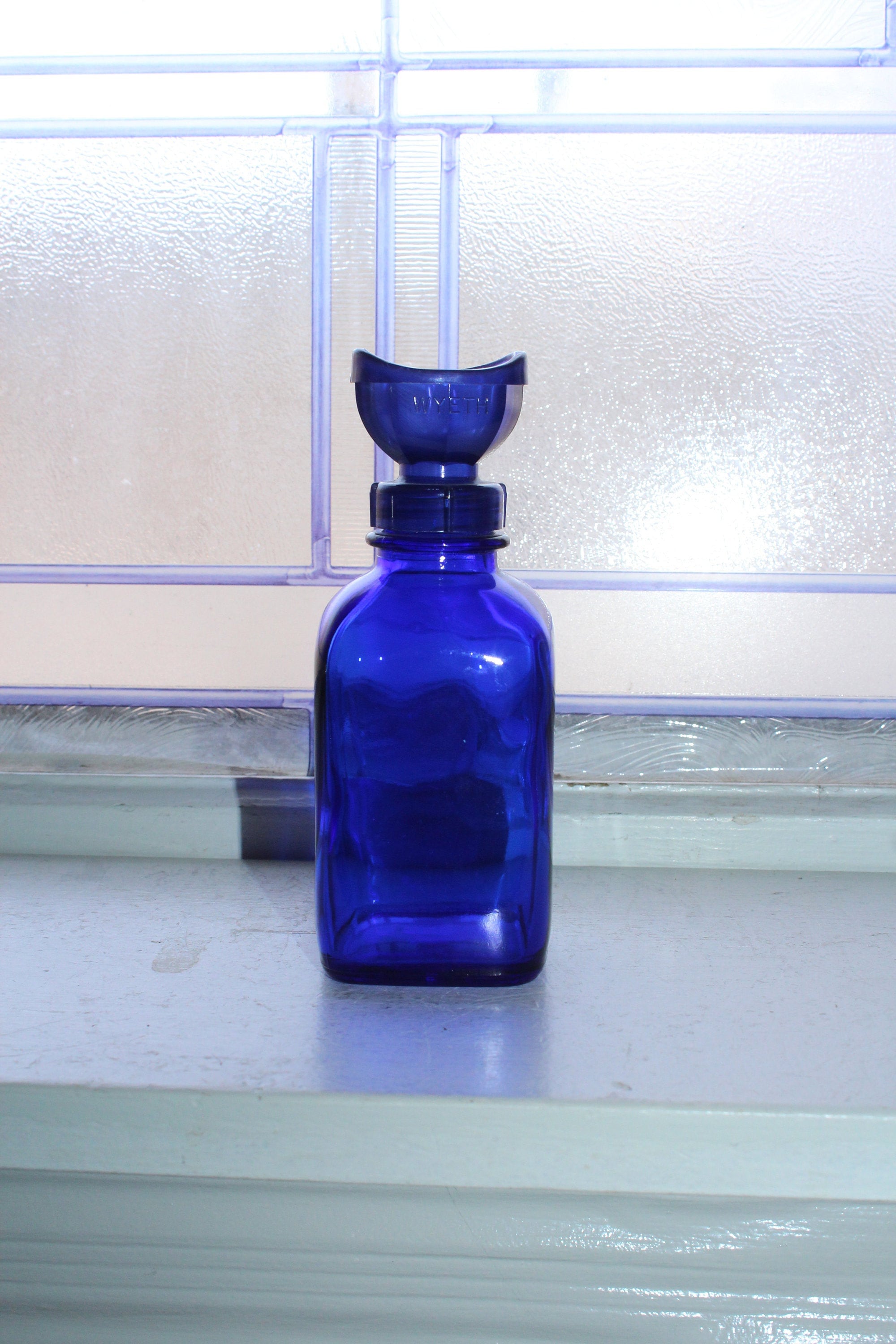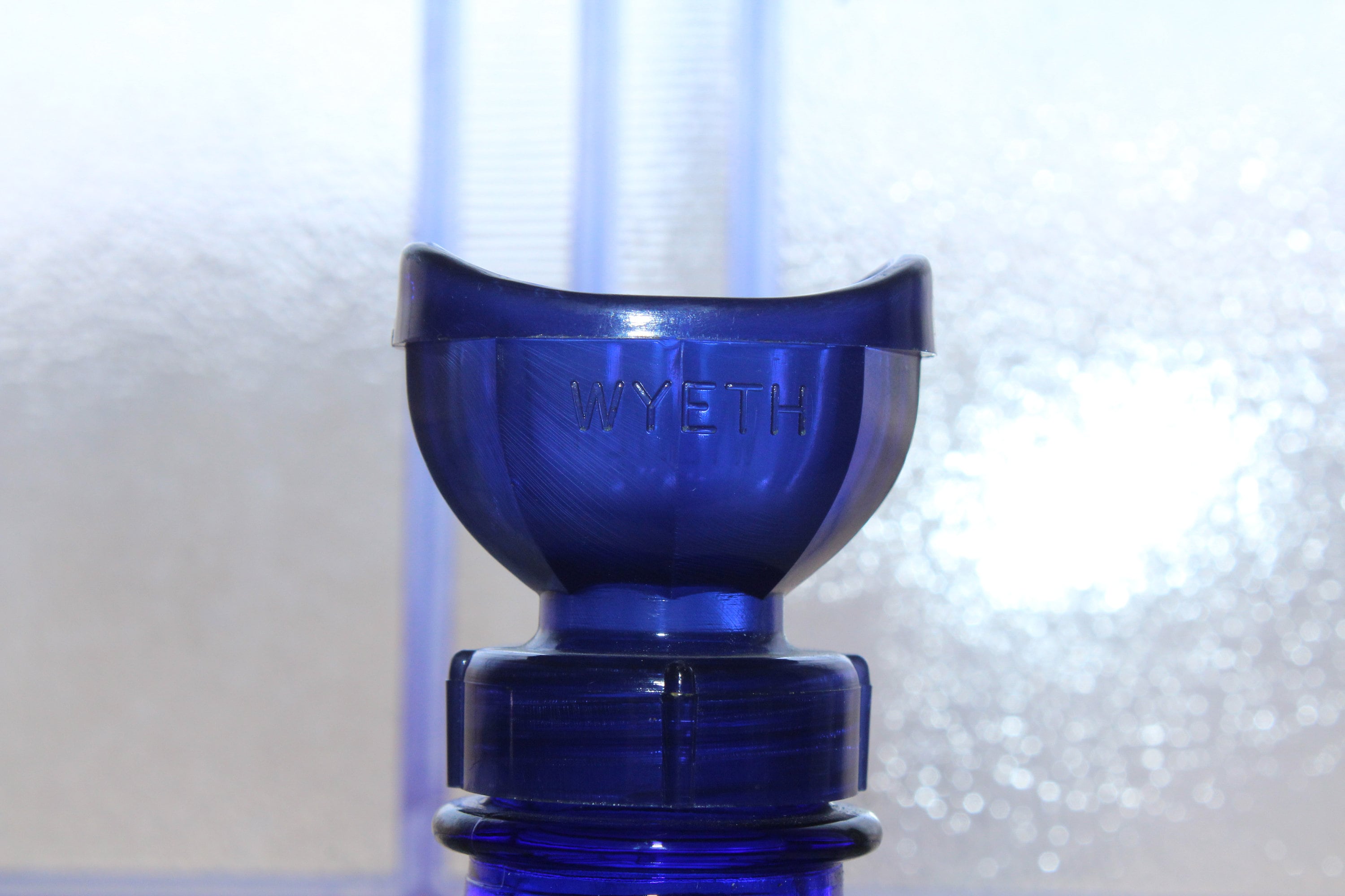 Vintage Wyeth Collyrium cobalt blue glass bottle, an old eye wash bottle, with blue plastic eye wash cup, in very good condition. The bottle measures 5 3/4" high to the top of the cap. No damage, perfect for display. Enjoy!