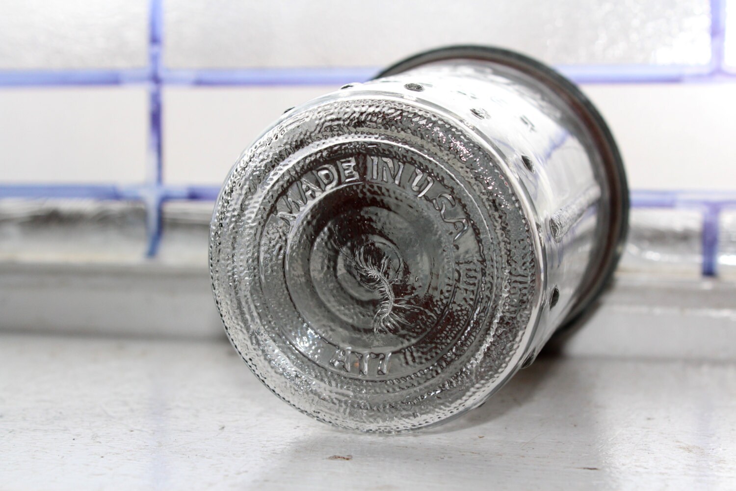 Vintage wide mouth pint sized Ball Freezer Jar with gripper ribs and zinc lid, in good condition. These are not only useful for freezing food, they also make great candle jars. I have several available. They measure 5" high and 3 1/4" wide at the top. Enjoy!