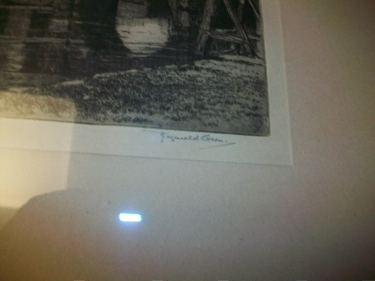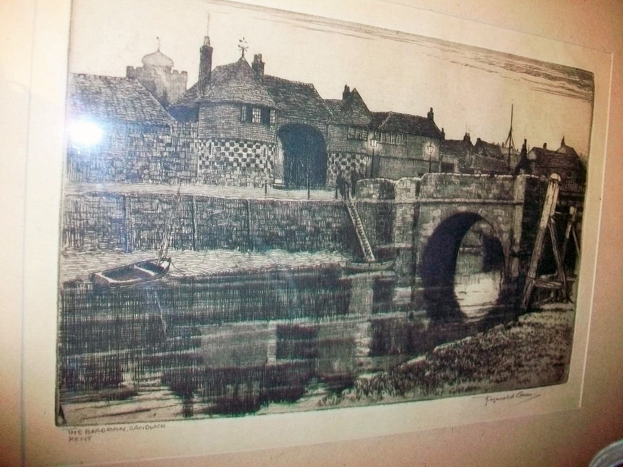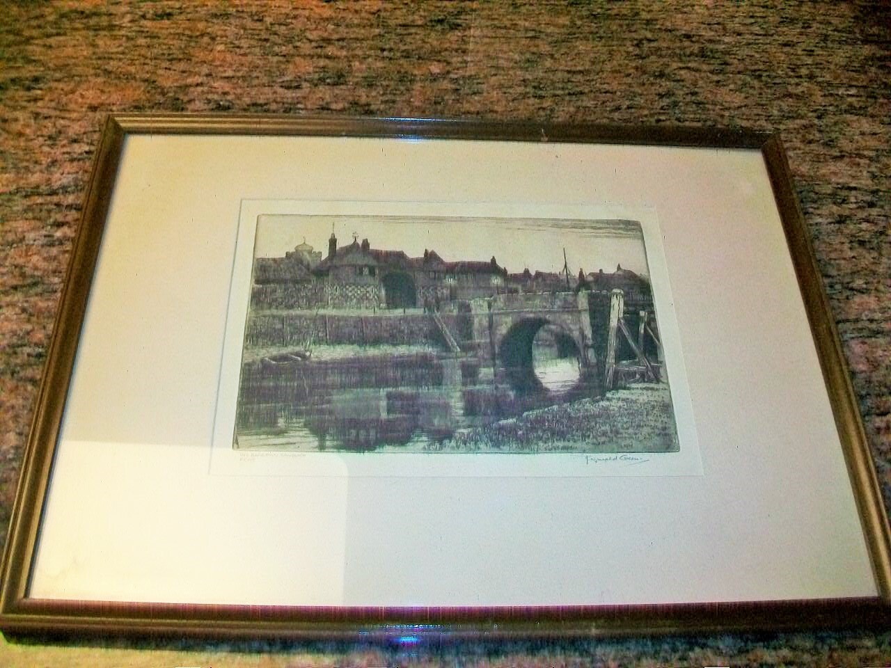 Vintage 1960s etching by Reginald Green, artist signed in pencil. It is the Barbican Gate in Sandwich Kent. The image measures 8 1/4" x 5 1/2" and the frame measures 15 3/4" x 11 1/4". The frame has one small wear mark at the top, image is matted and framed in excellent condition. Enjoy!