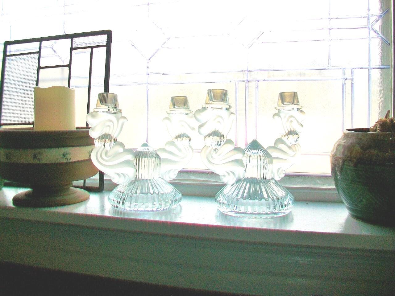 Vintage pair of large glass Art Deco candleholders featuring satin glass arms, in excellent condition. Each one measures 8 1/4" wide x 7 3/4" high and weighs just under 3 pounds. Perfect for use and display. Enjoy!