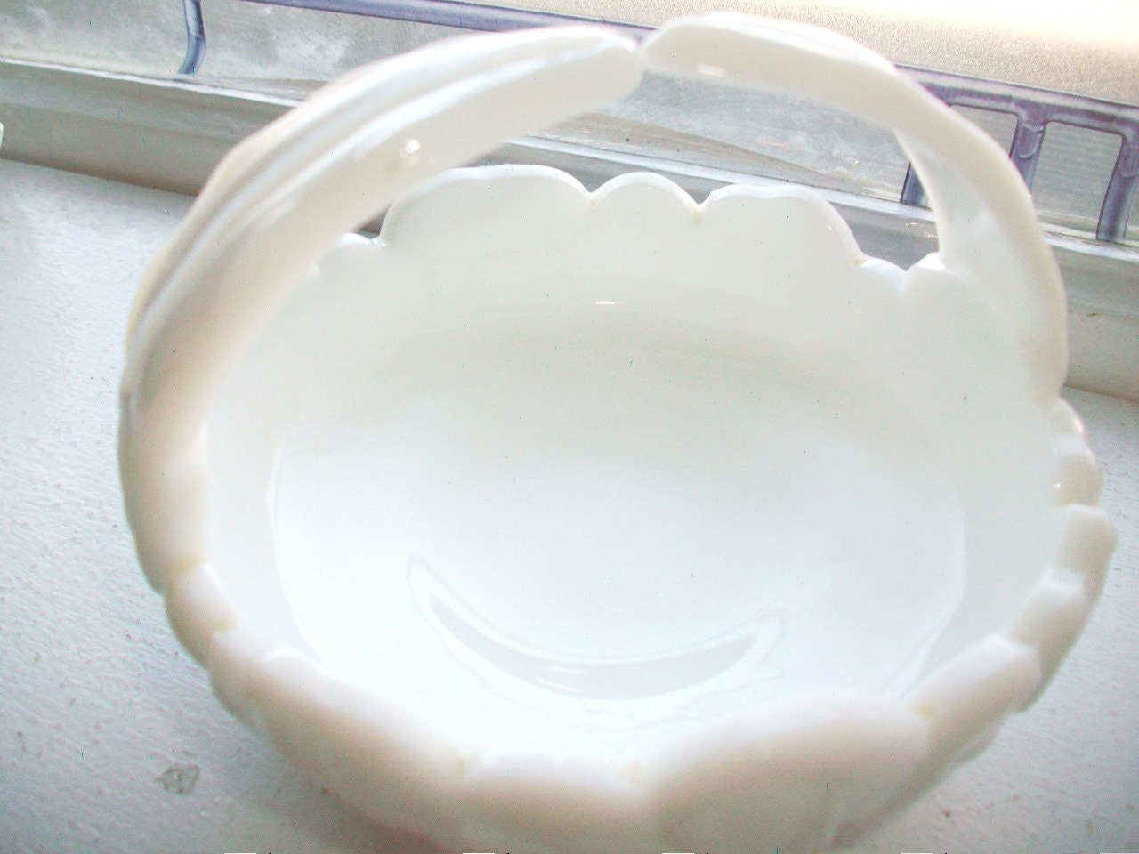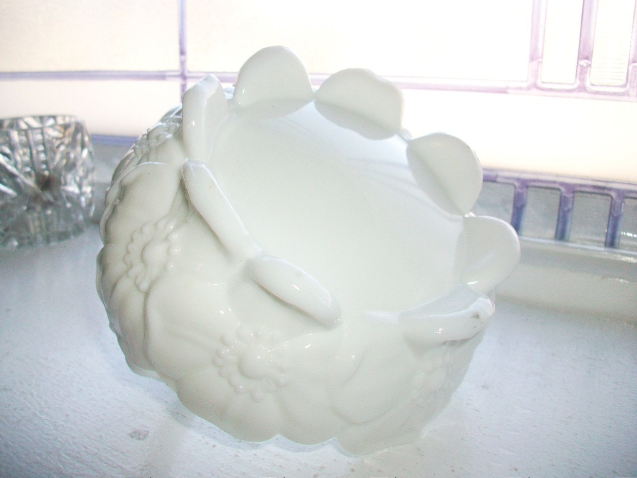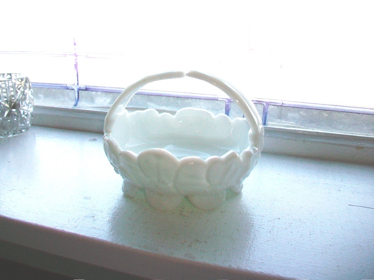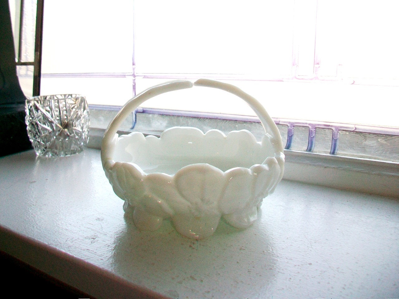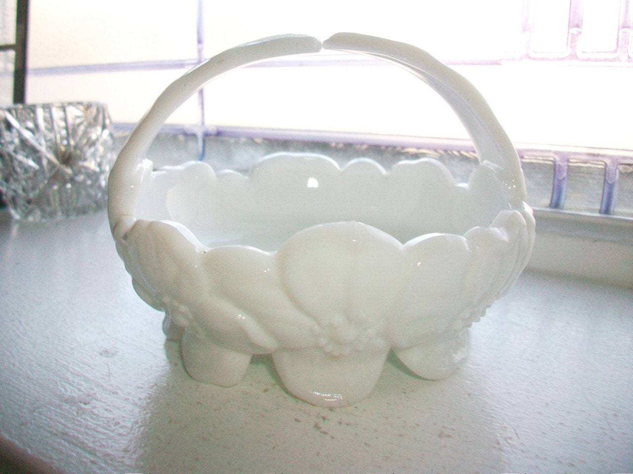 Vintage milk glass candy dish or basket, in excellent condition. This adorable little footed basket features a pattern of daisies around the bowl and measures 4 3/4" in diameter x 3 1/2" high. No chips or cracks, perfect for use or display. Enjoy!