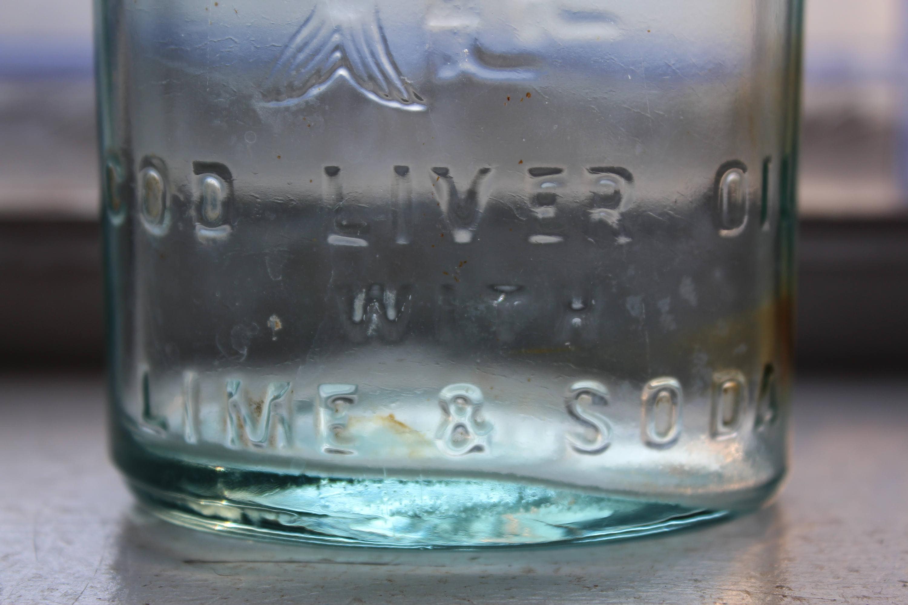 Antique Scotts Emulsion Cod Liver Oil Lime and Soda bottle, light blue, in very good condition. The bottle measures 9 1/4" high and has no chips or cracks. Enjoy!