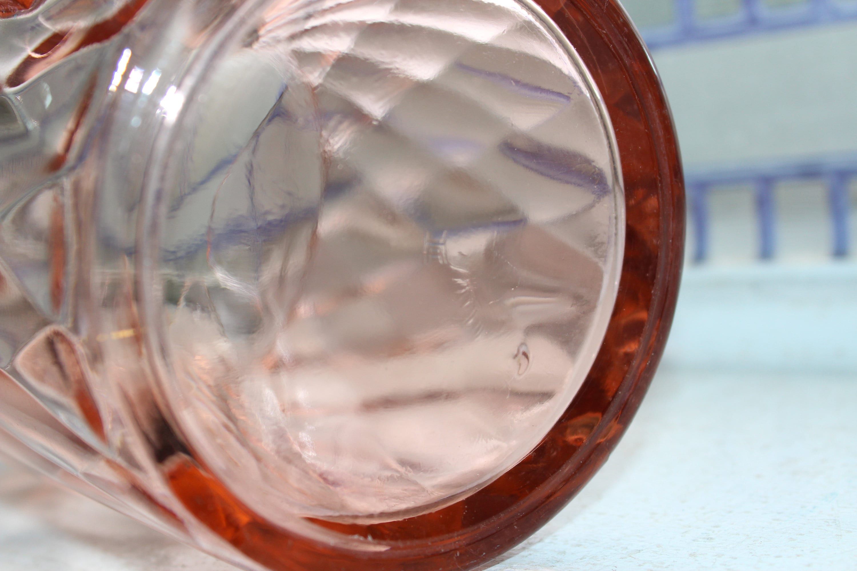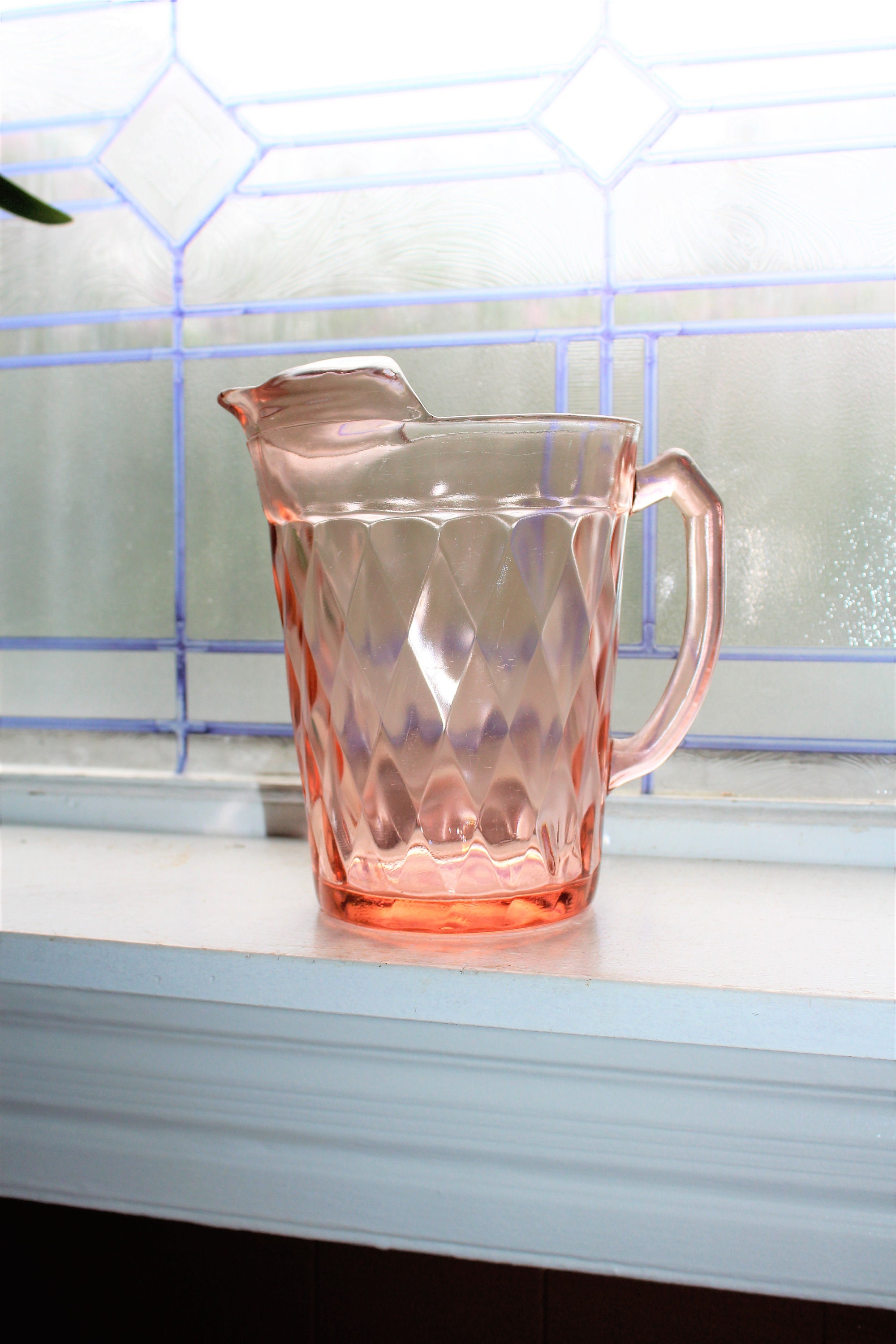 Vintage 1930s pink depression glass pitcher with ice lip, in the Diamond Optic pattern by Hazel Atlas, in good condition. The pitcher measures 8" high. No chips or cracks, great for use or display. Enjoy!
