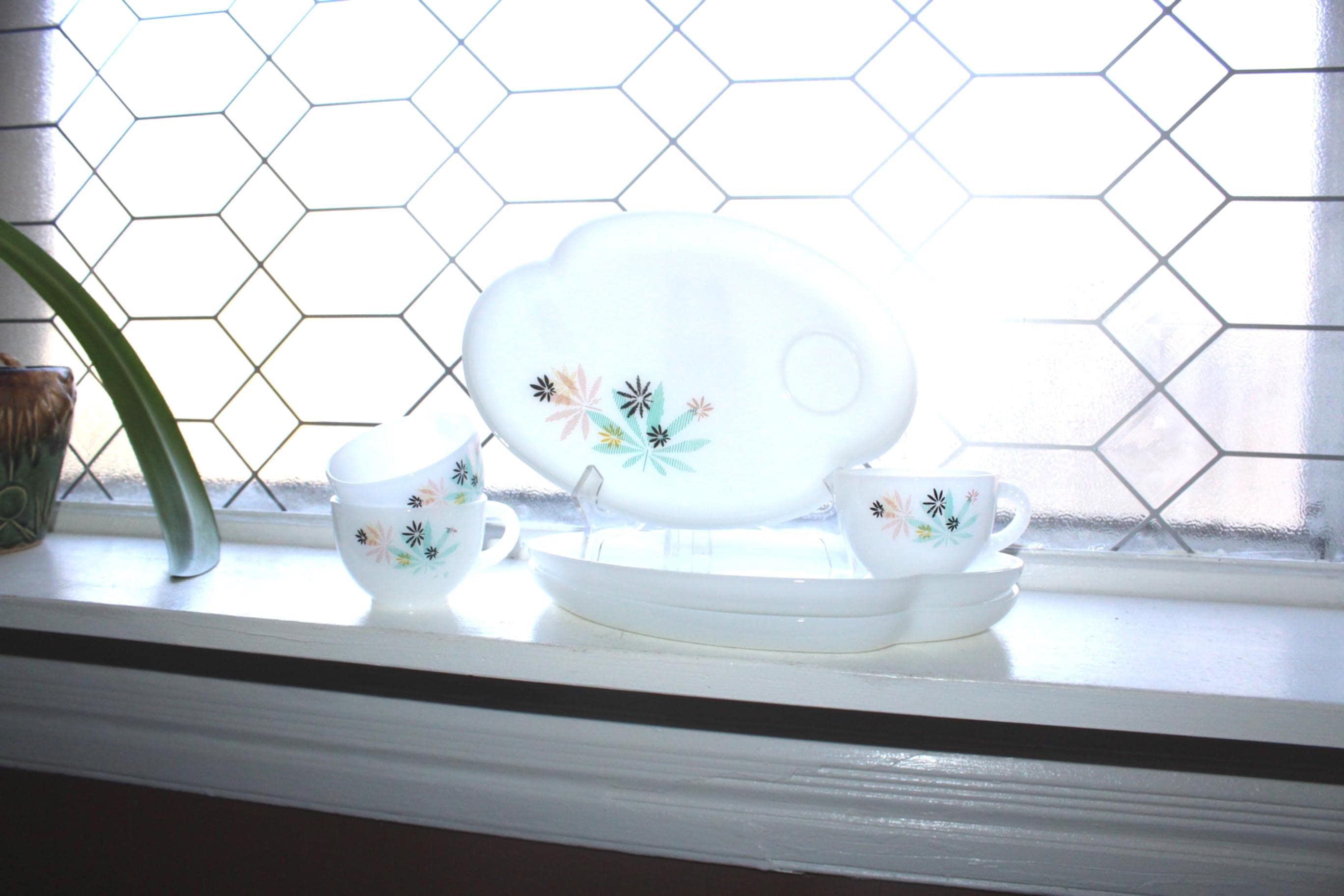 Vintage 1950s Atomic Flower or Patio 6 piece white milk glass luncheon plates and cups decorated with pastel flowers that look like pot leaves, 3 place settings made by Federal Glass, perfect for afternoon tea or a nice luncheon in the sun! Each plate measures 10 1/4" x 7 1/4". The set is in very good condition with no chips or cracks, just a bit of wear on the flowers on one plate. Enjoy!