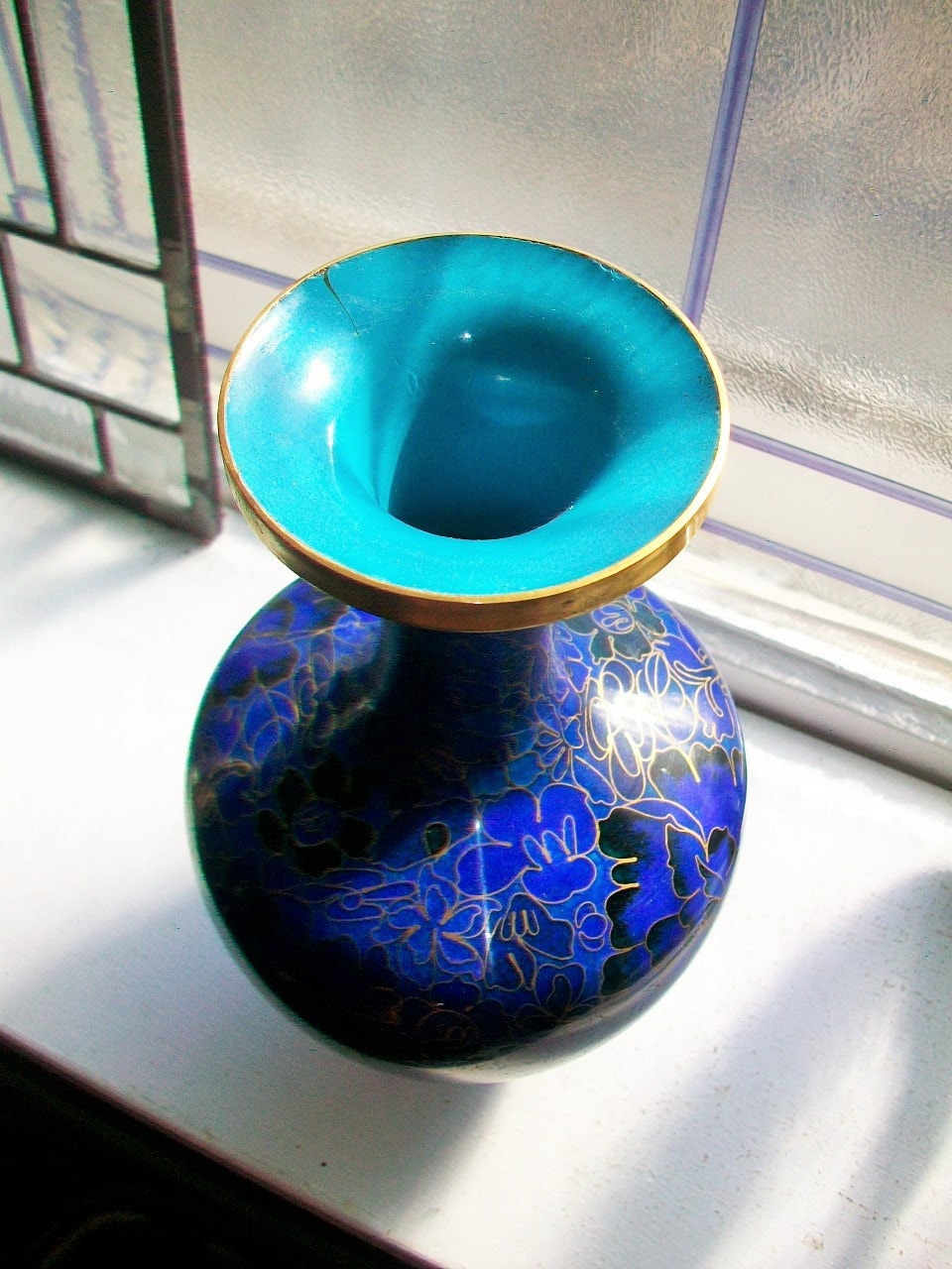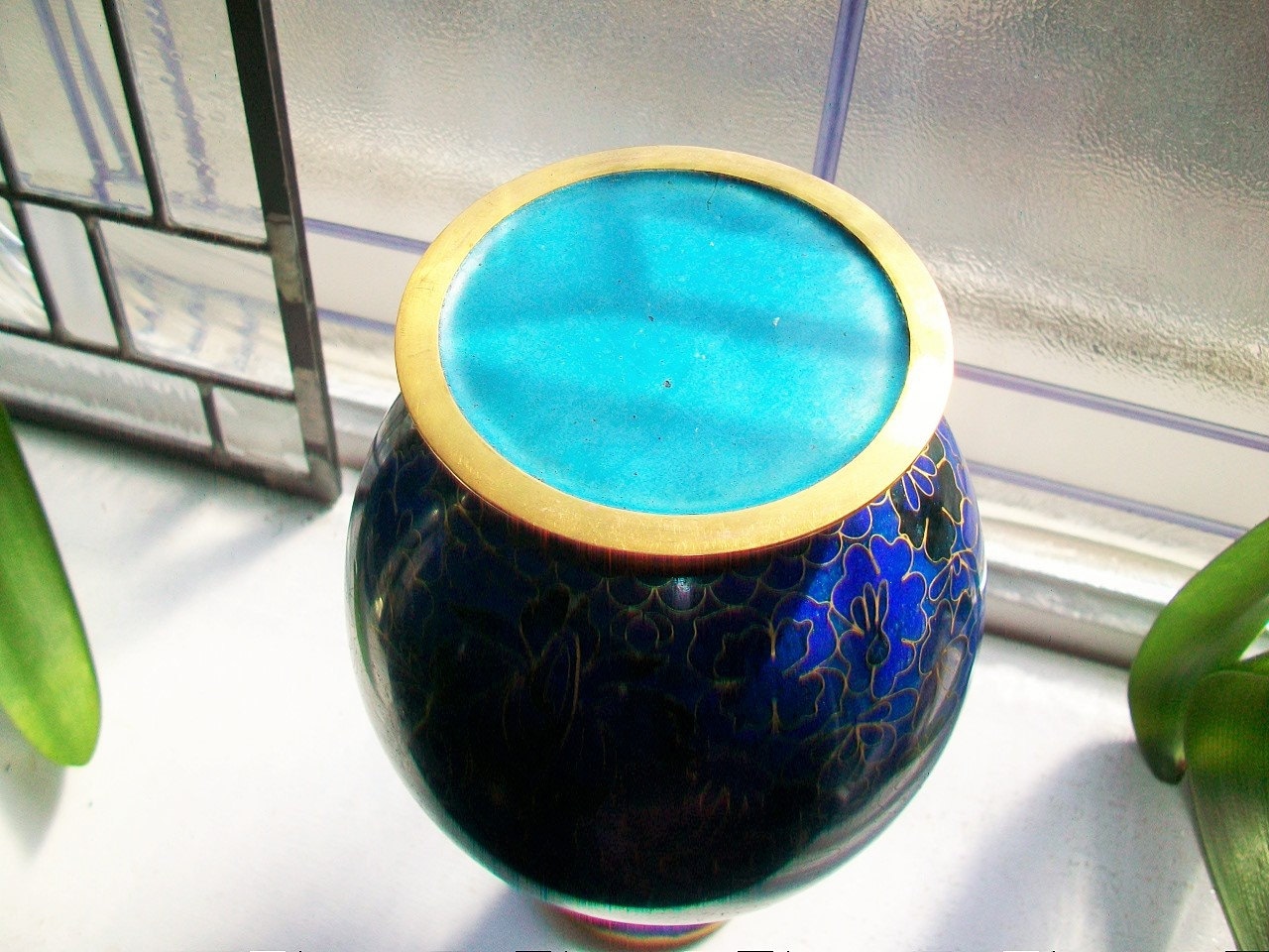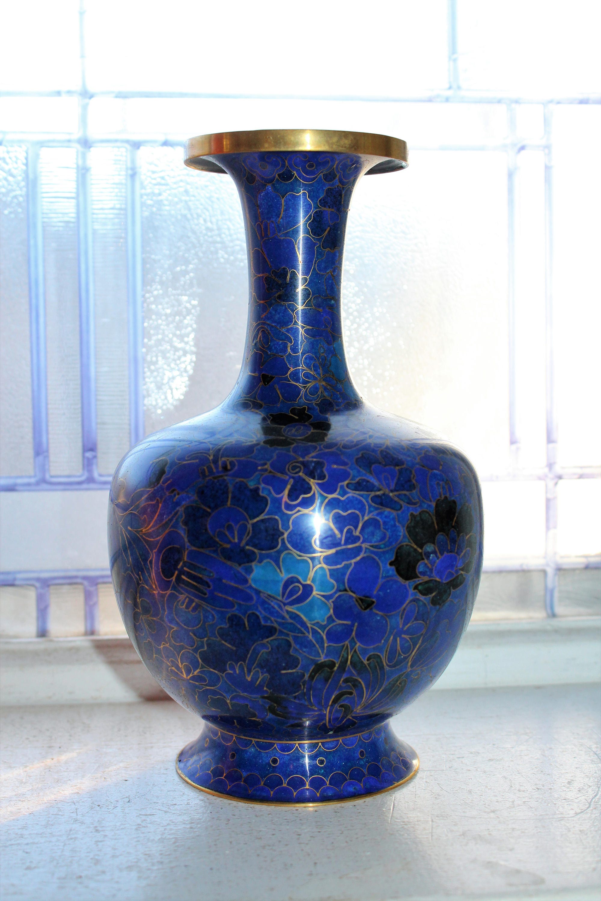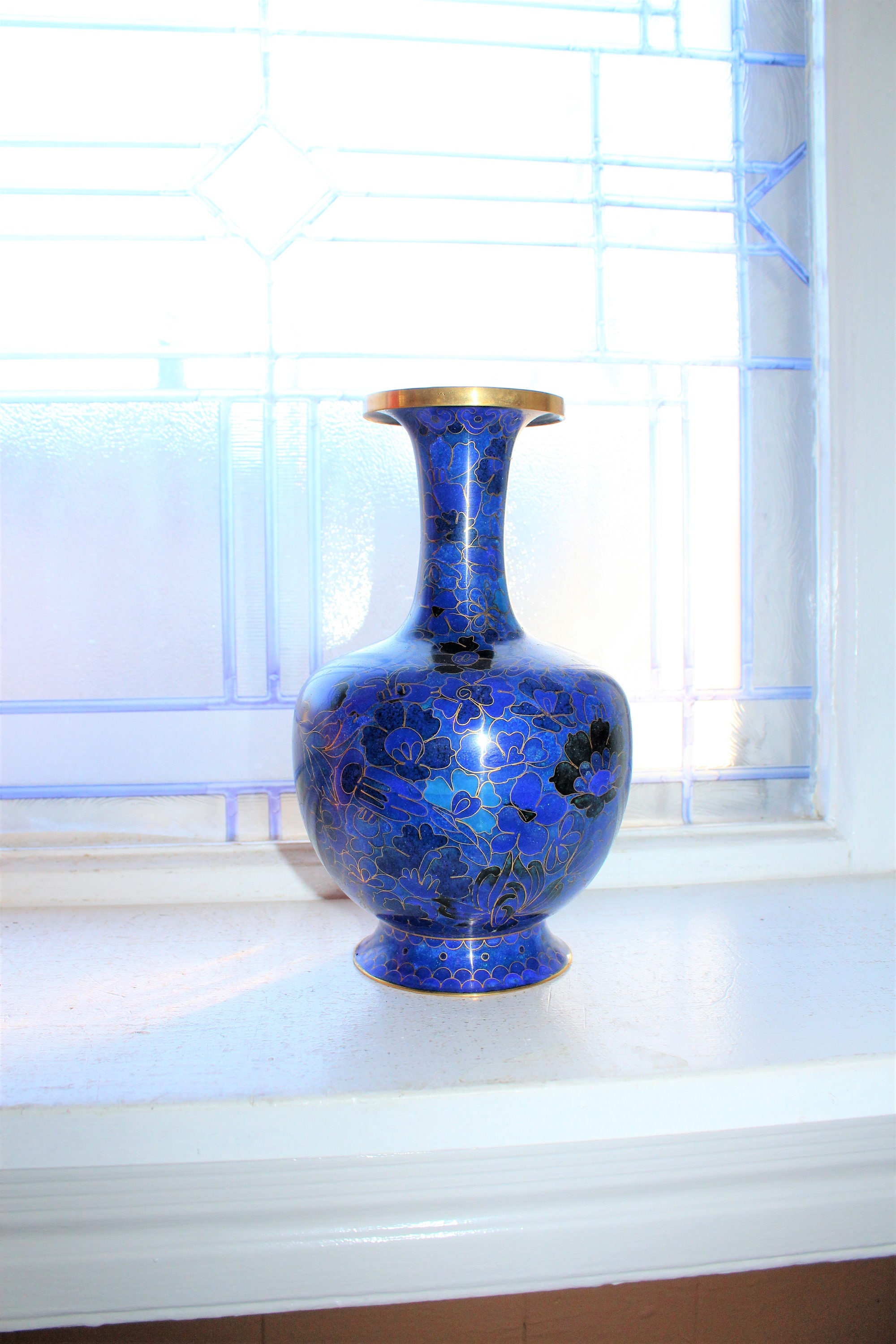 Large vintage Chinese cloisonné vase featuring dark blue and black flowers with light blue interior. This gorgeous vase measures 8" high. There is a tiny crack in the enamel on the inside rim, no other damage. Enjoy!