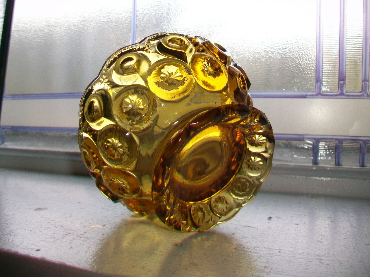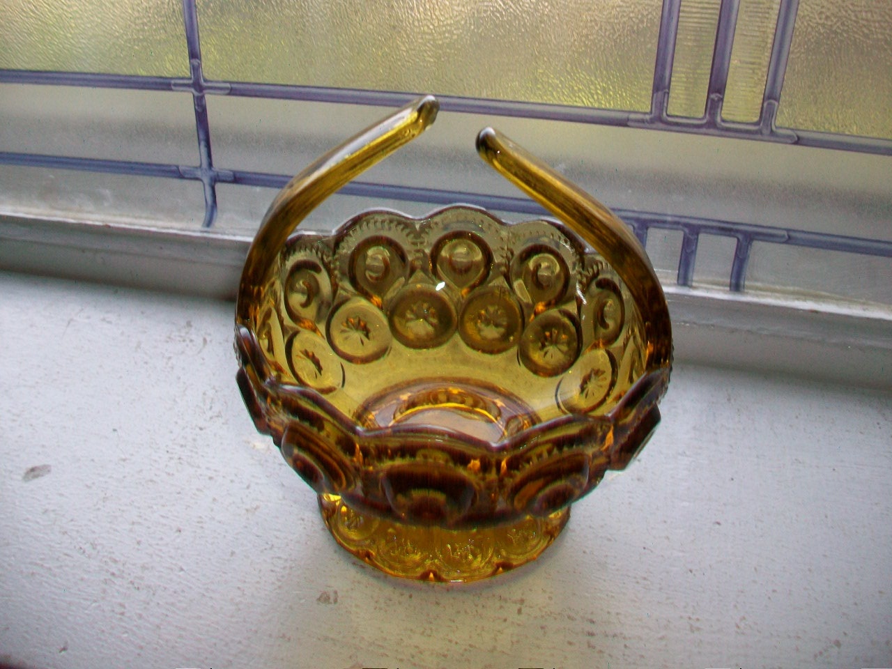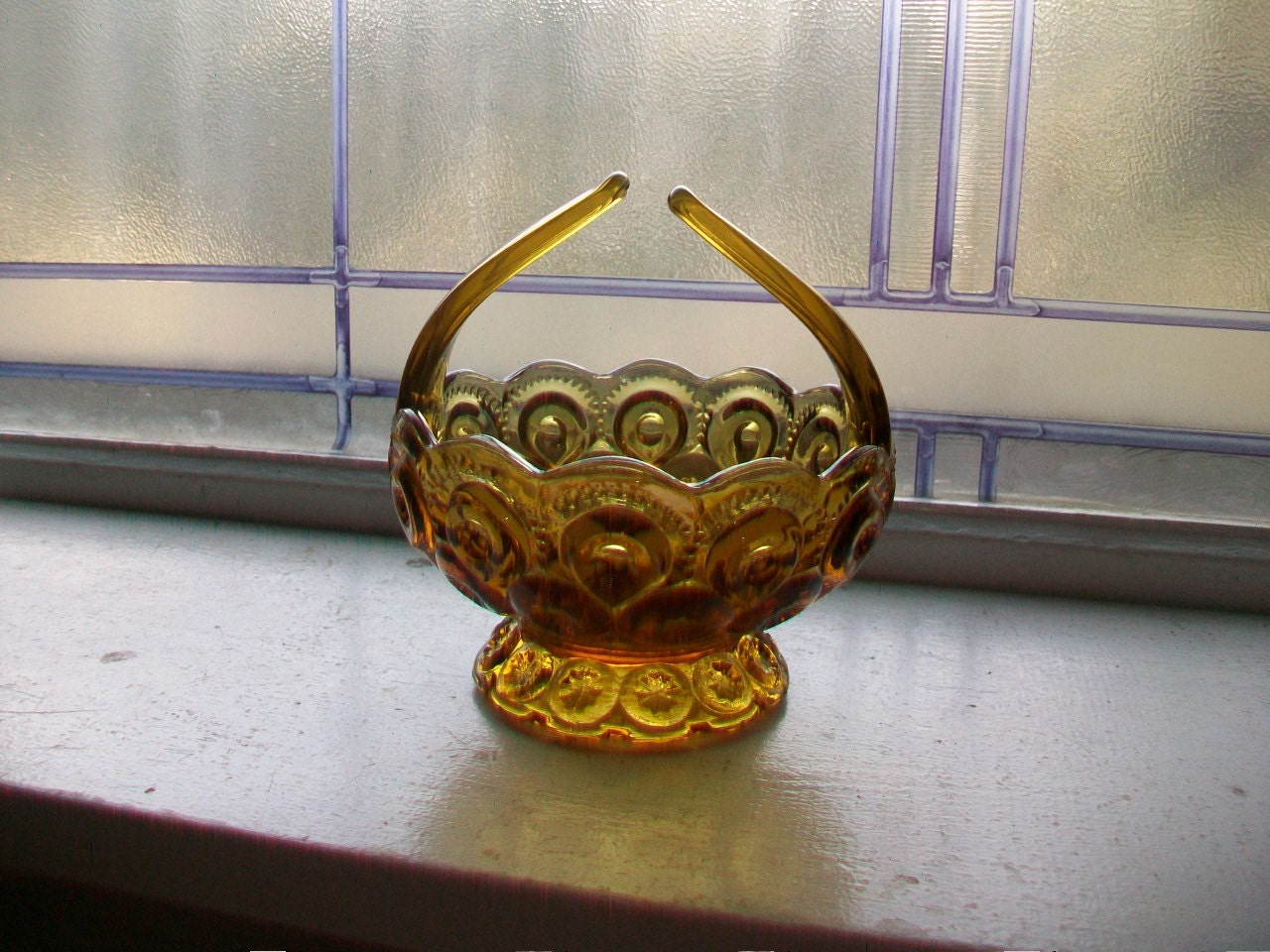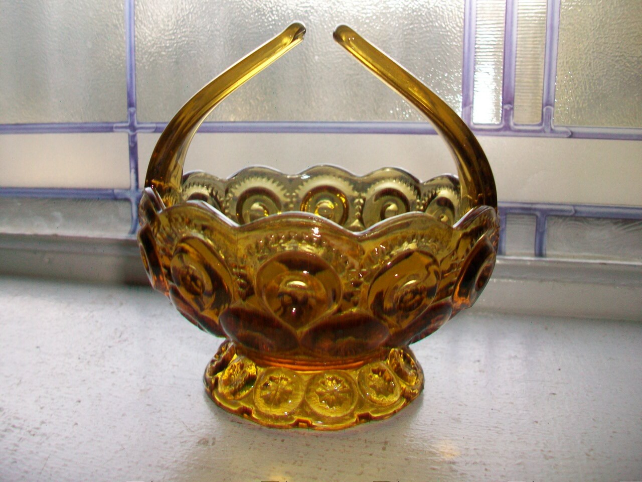 Vintage amber glass open handled candy or nut dish with star and pearl pattern, in excellent condition. The dish measures 5" high and has no chips or cracks, perfect for use or display. Enjoy!