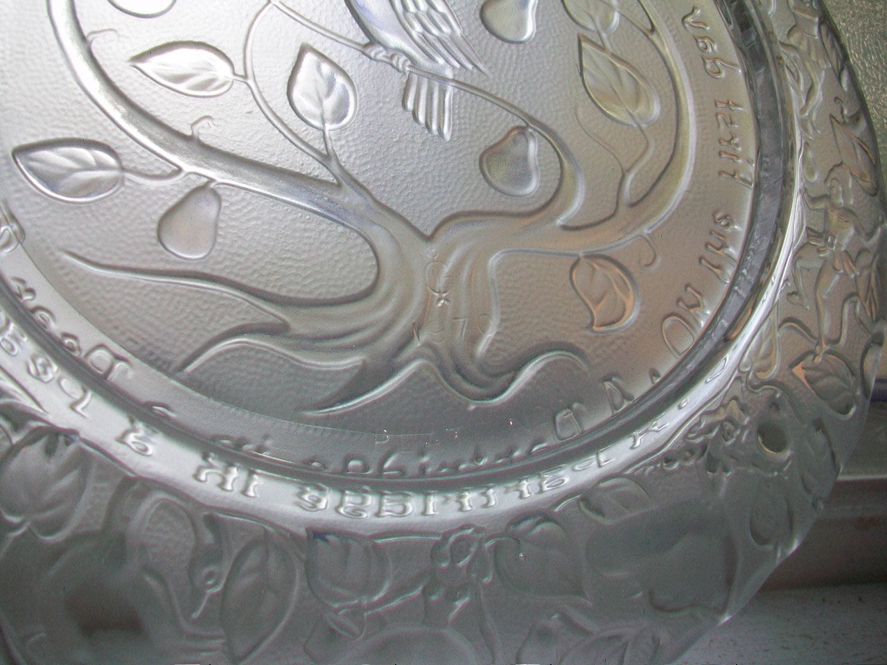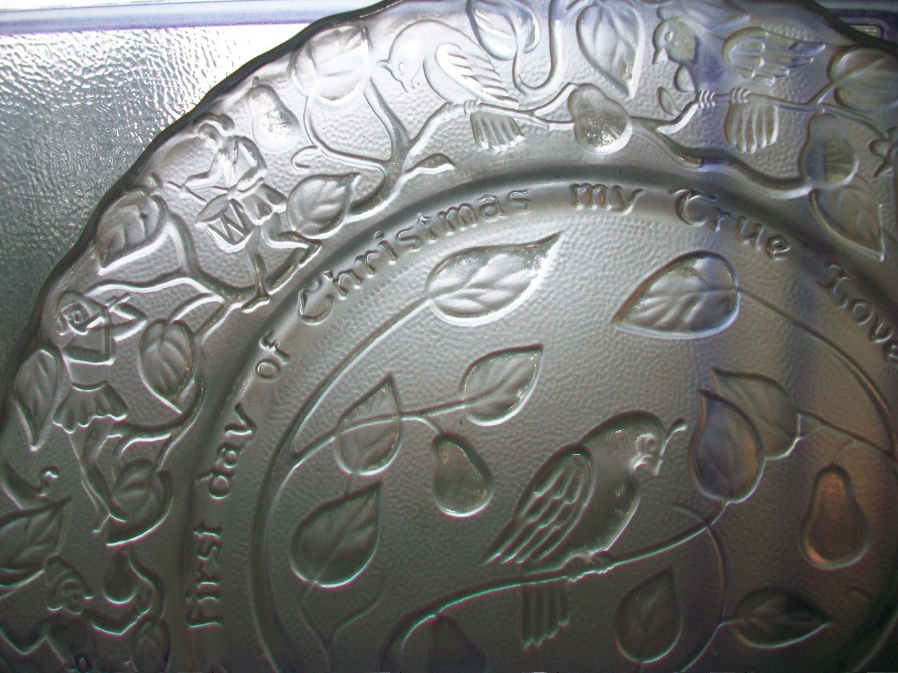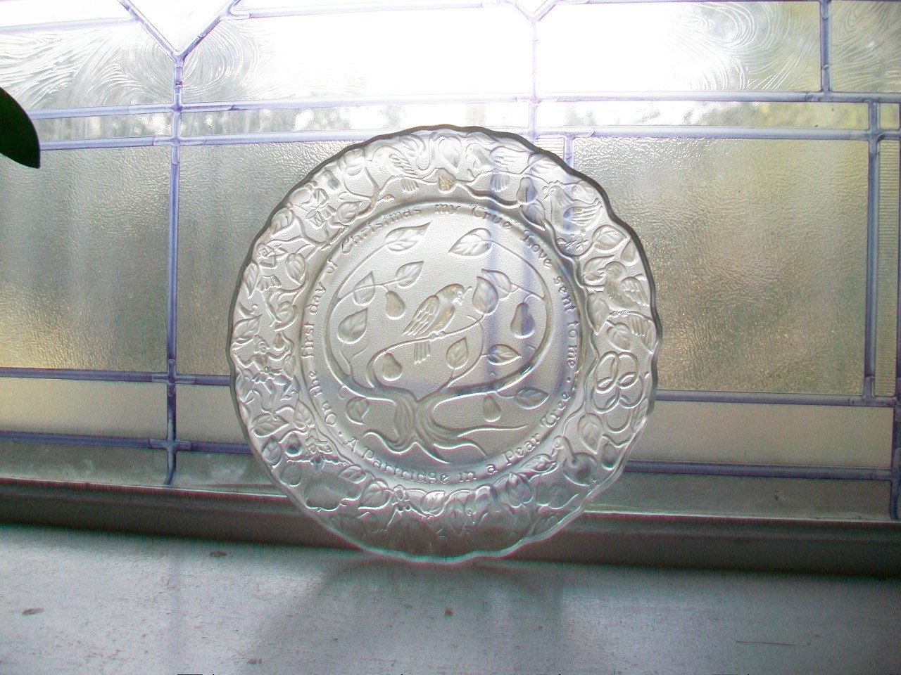 Vintage Imperial Glass Christmas Plate from 1970, Partridge In a Pear Tree, in excellent condition. The plate measures 8 3/4" across and reads "On the first day of Christmas my true love gave to me, a partridge in a pear tree." No chips or cracks, perfect for display. Enjoy!