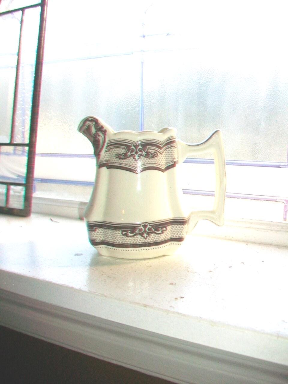 Antique brown transferware ironstone milk pitcher, in excellent condition. The pitcher measures 5 1/4" high and has no chips or cracks. Perfect for use or display in a country kitchen. Enjoy!