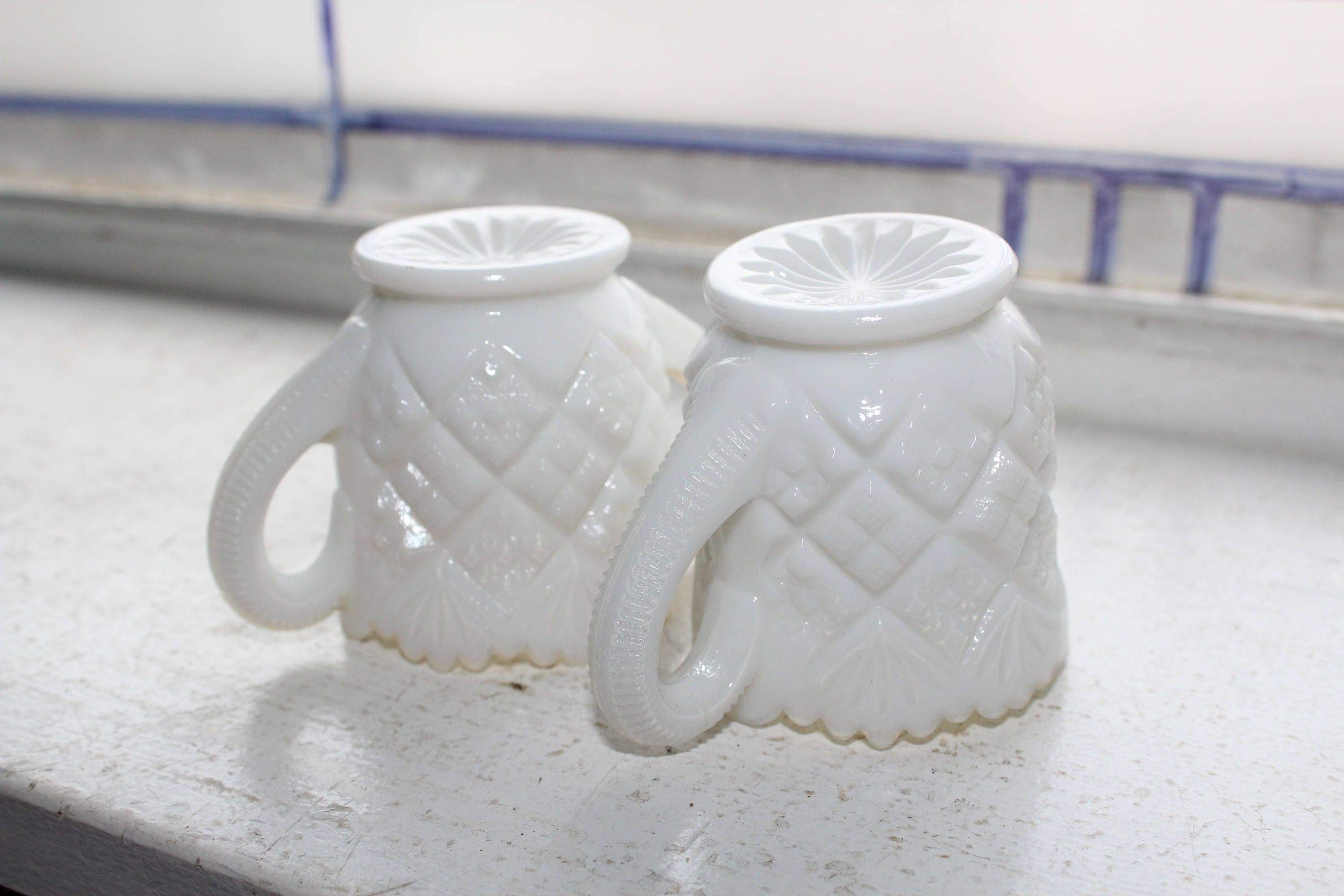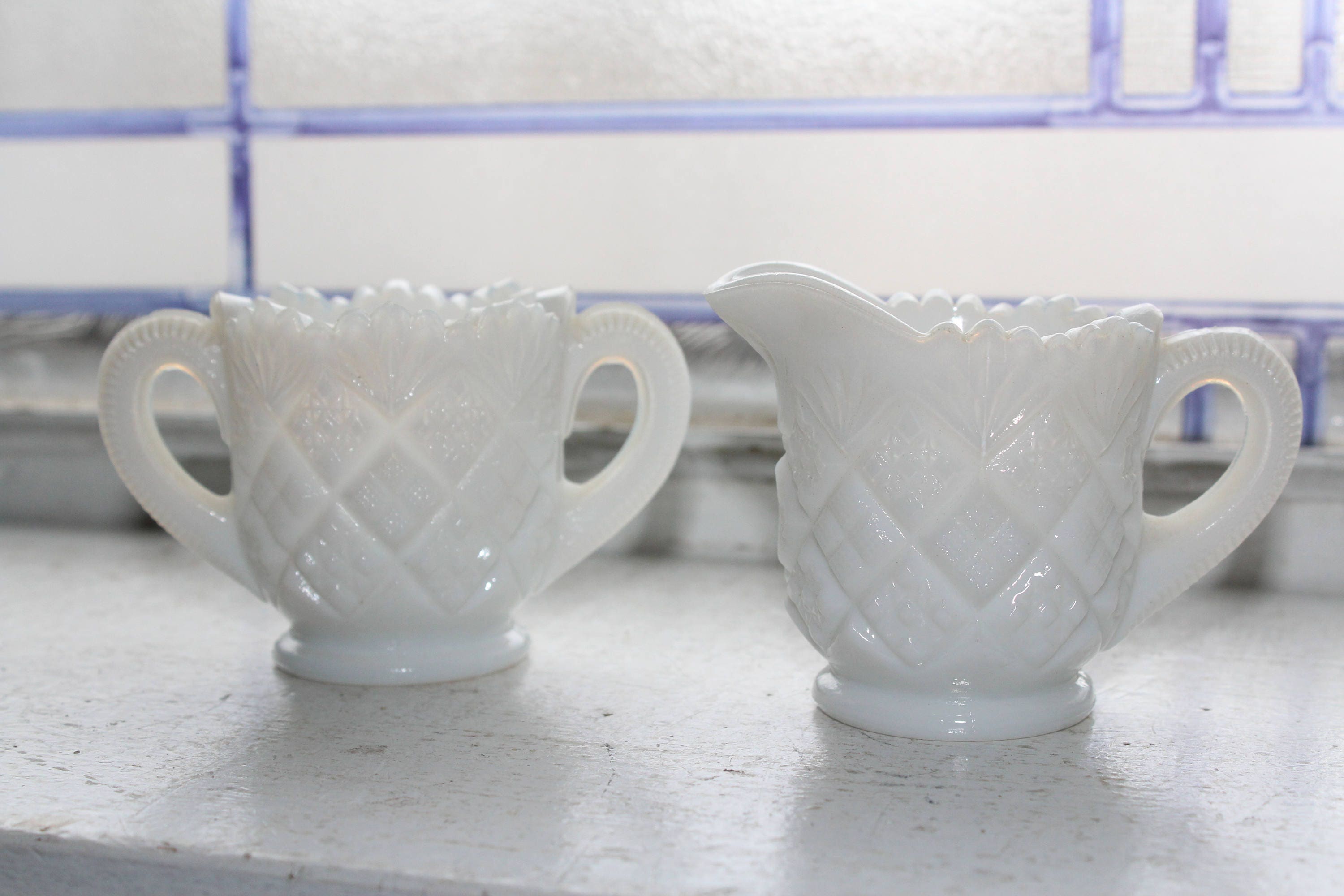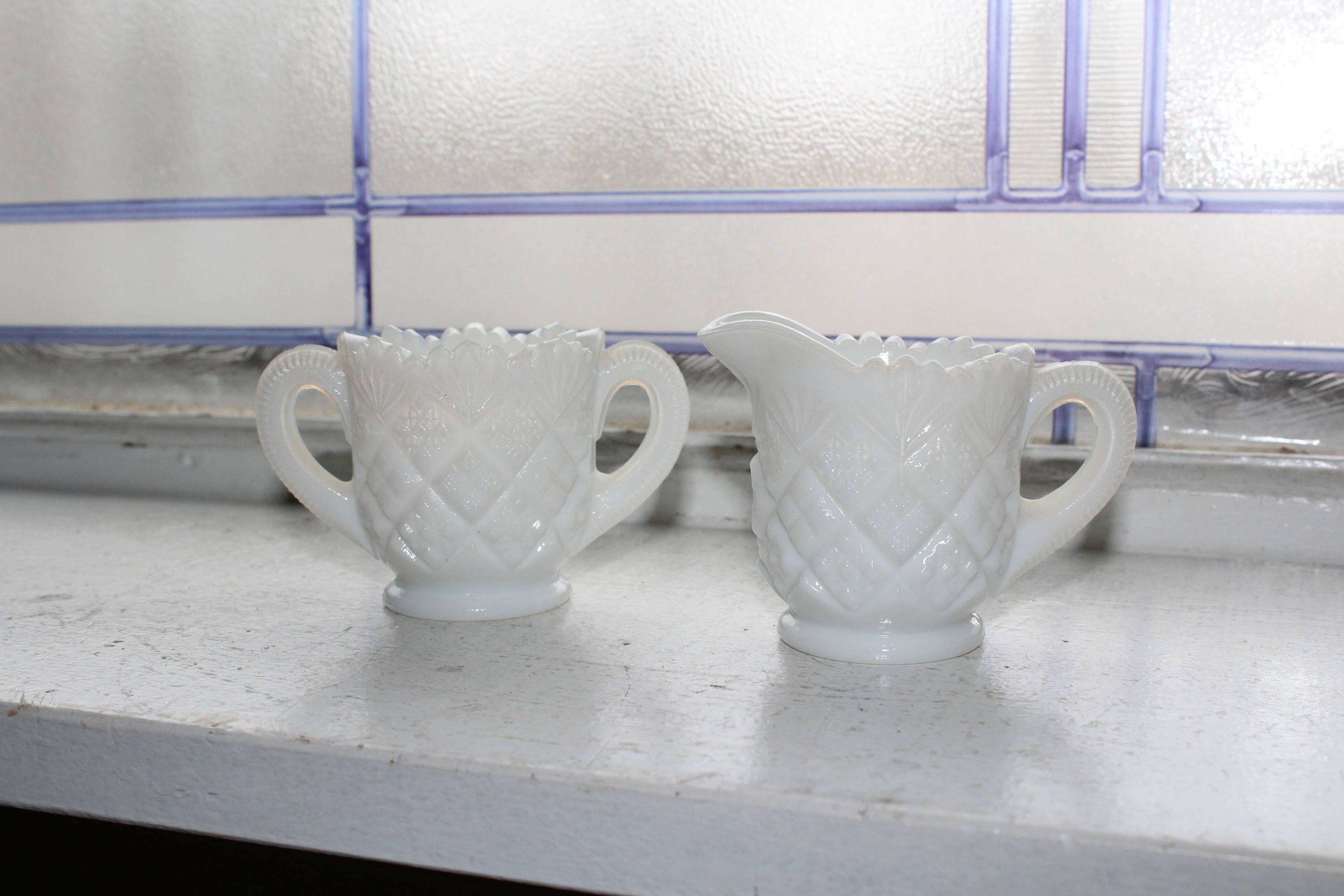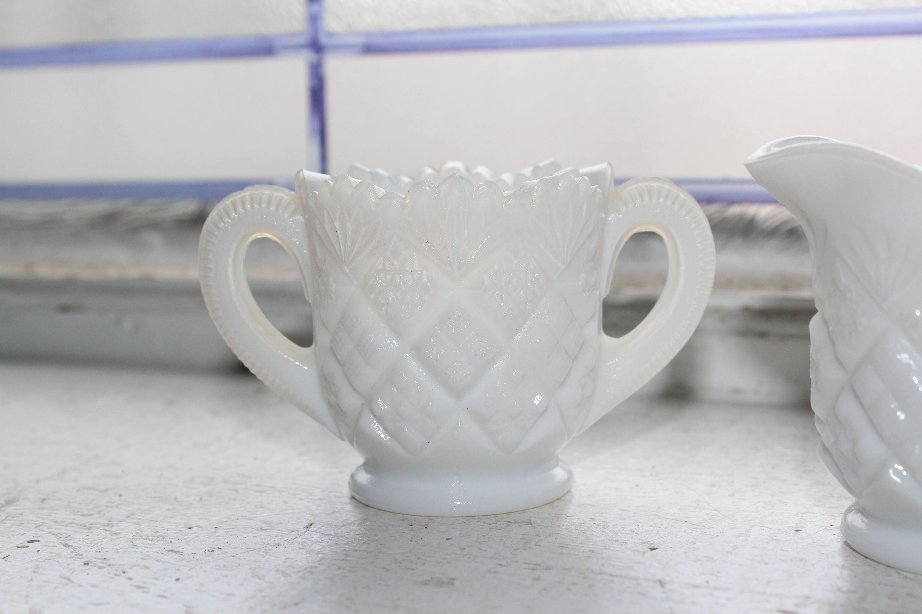 Vintage 1940s Westmoreland Thumbelina or Fan and File pattern milk glass miniature creamer and sugar. These were part of a child's toy dish set. The creamer and sugar measure 2 1/2" high. No chips or cracks. Enjoy!