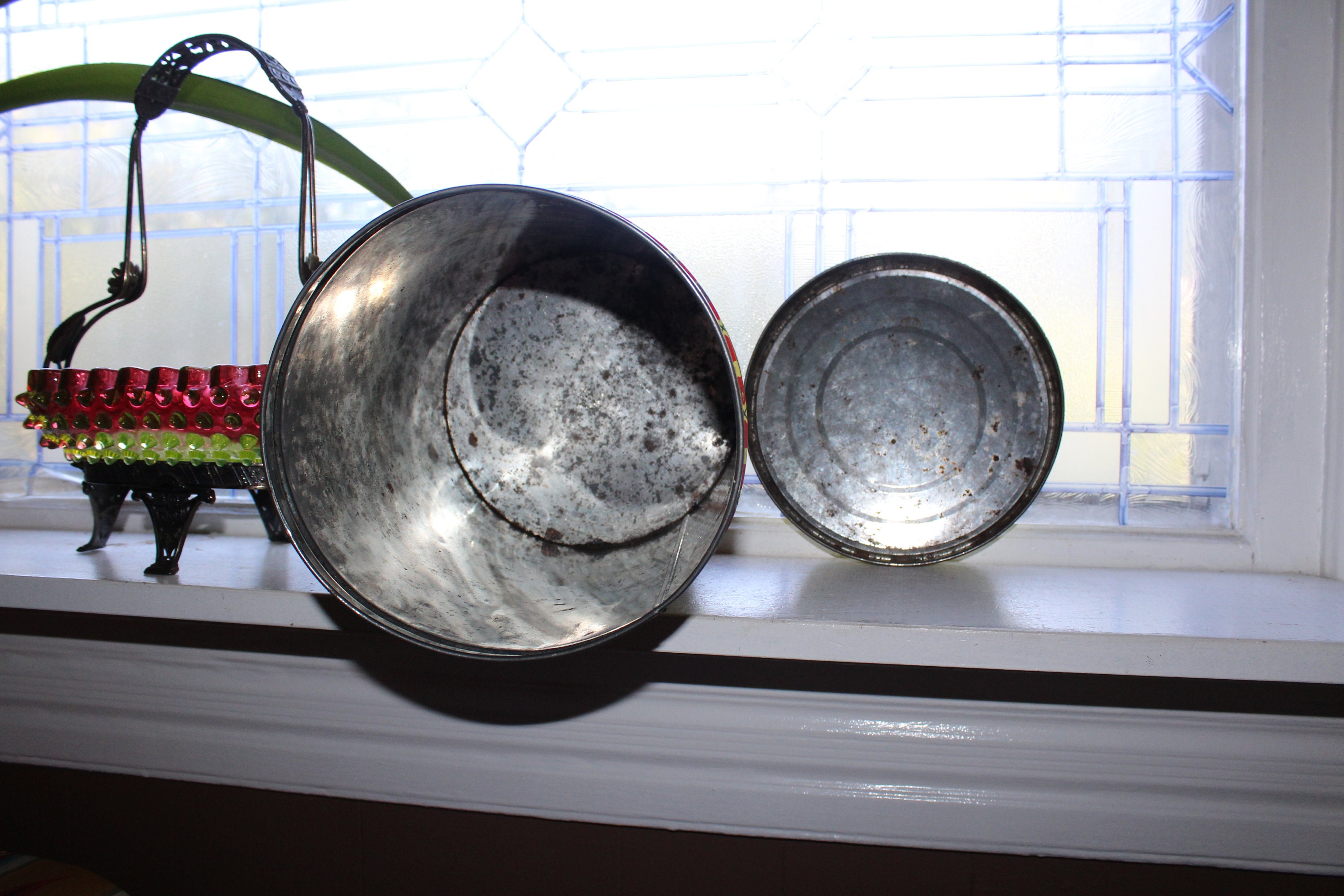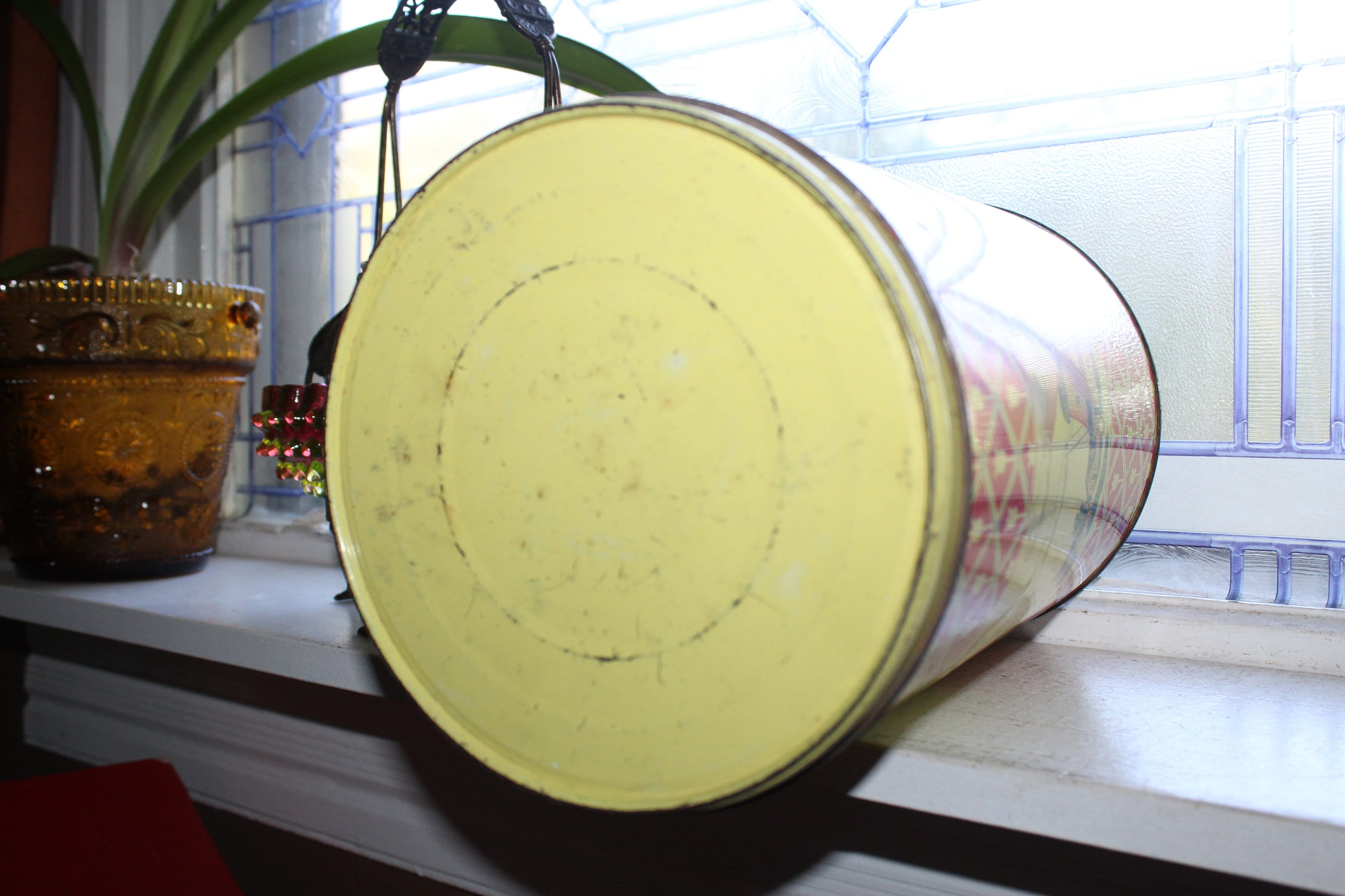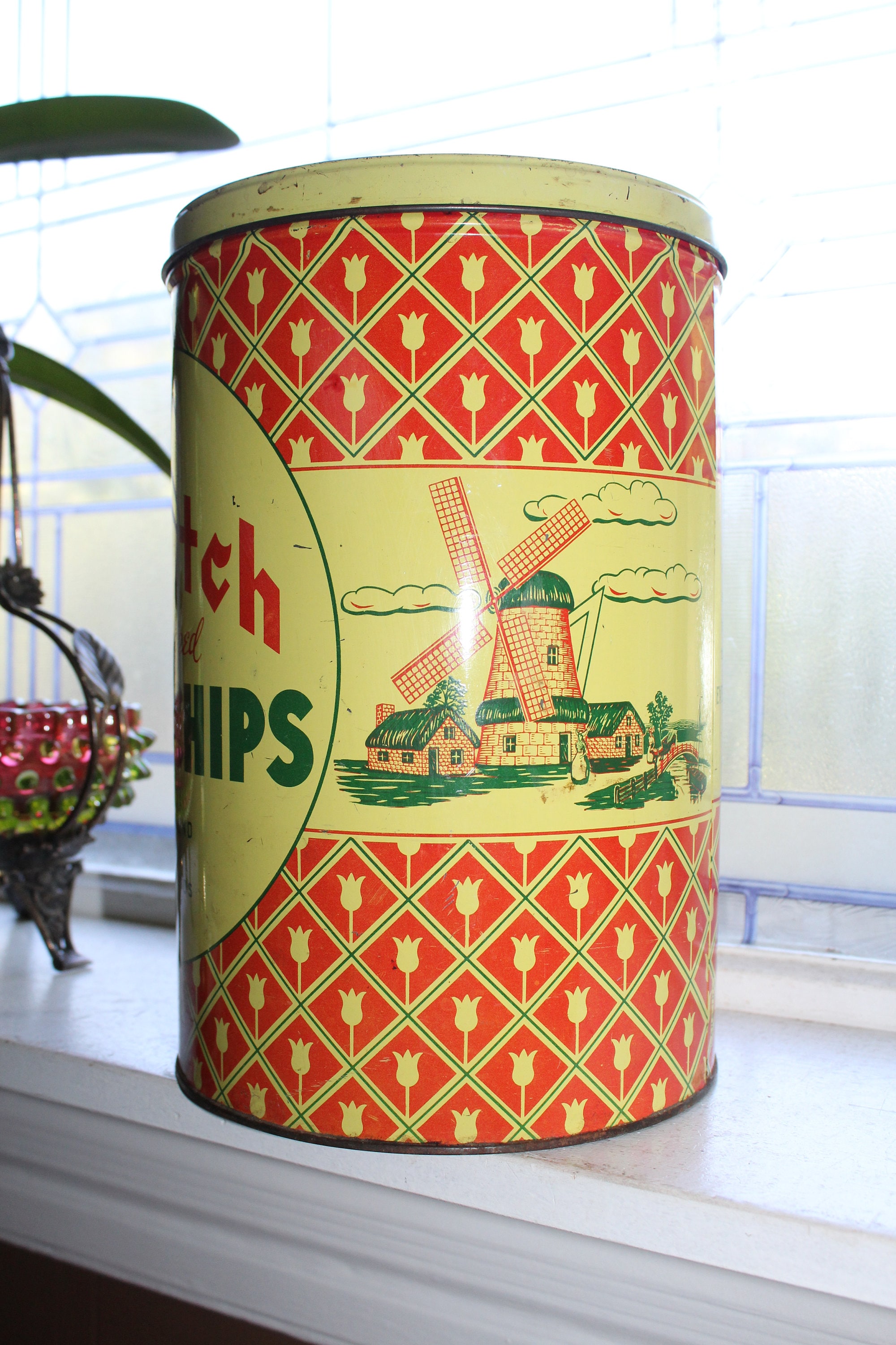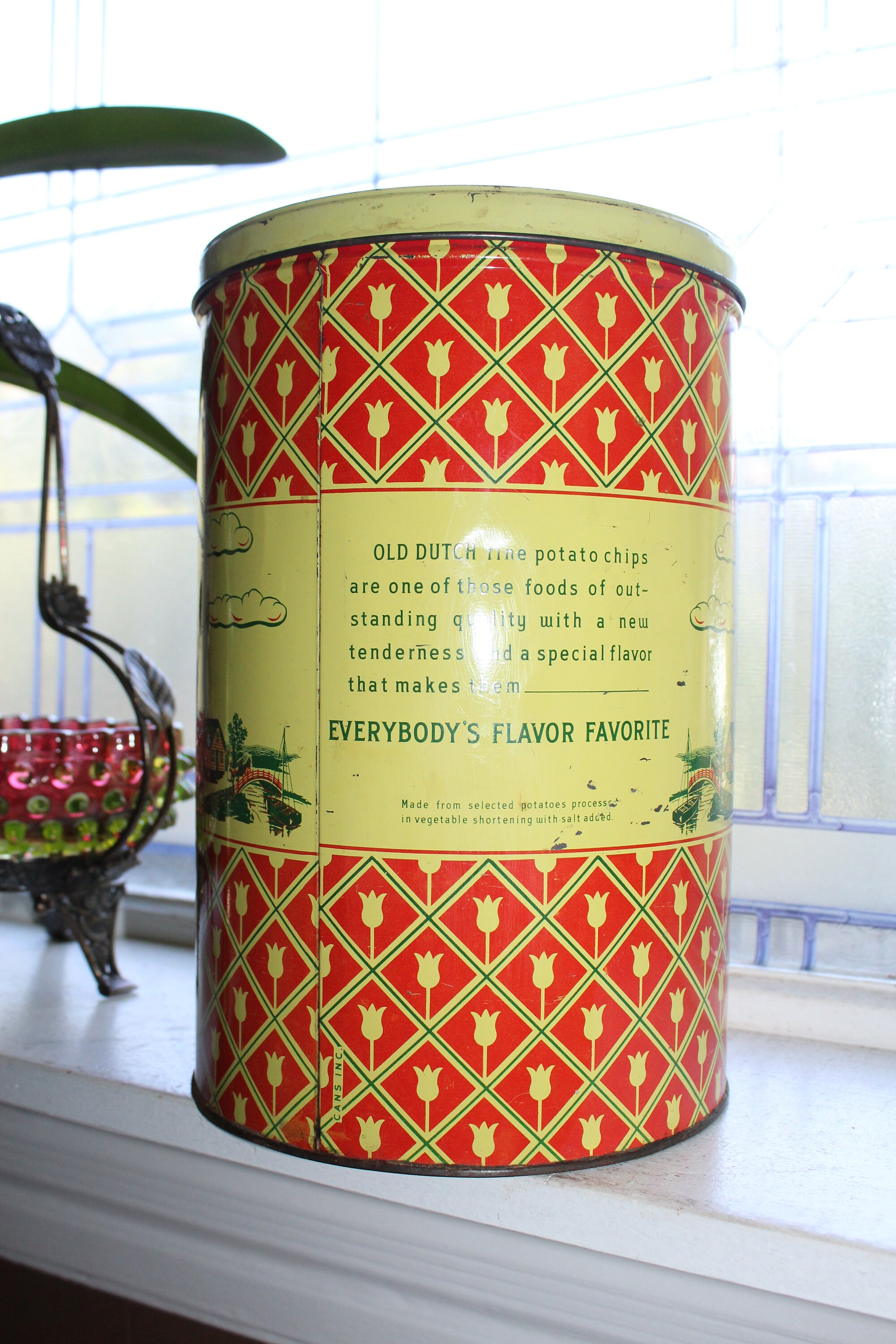 Vintage 1950s Old Dutch Potato Chips tin, 1 pound size, from Old Dutch Foods in Minneapolis, MN. The tin measures 11 1/2" high x 7 1/2" wide. Age appropriate wear and rust, still displays well. Enjoy!