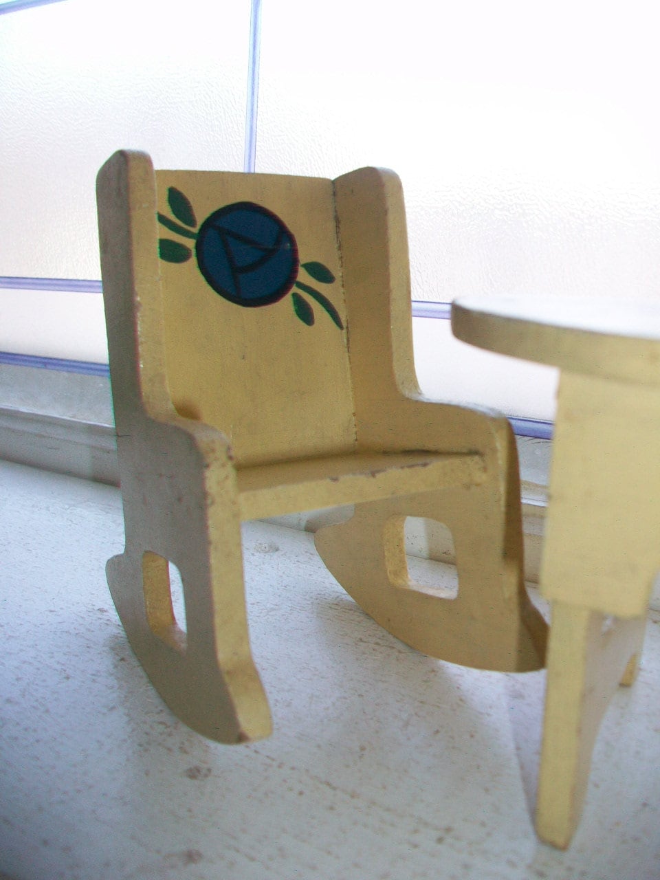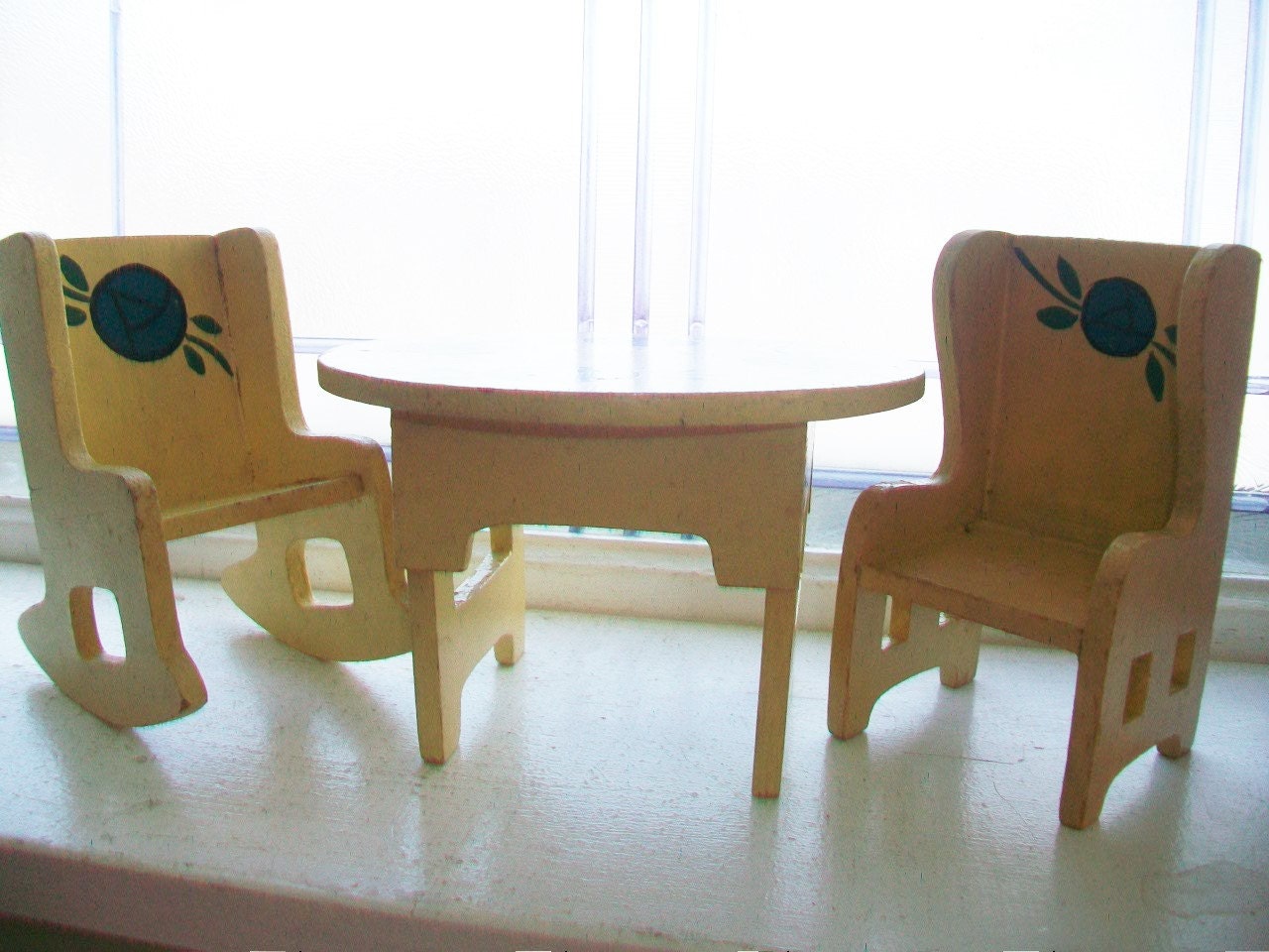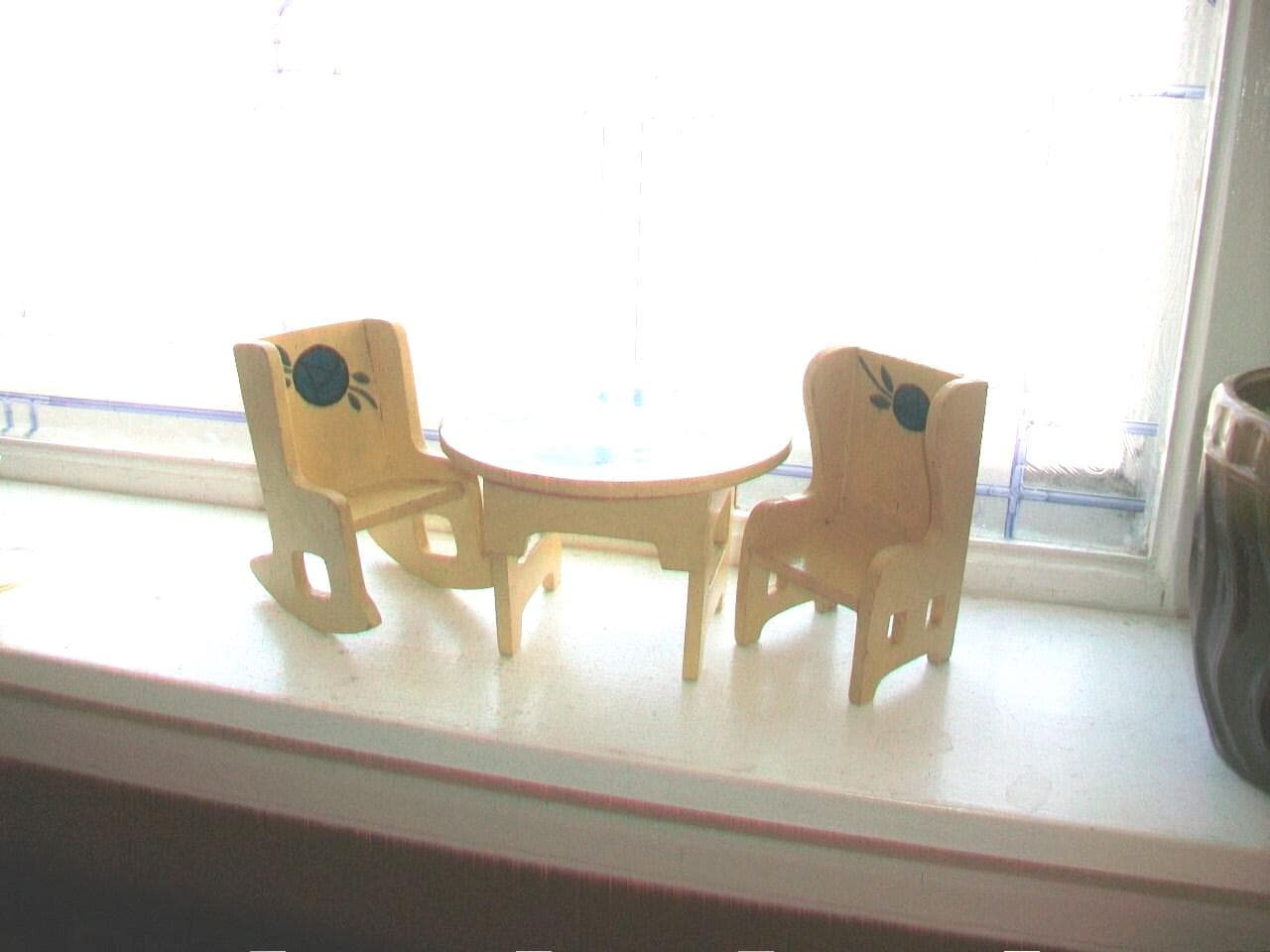 Vintage 1940s wooden dollhouse furniture 3 piece set, including a round table, wing back char and rocking chair, handmade and in good condition. The table measures 4" high x 6" wide, the wingback chair measures 5" high x 2 7/8" wide, and the rocking chair also measures 5" high x 2 7/8" wide. Each piece is hand painted. There is light age appropriate wear to the paint, but all pieces still display well. Enjoy!