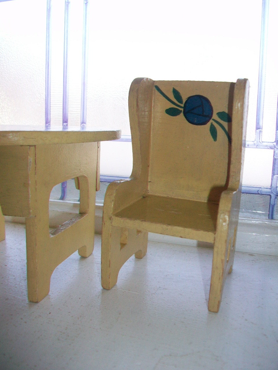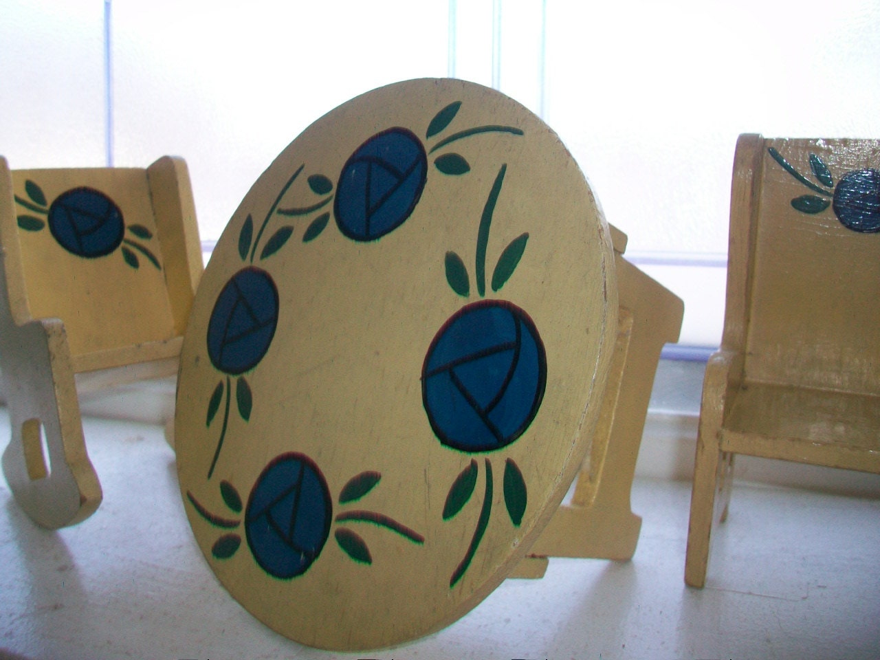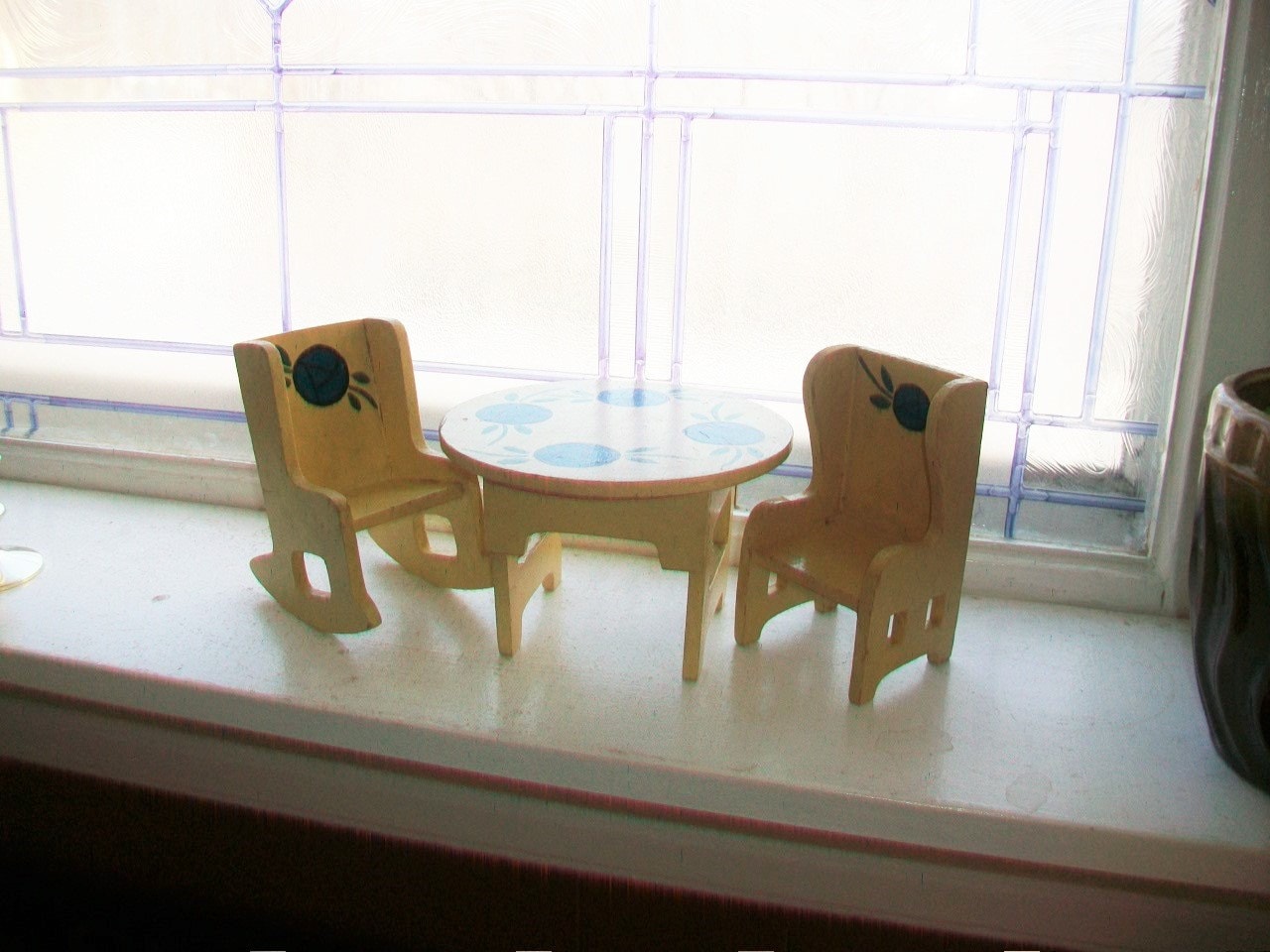 Vintage 1940s wooden dollhouse furniture 3 piece set, including a round table, wing back char and rocking chair, handmade and in good condition. The table measures 4" high x 6" wide, the wingback chair measures 5" high x 2 7/8" wide, and the rocking chair also measures 5" high x 2 7/8" wide. Each piece is hand painted. There is light age appropriate wear to the paint, but all pieces still display well. Enjoy!