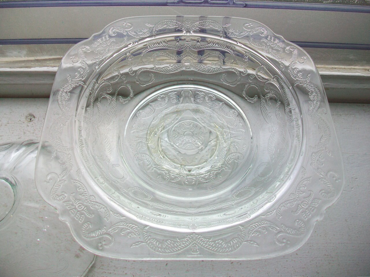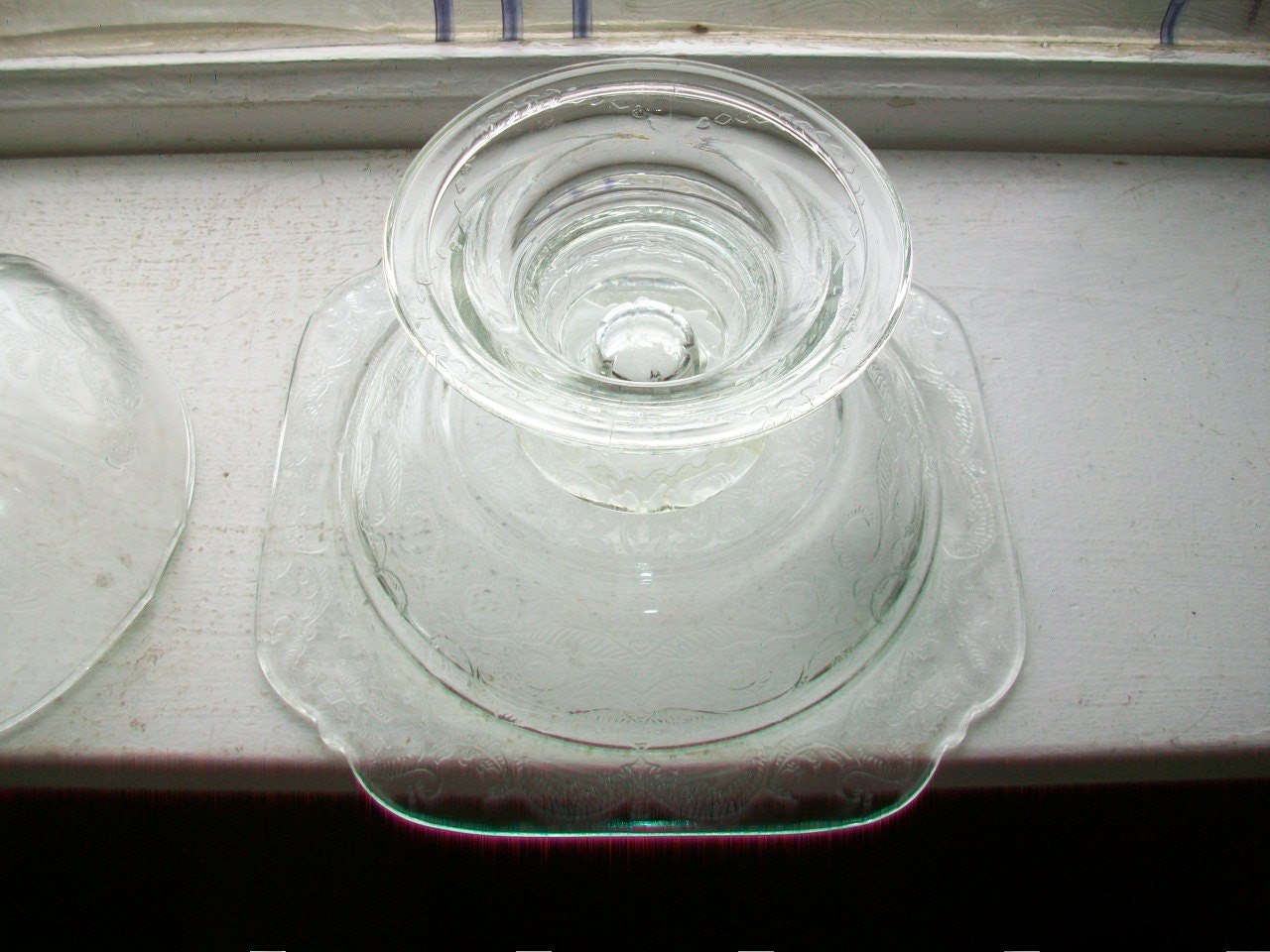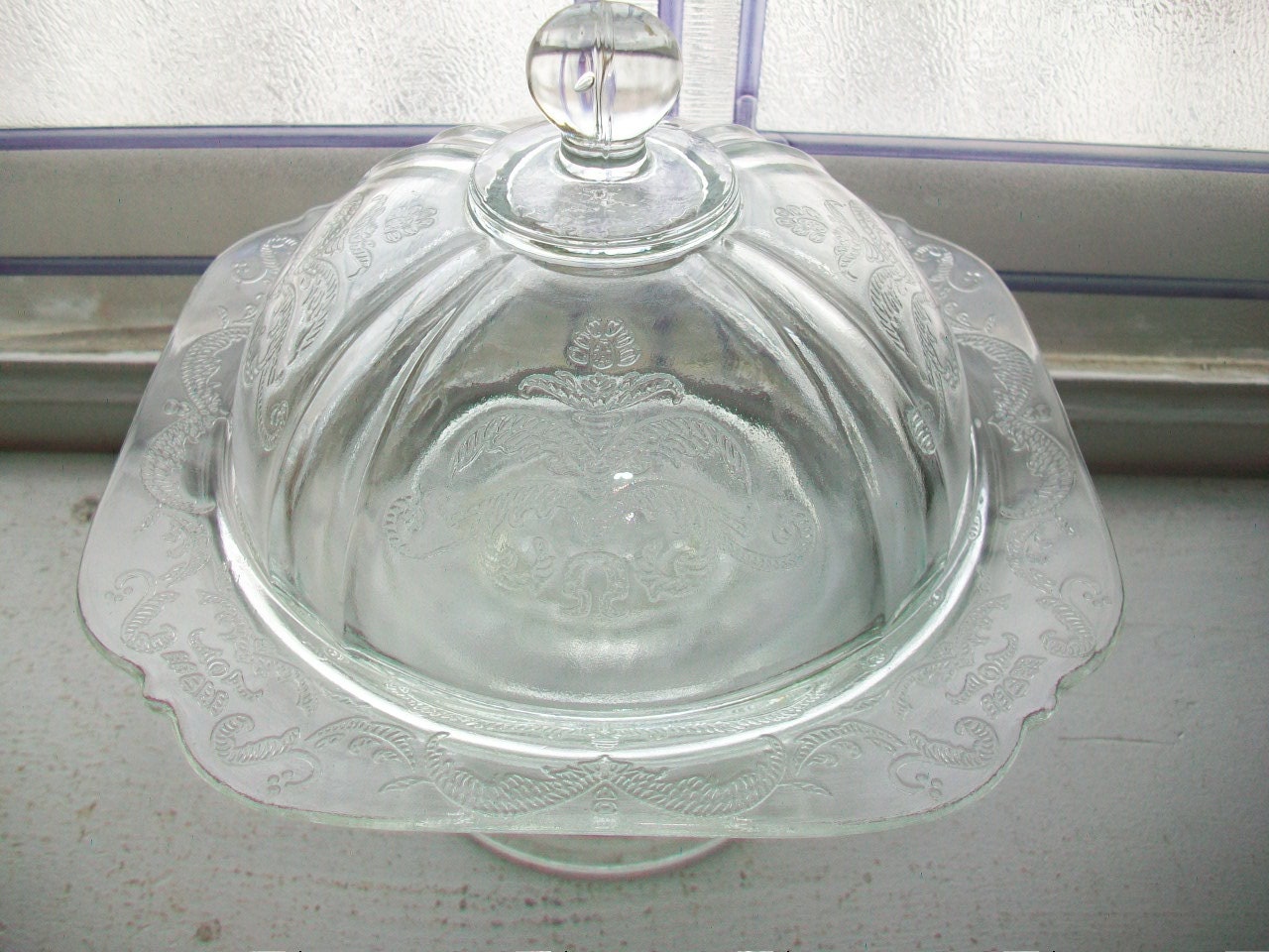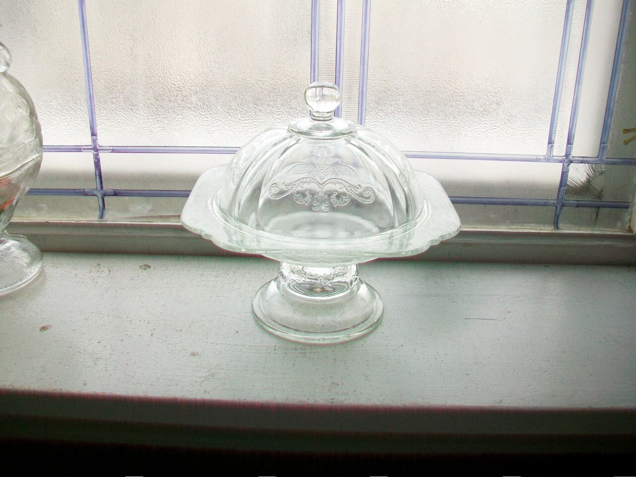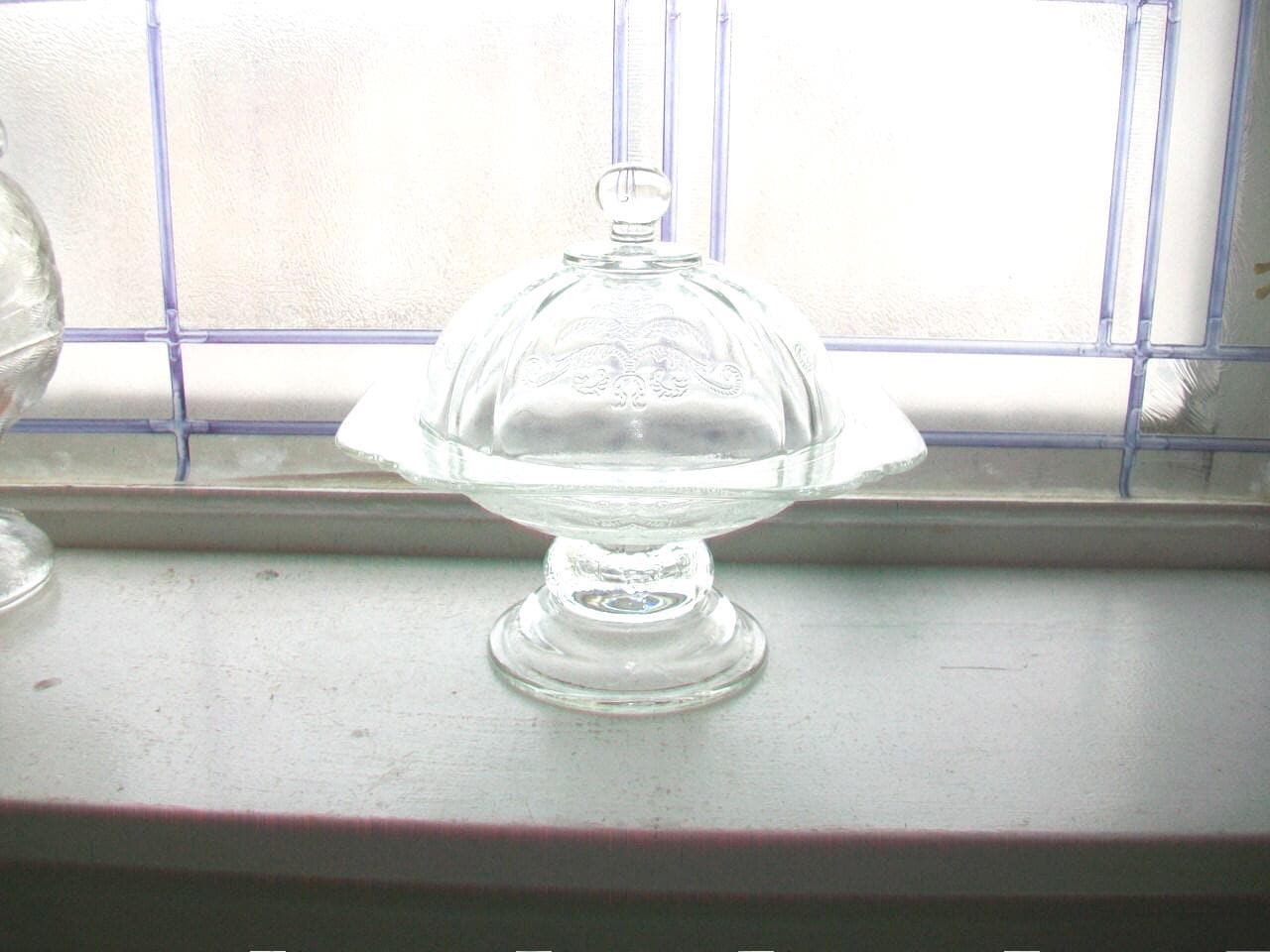 Vintage clear depression glass pedestal butter dish or candy dish in the clear Madrid pattern, in good condition. It measures 6 1/4" in diameter and 6 7/8" high. No chips or cracks, perfect for use or display. Enjoy!