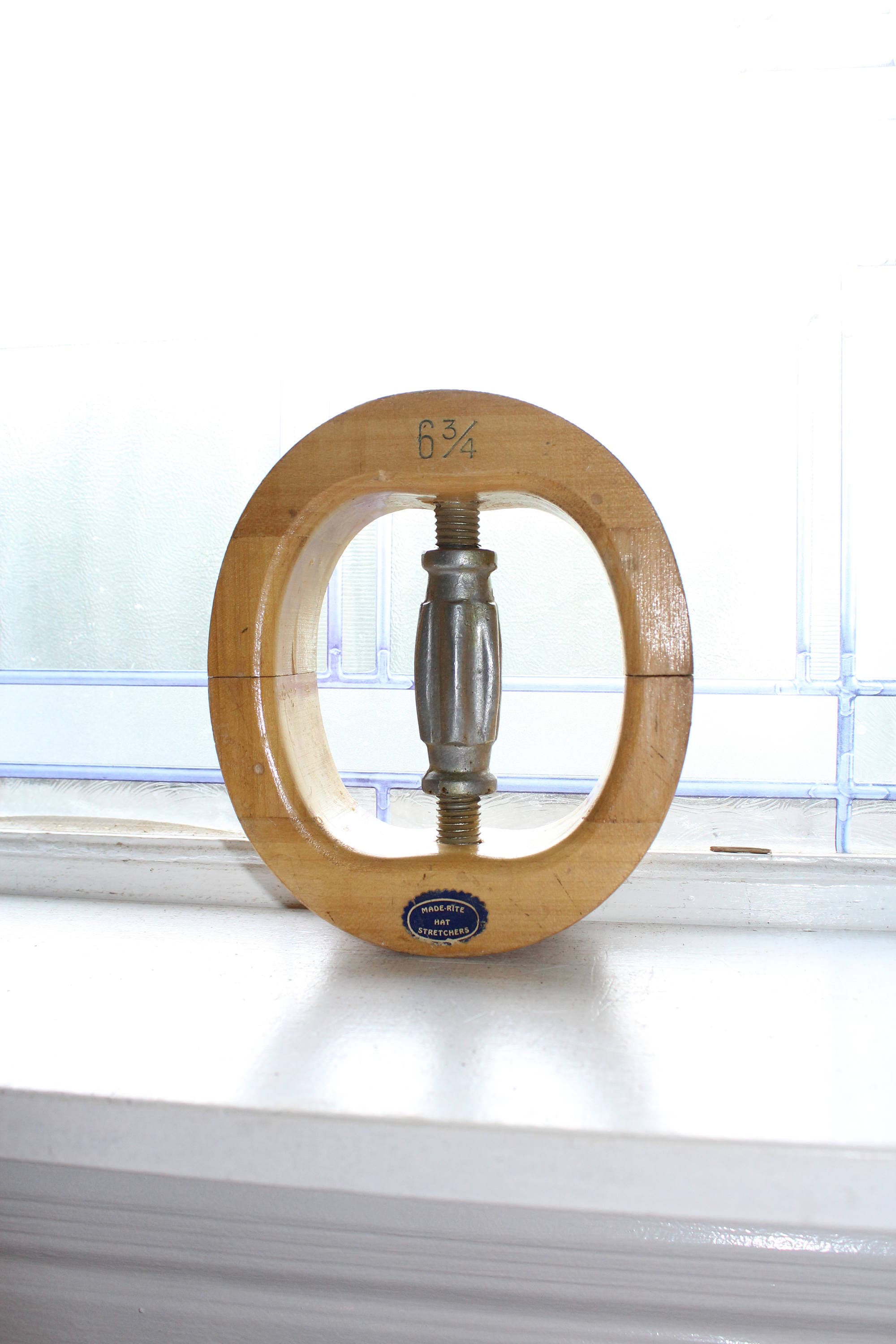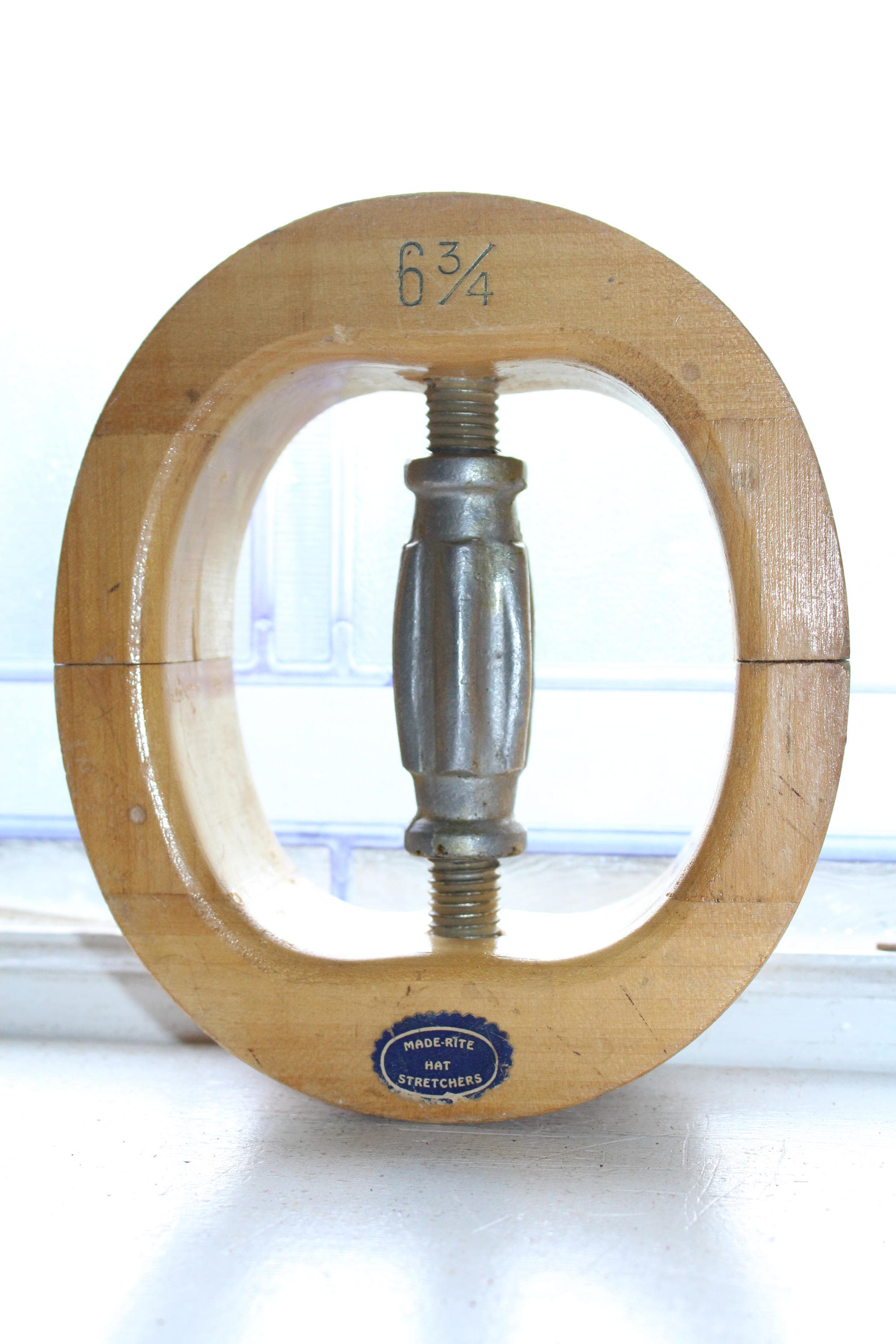 Vintage wooden Made-Rite hat stretcher, in very good condition. It is marked 6 3/4 and features a metal interior handle for adjusting the size. It measures 7 3/16" x 6 1/4" x 2 3/16". Enjoy!
