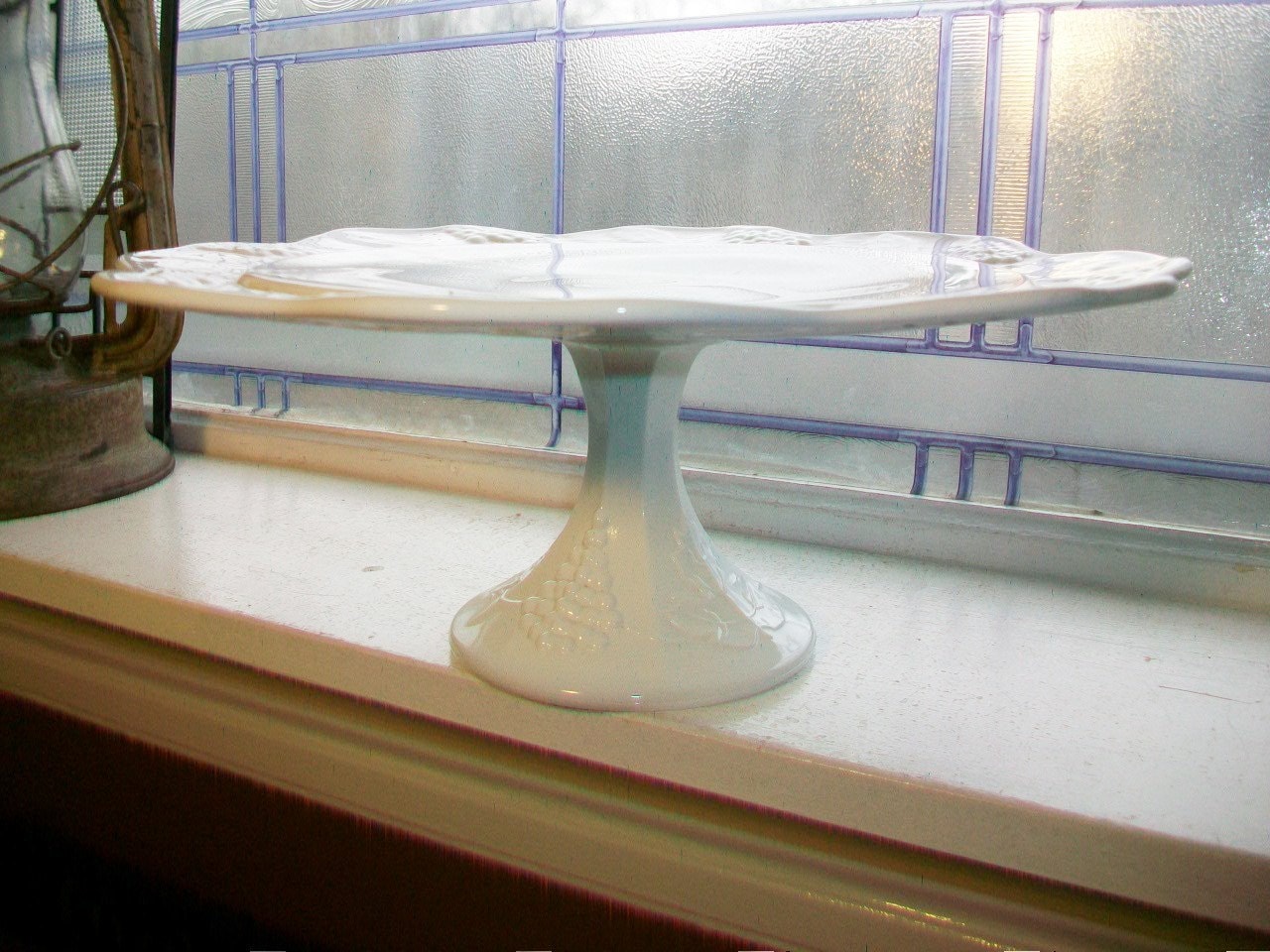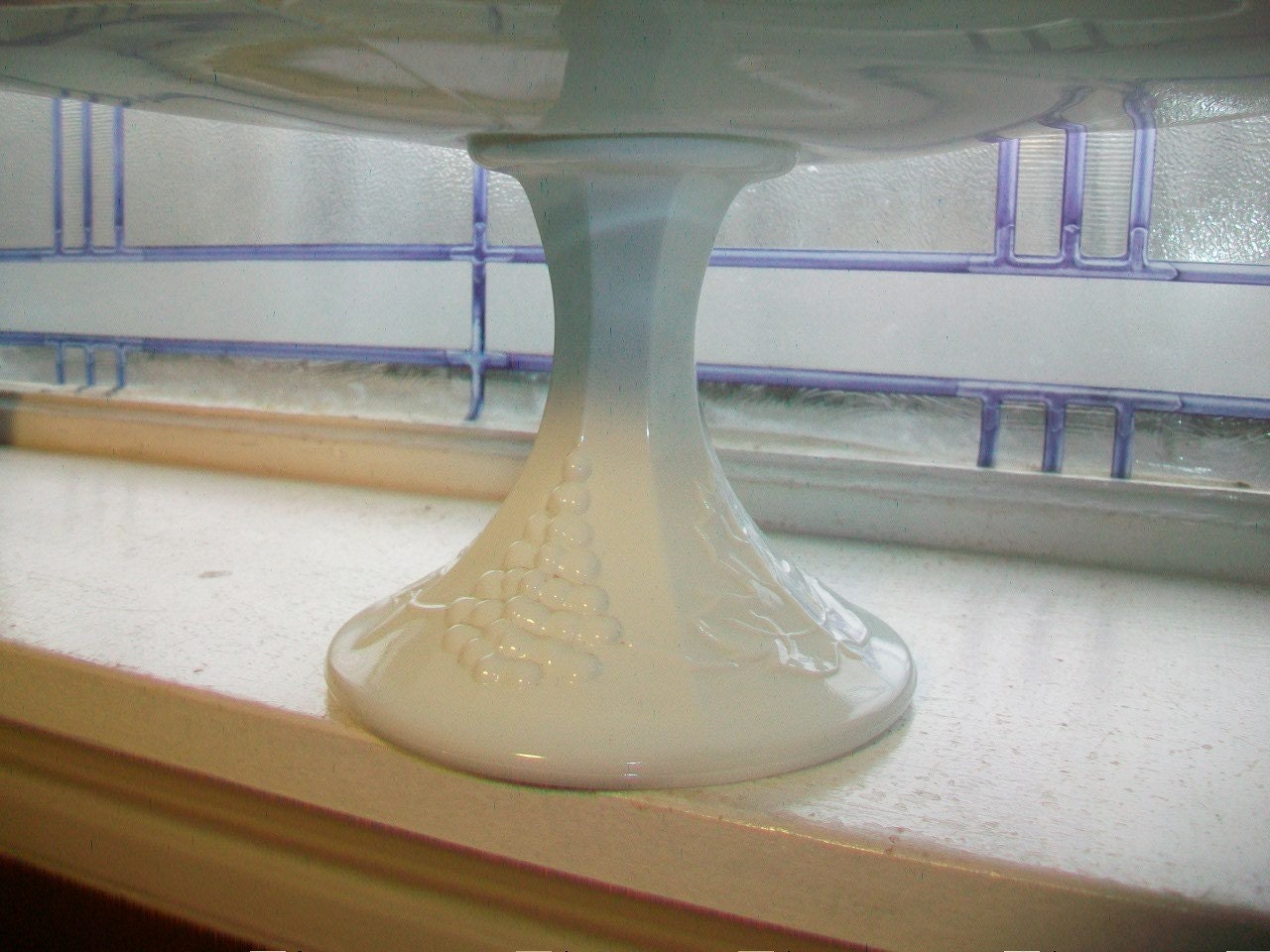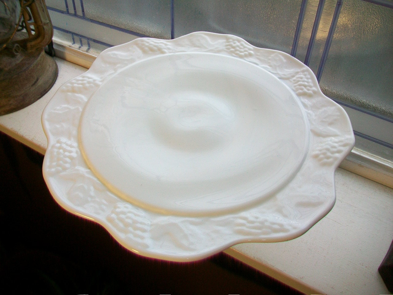 Large vintage milk glass cake stand with grapes and leaves motif, perfect for a wedding cake. The stand is in excellent condition and measures 13" wide x 5 1/4" high. No chips or cracks, perfect for use or display. Enjoy!