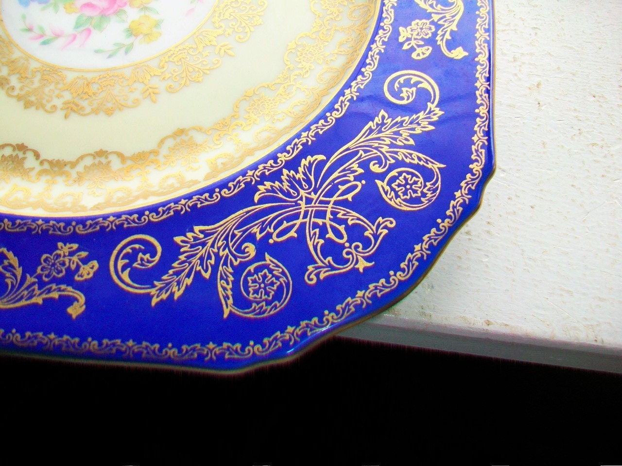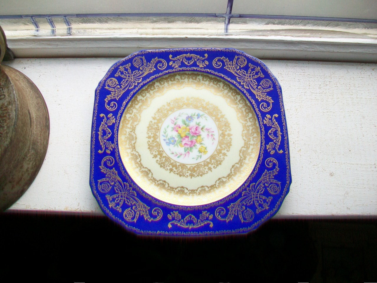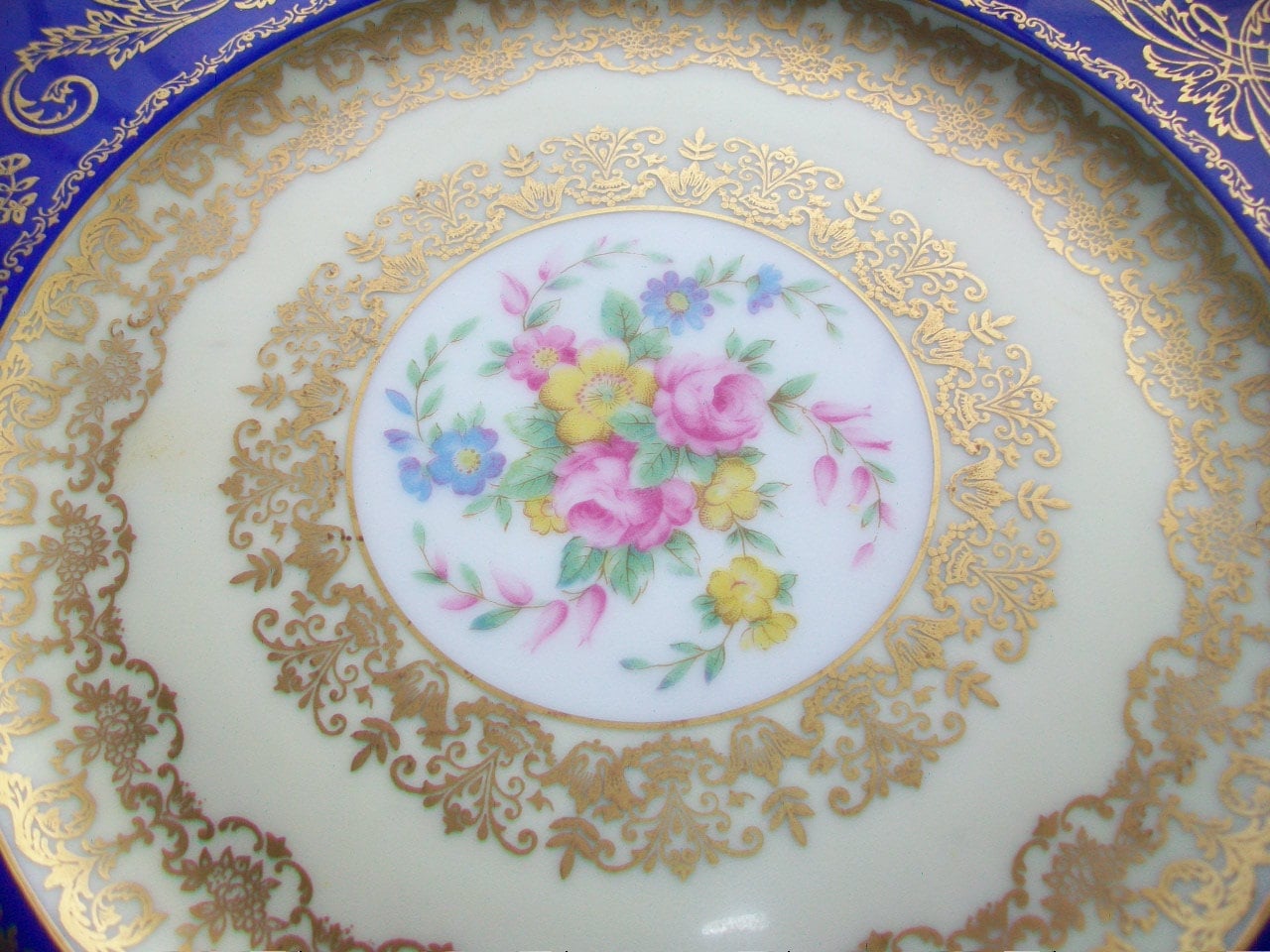 Vintage Puls Czechoslovakian plate, featuring heavy cobalt blue and gilt decor with pink and yellow roses, in very good condition. The plate measures 8 1/4" wide. No chips or cracks, perfect for use or display. Enjoy!
