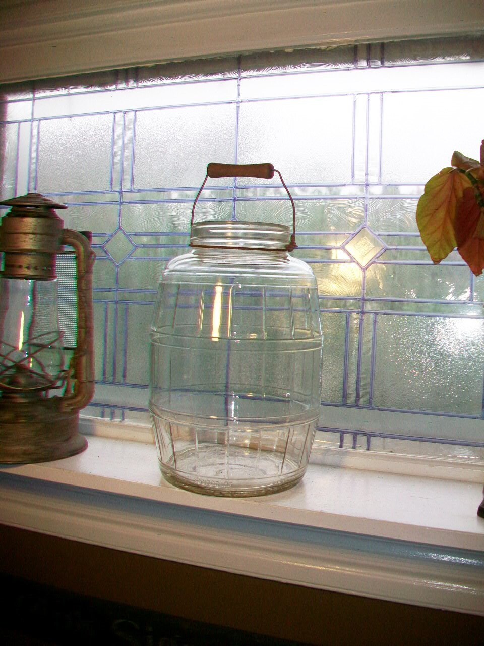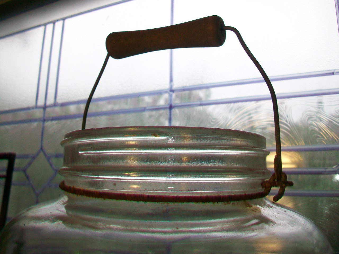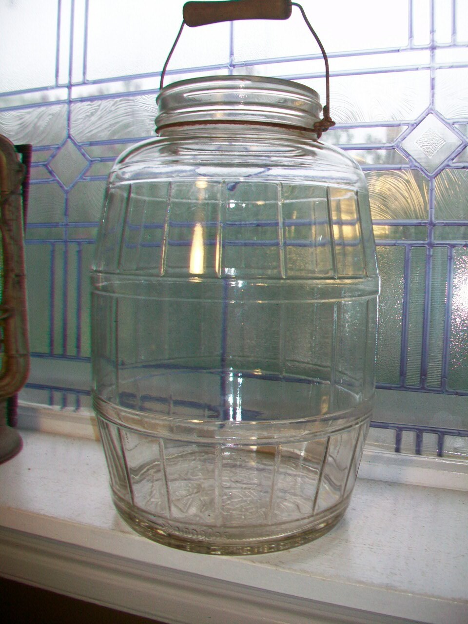 Large vintage 1950s Duraglas general store pickle jar with wooden swing handle, in good condition. The jar measures 13 1/2" high and has no lid. No chips or cracks, perfect for use or display in a country kitchen. Enjoy!