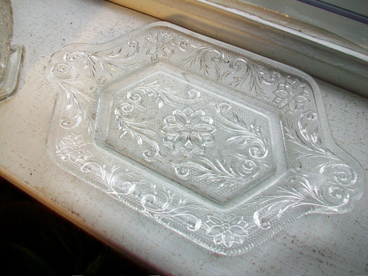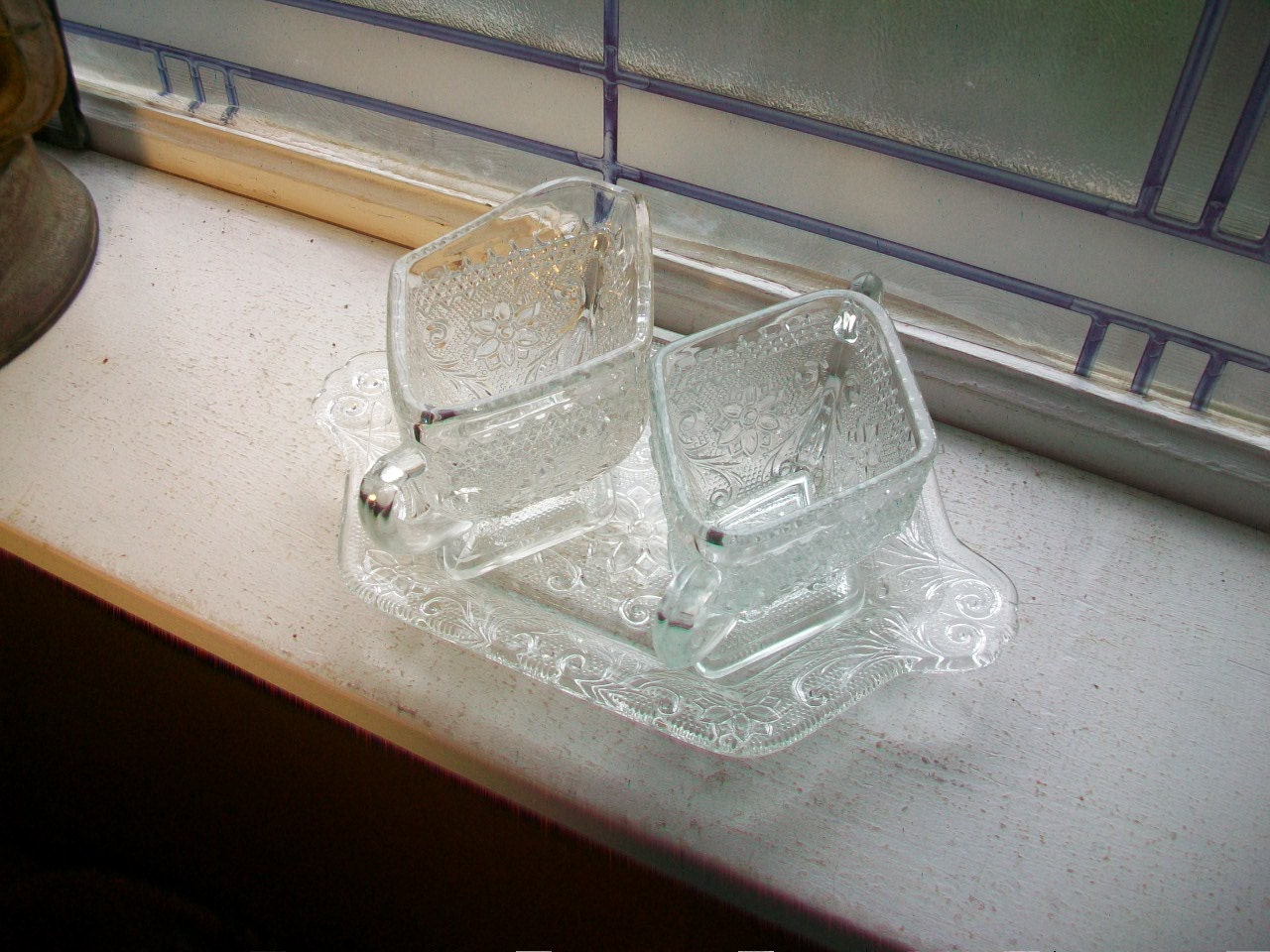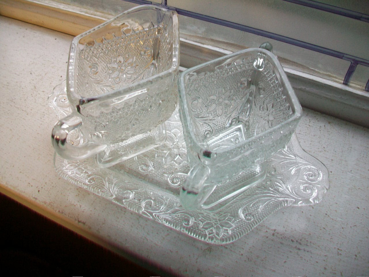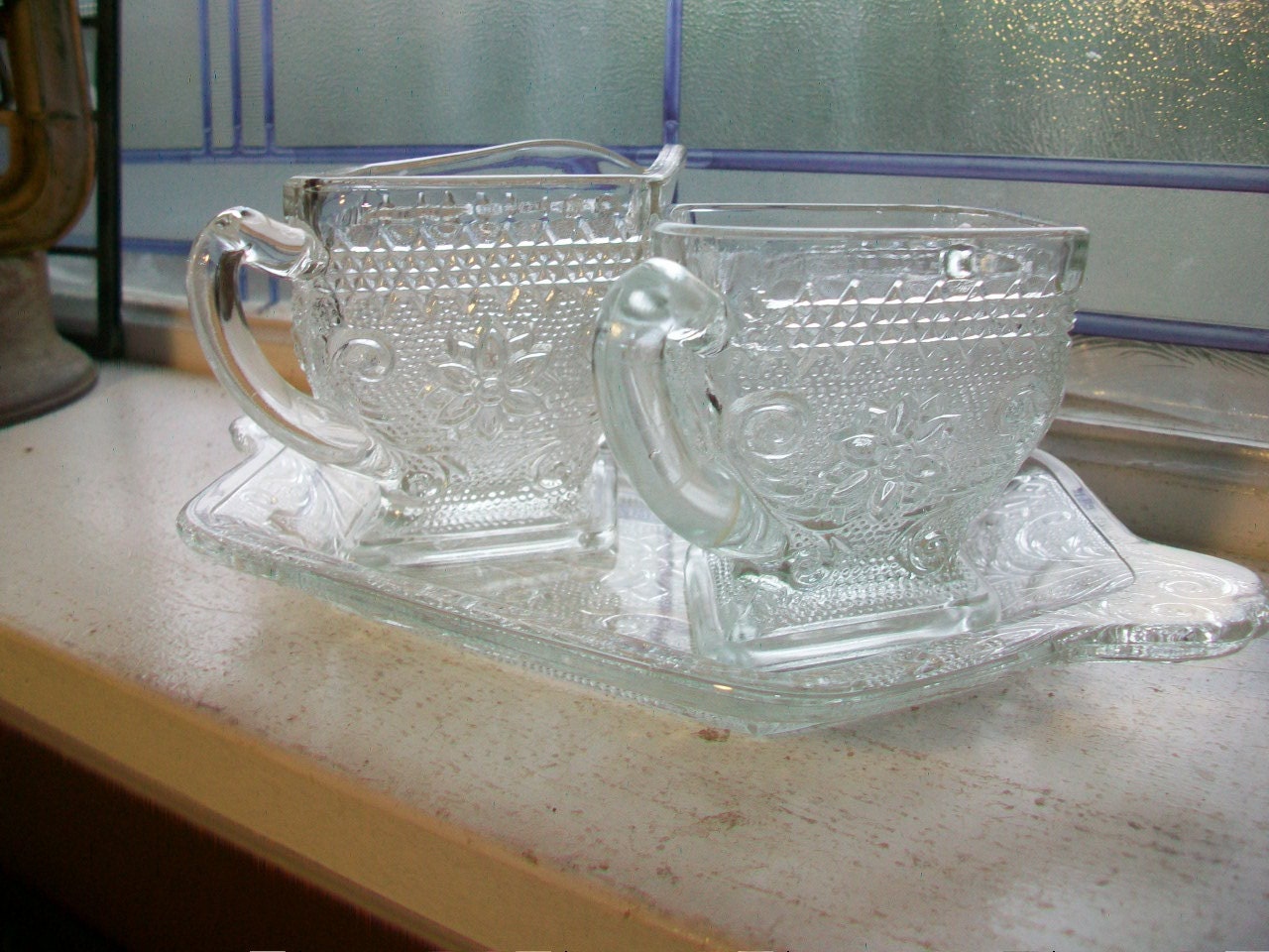 Vintage Indiana Glass Sandwich pattern depression glass creamer, sugar and tray set, in excellent condition. The tray measures 9 1/4" long. No chips or cracks, perfect for use or display. Enjoy!