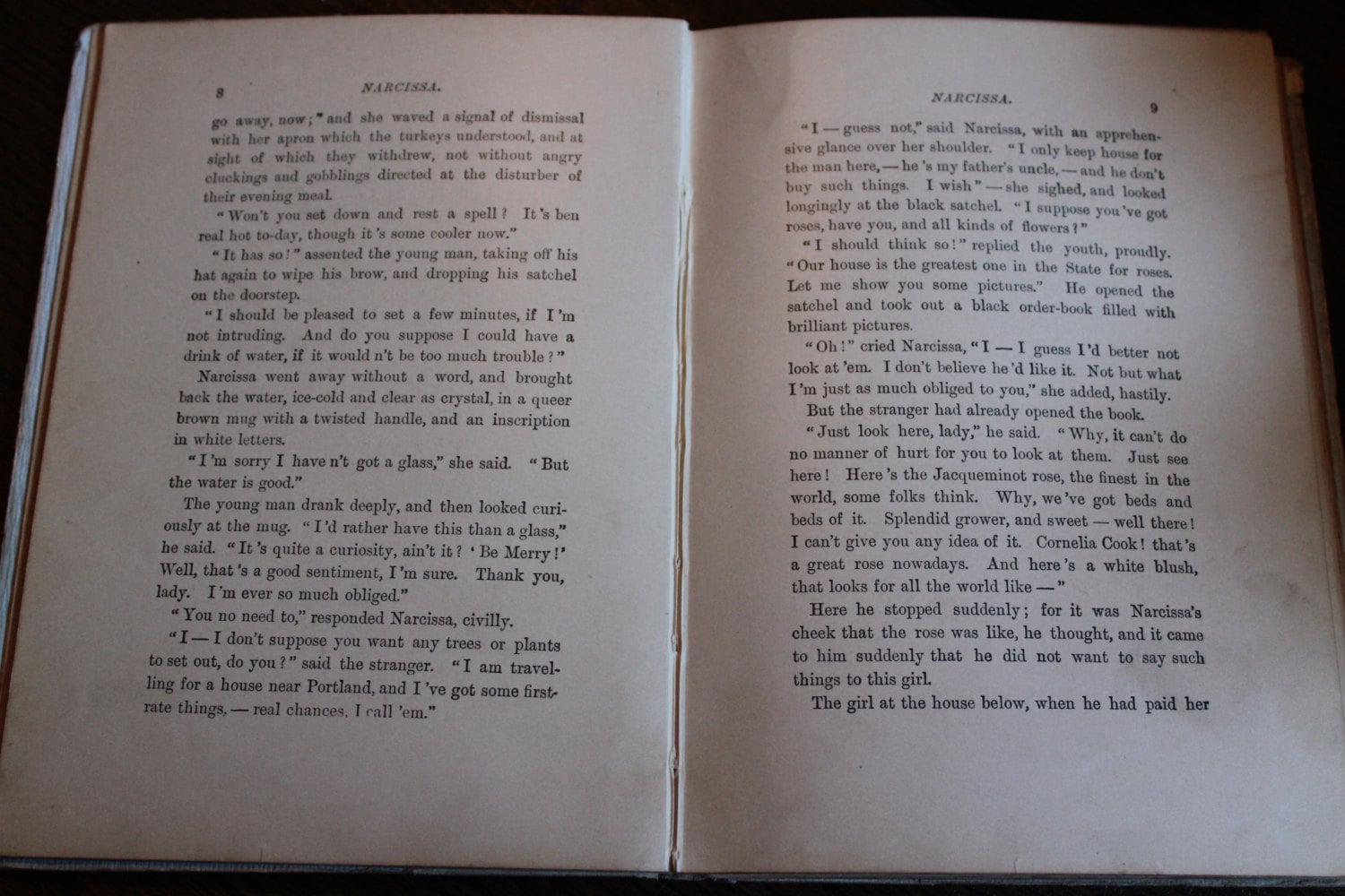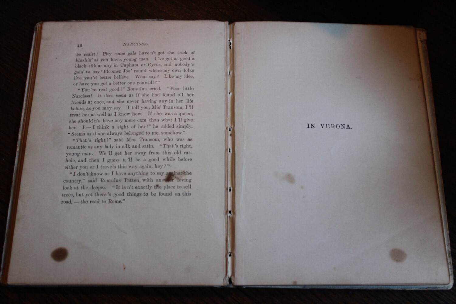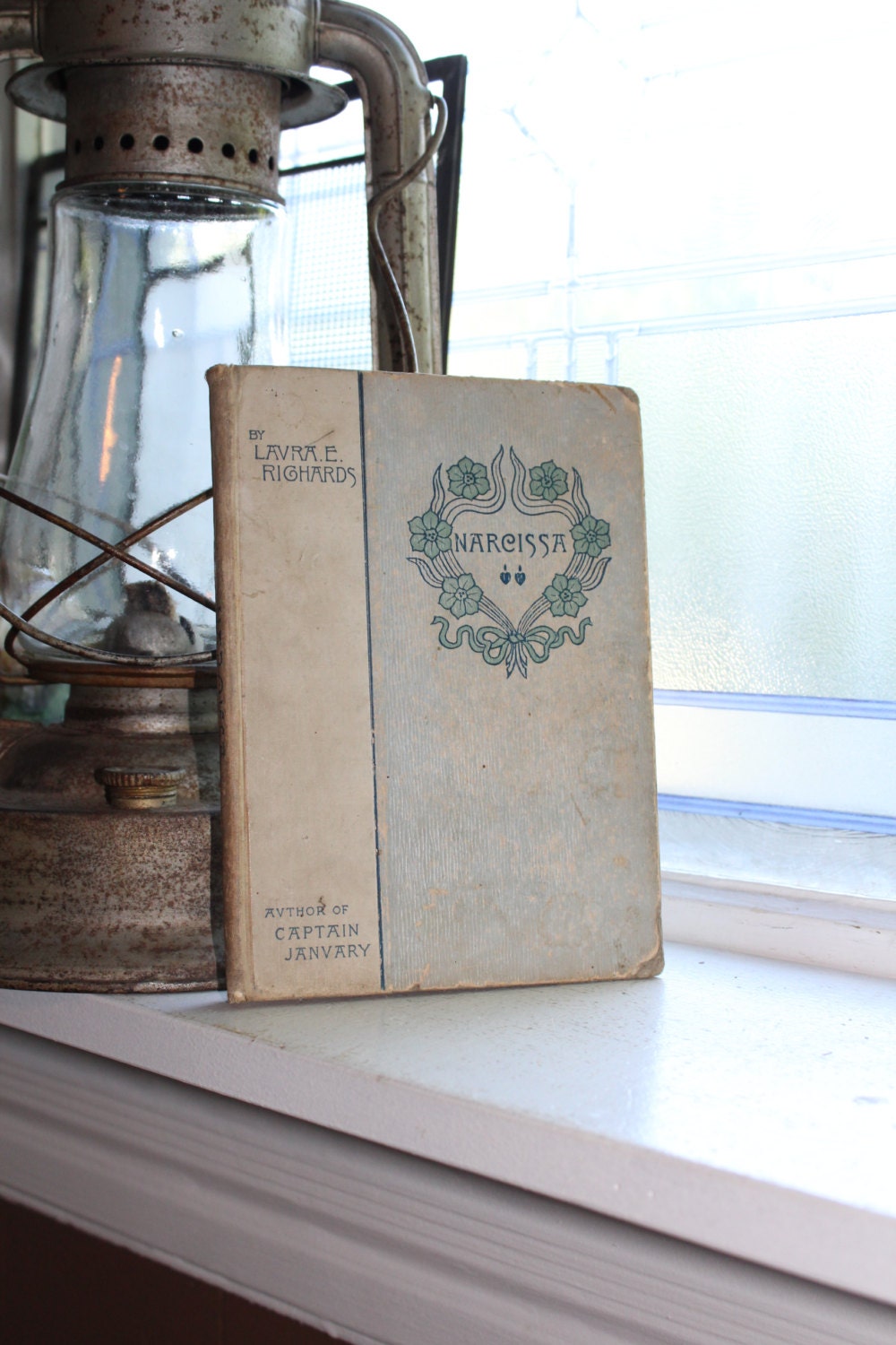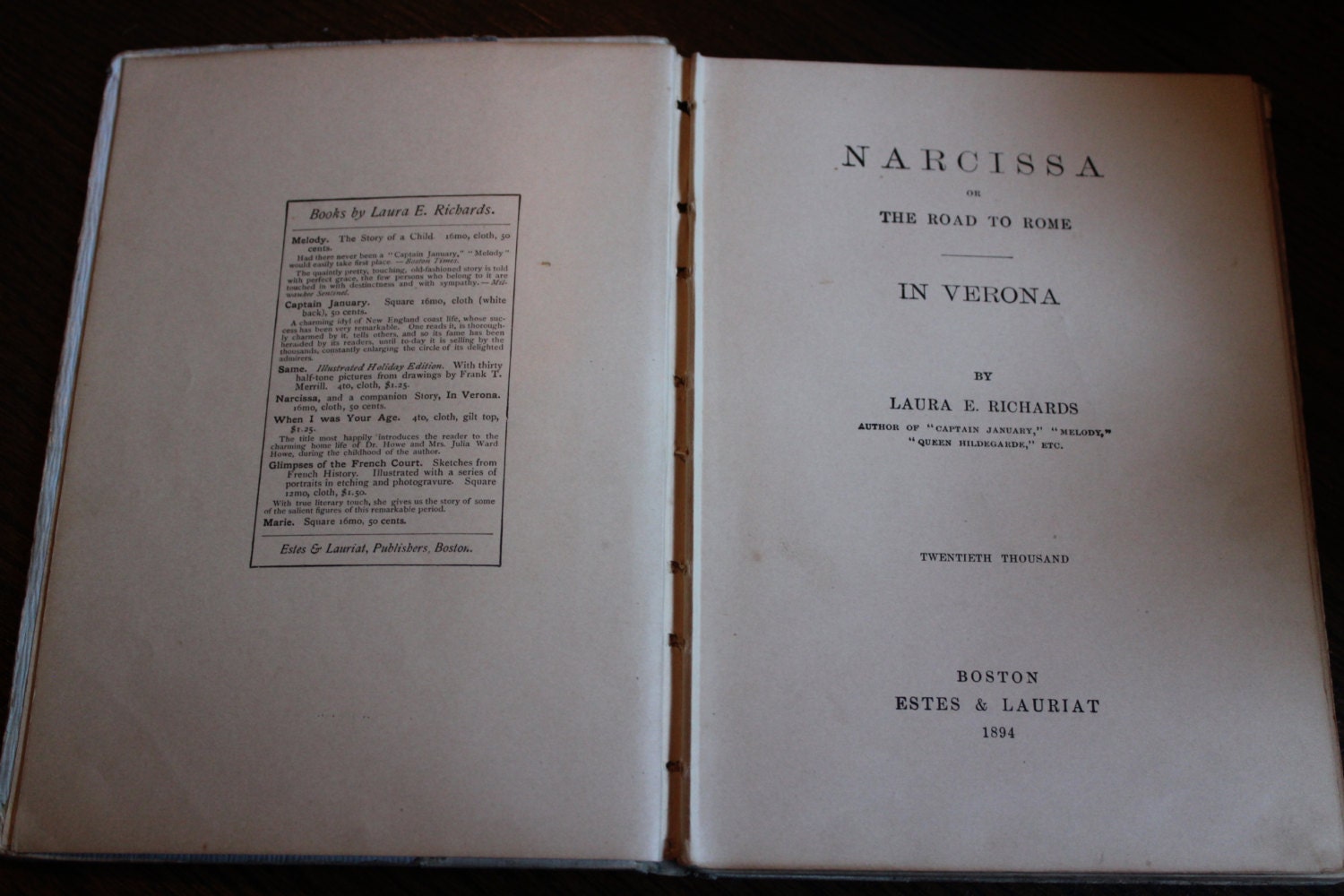 Antique 1894 book, Narcissa Or The Road To Rome, and Verona, by Laura E. Richards, in fair condition. This hardcover book measures 7 5/8" x 5 1/2" and has 80 pages. The cover shows some wear but still displays well, some pages show some staining, cover is slightly separated from pages but still secure. Enjoy!