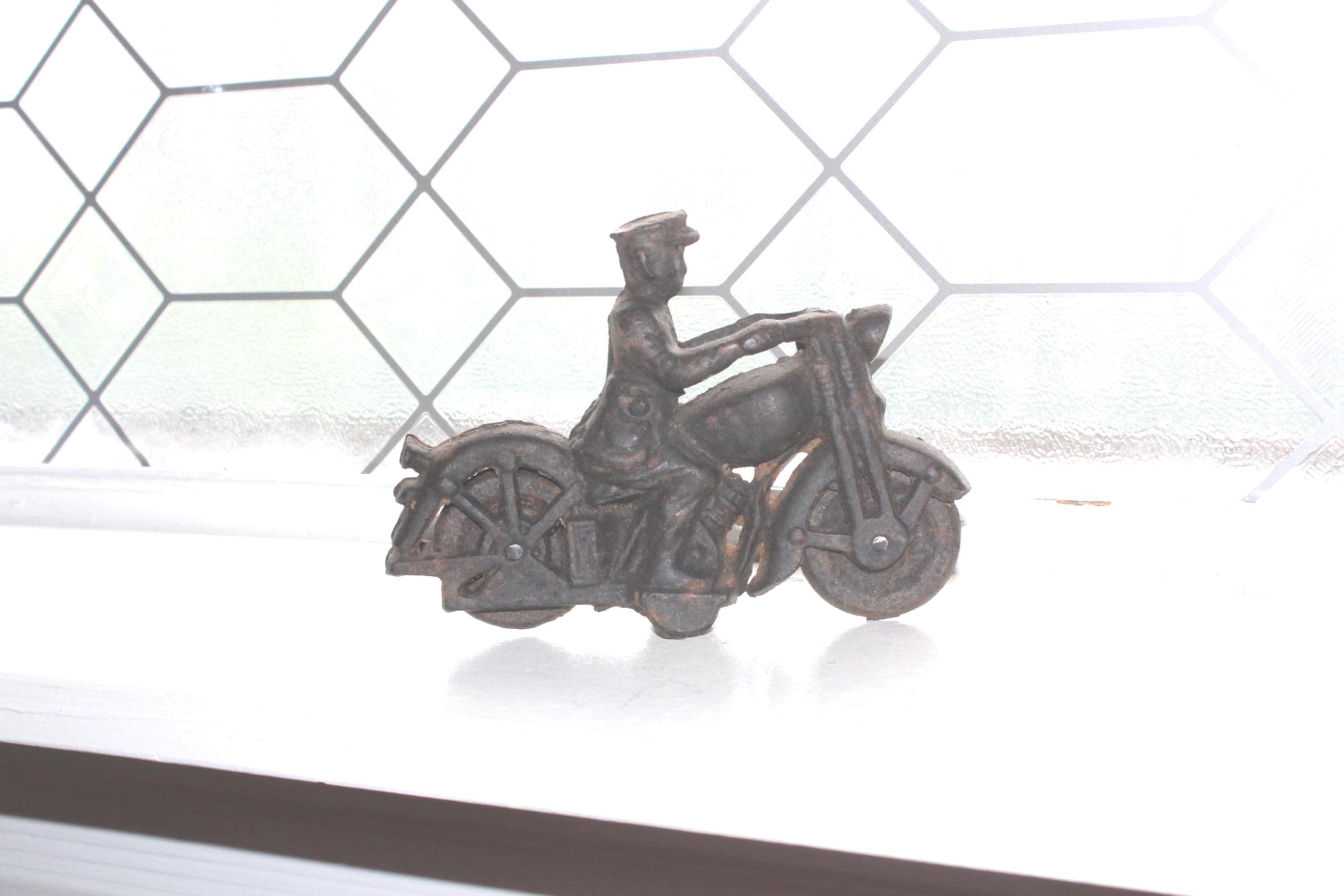 Vintage cast iron toy police motorcycle. It measures 6" long, condition as shown in the photos. Enjoy!