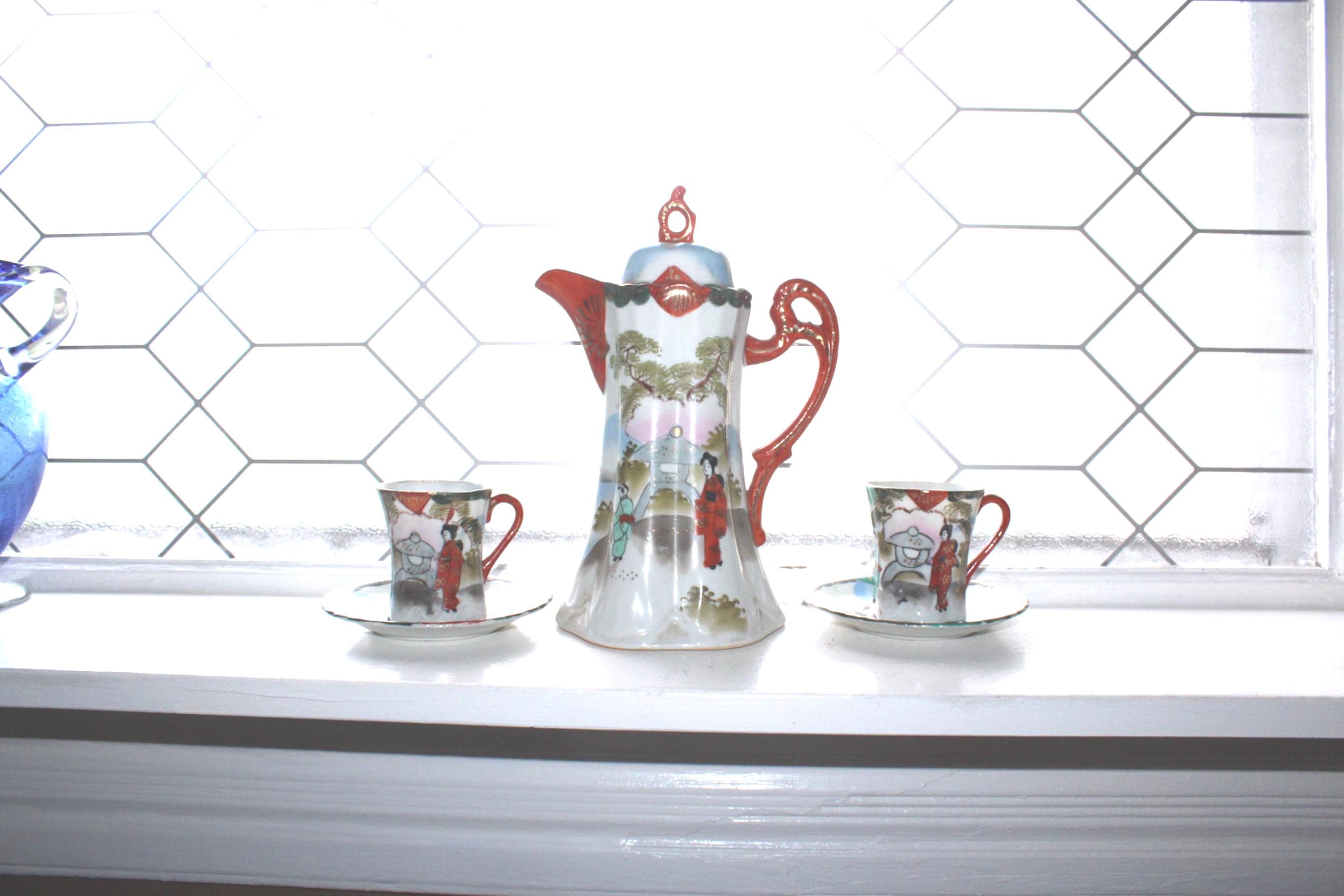 Gorgeous antique hand painted Japanese TT Takito porcelain Geisha ware chocolate pot with lid, 2 cups and 2 saucers, in excellent condition. No chips or cracks, stunning overall. The pot measures 9 1/2" high and each cup measures 3" high. Enjoy!